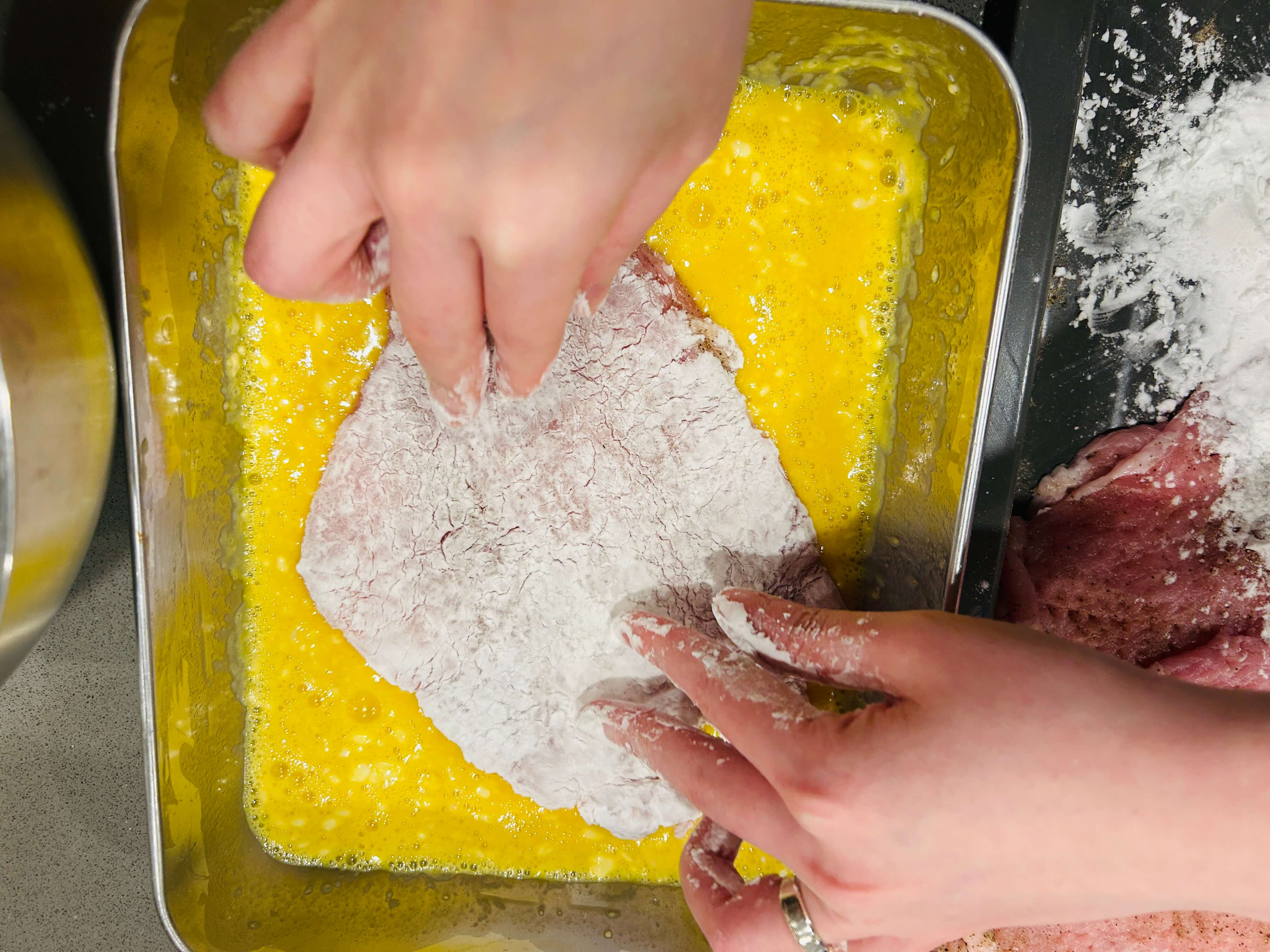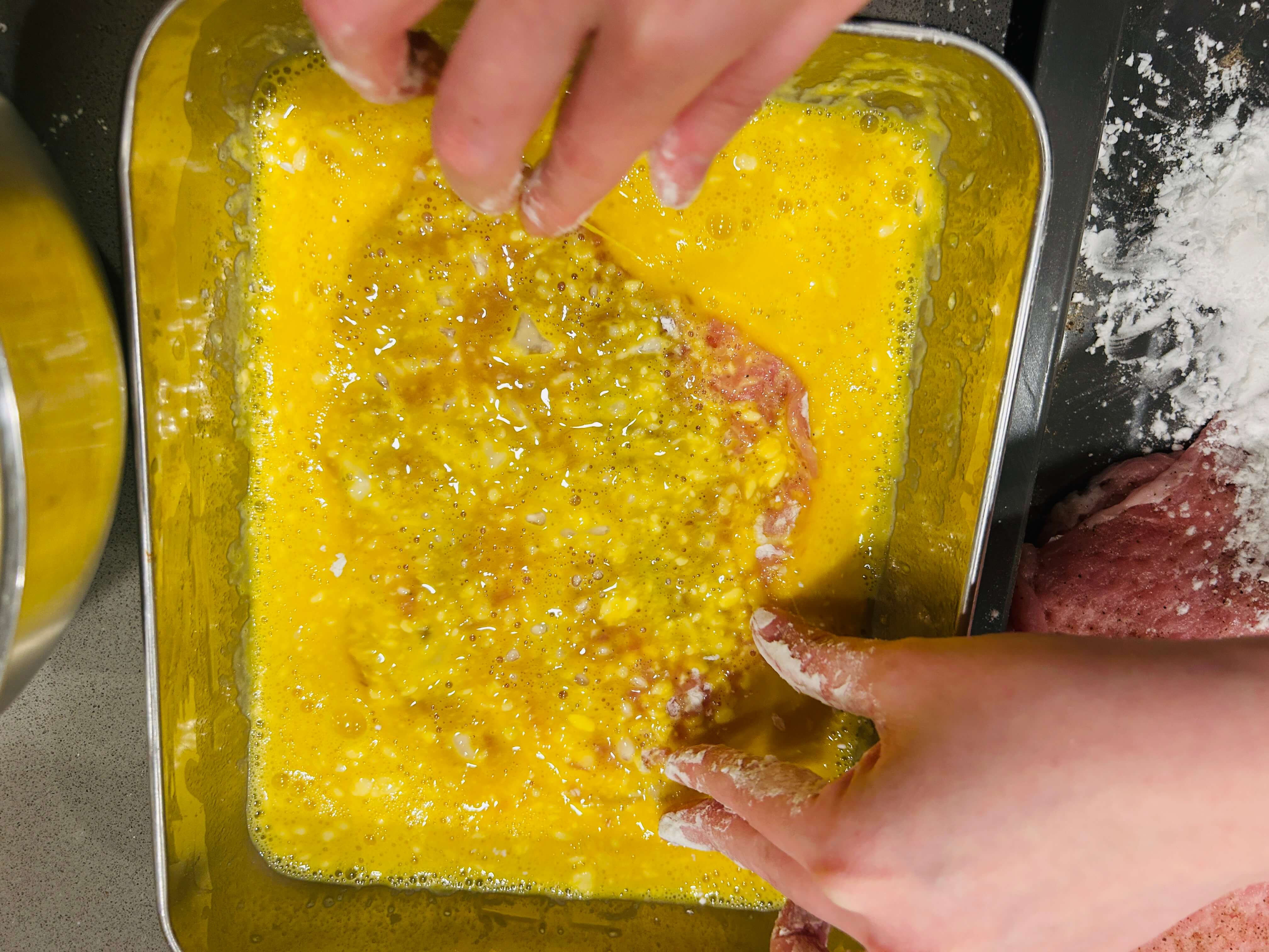10. 밀가루옷 입은 고기를 계란물에 담가줍니다.