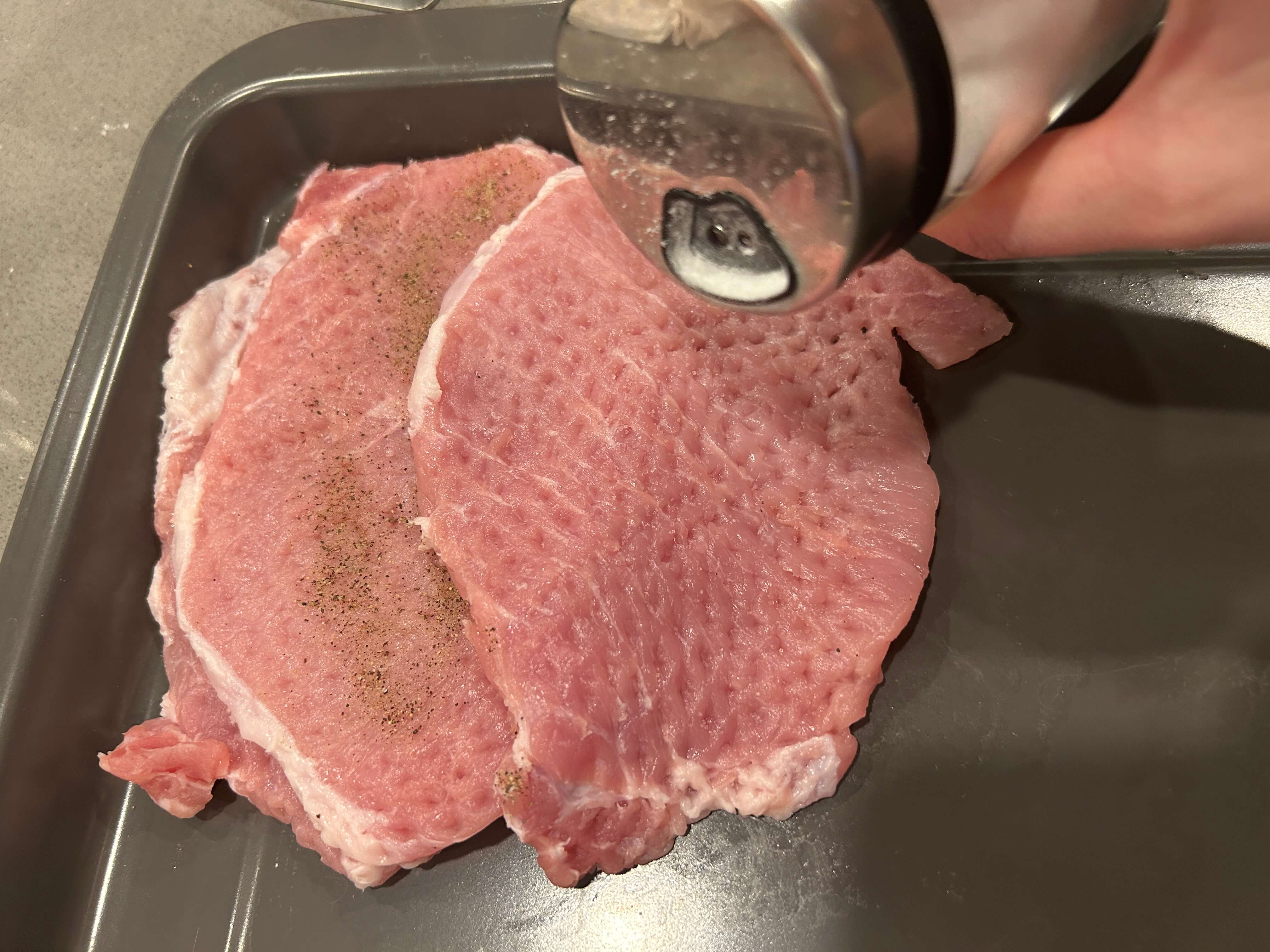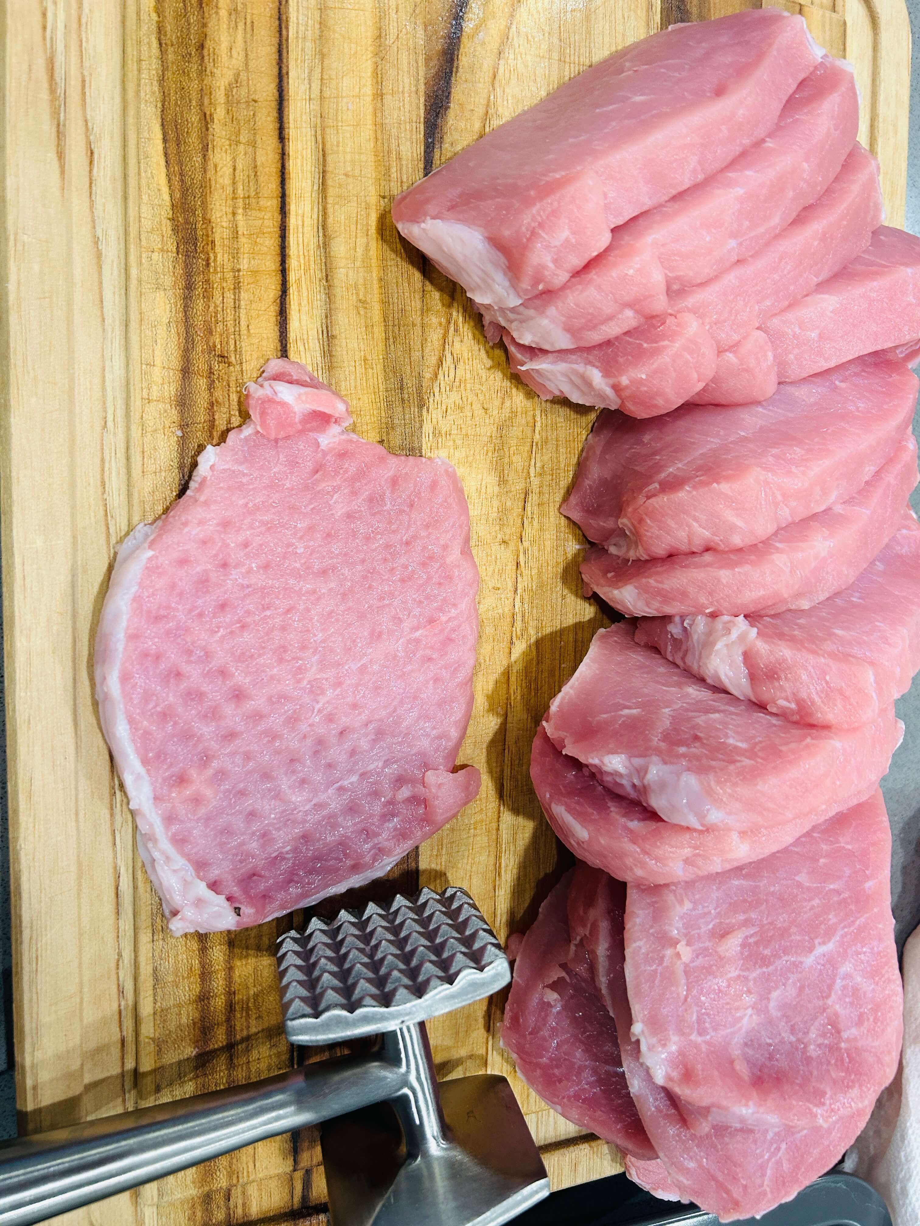 사실 돼지고기 안심은 이렇게 연육망치로 다지지않아고 부드러워서 손으로만 눌러줘도 충분합니다.
