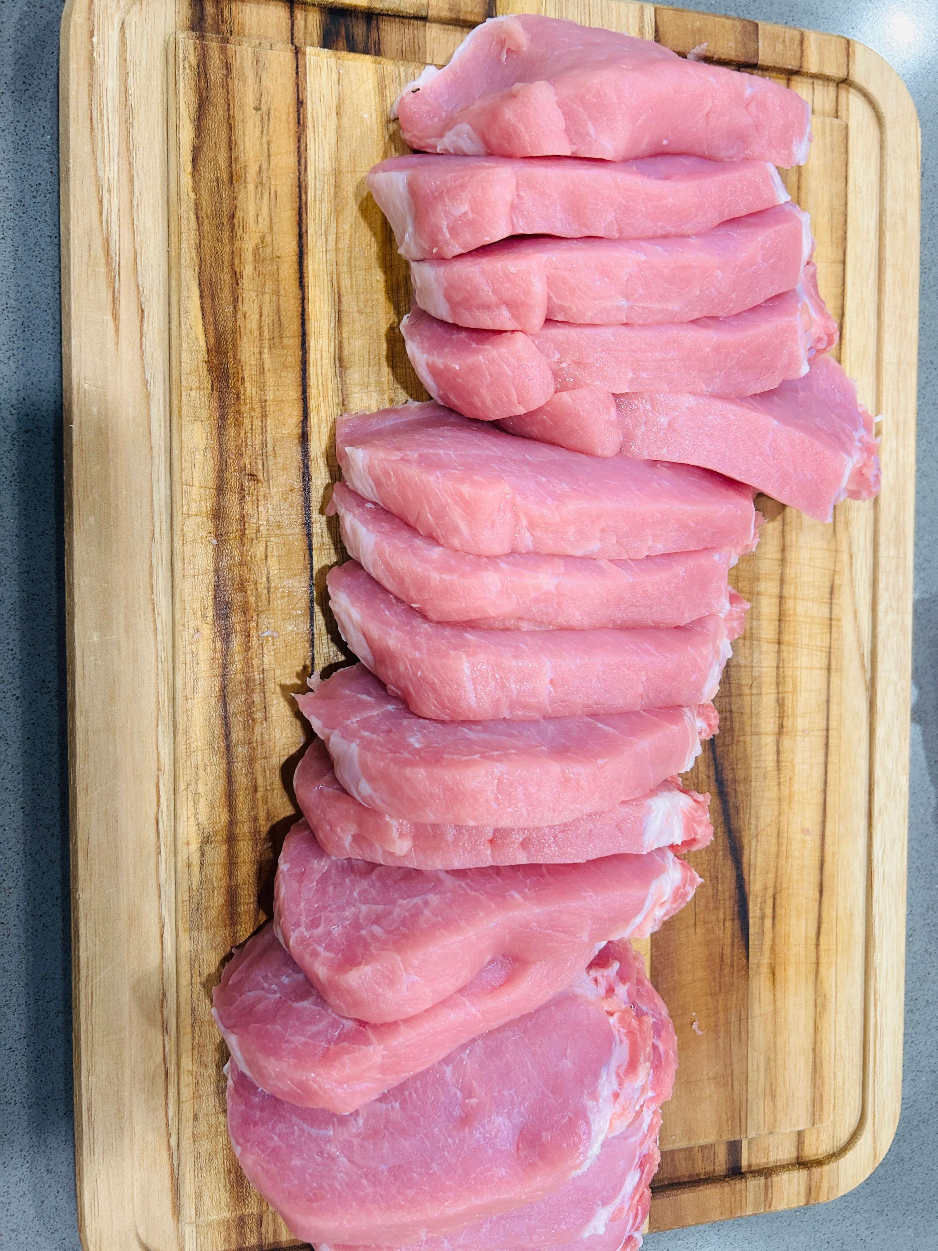 1. 돼지고기 안심을 선호하는 돈가스 두께로 잘라줍니다.