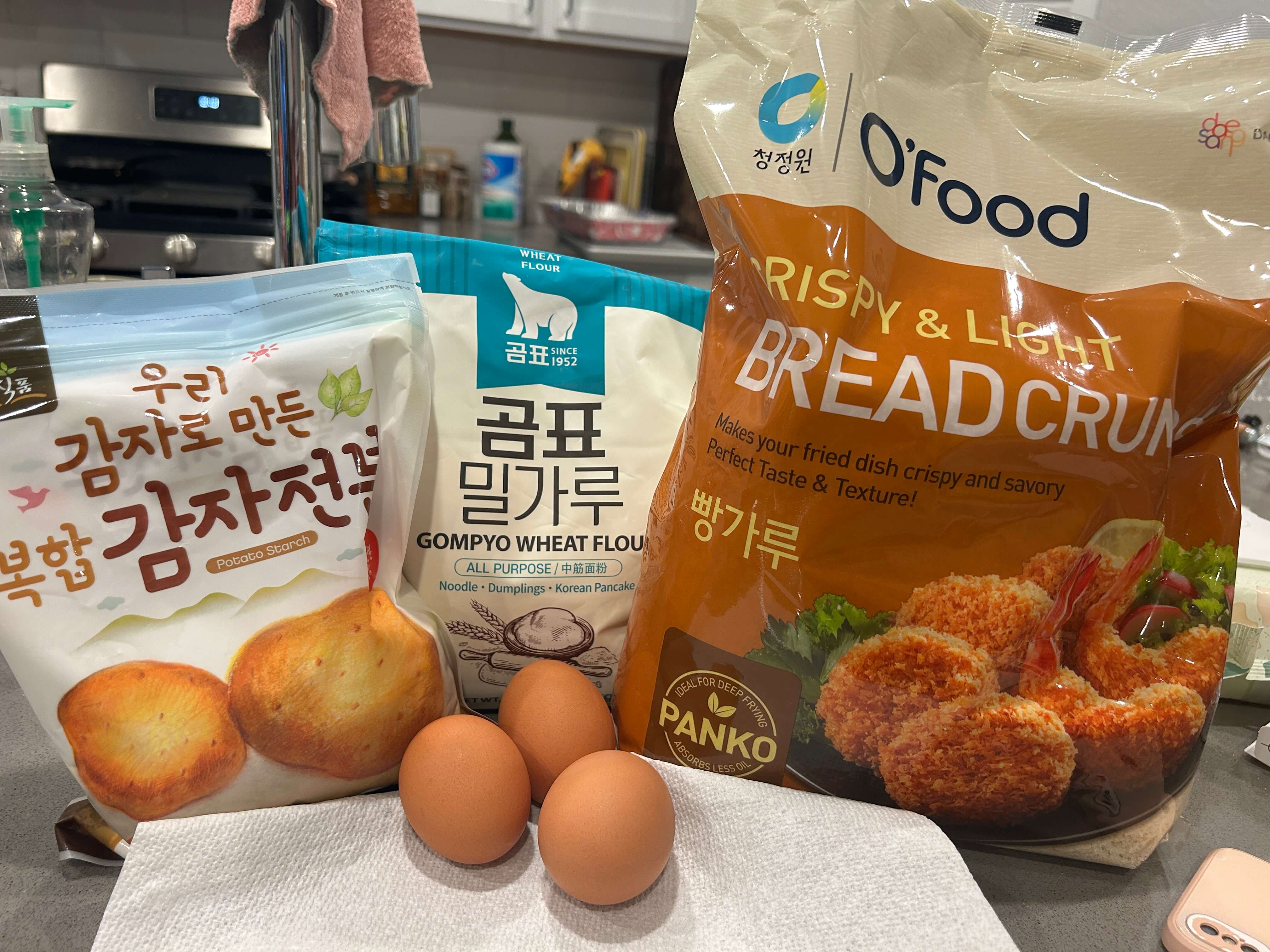 5. 감자전분, 계란, 밀가루, 빵가루를 준비해 줍니다.