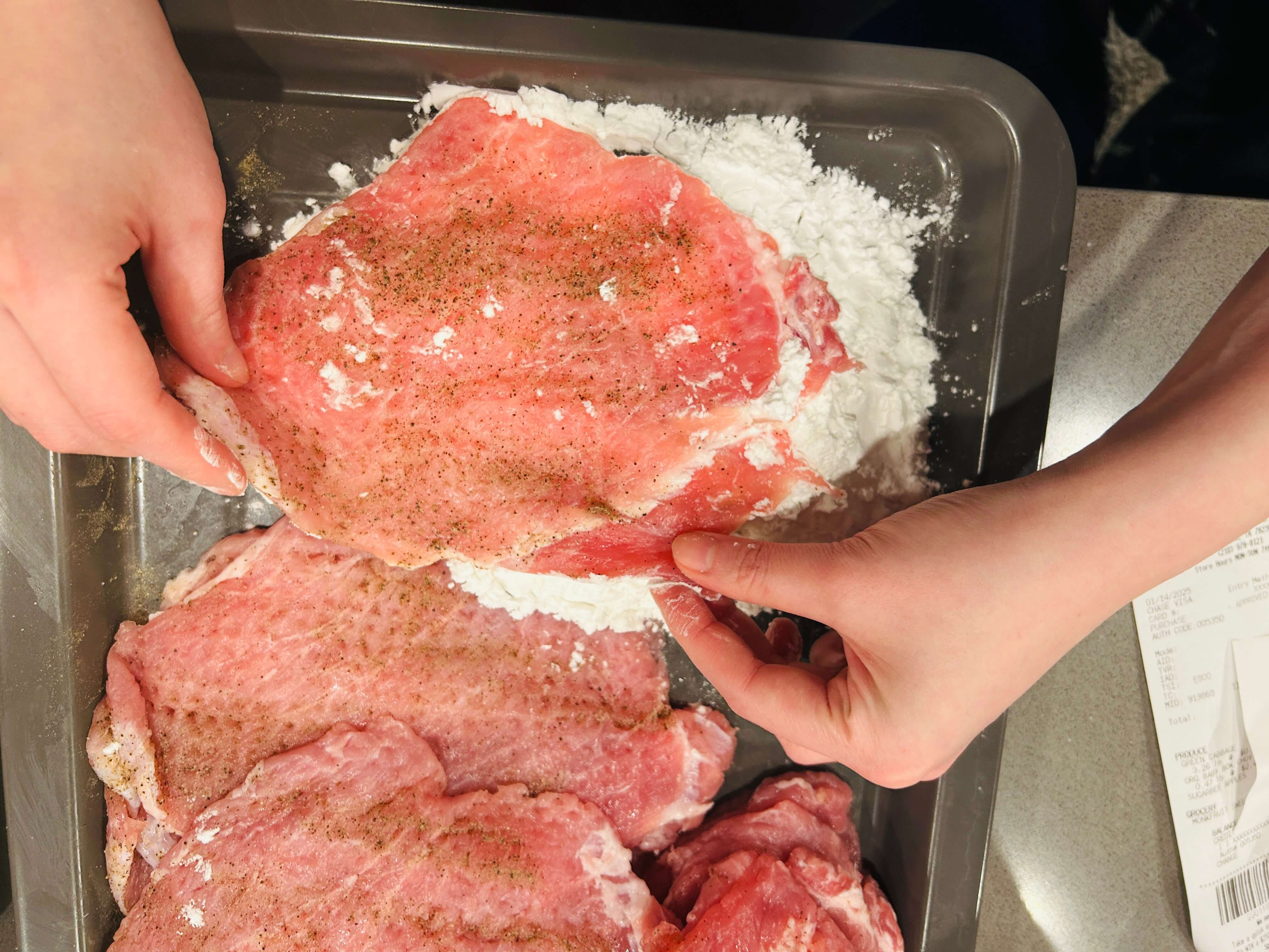 9. 밑간 한 고기 양면에 밀가루 옷을 입혀줍니다.