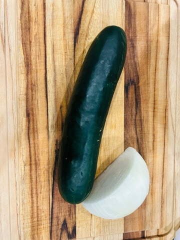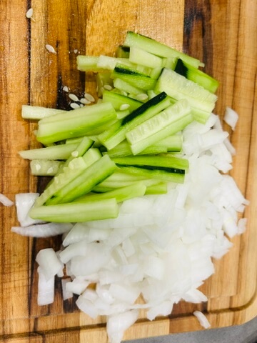 1. 오이와 양파를 잘게 썰어 준비해 줍니다. (원하시는 크기나 모양으로 잘라주셔도 됩니다.)
