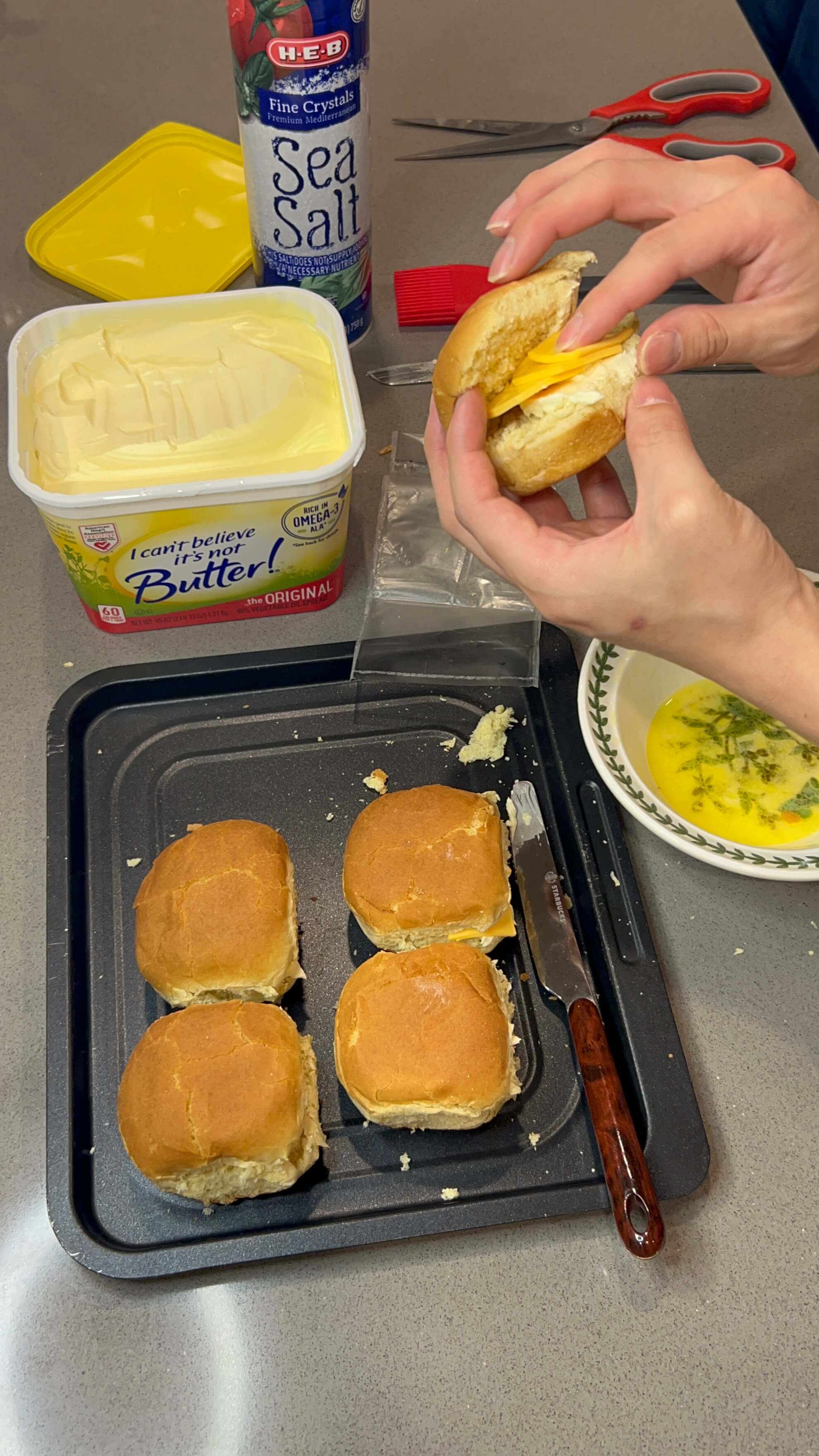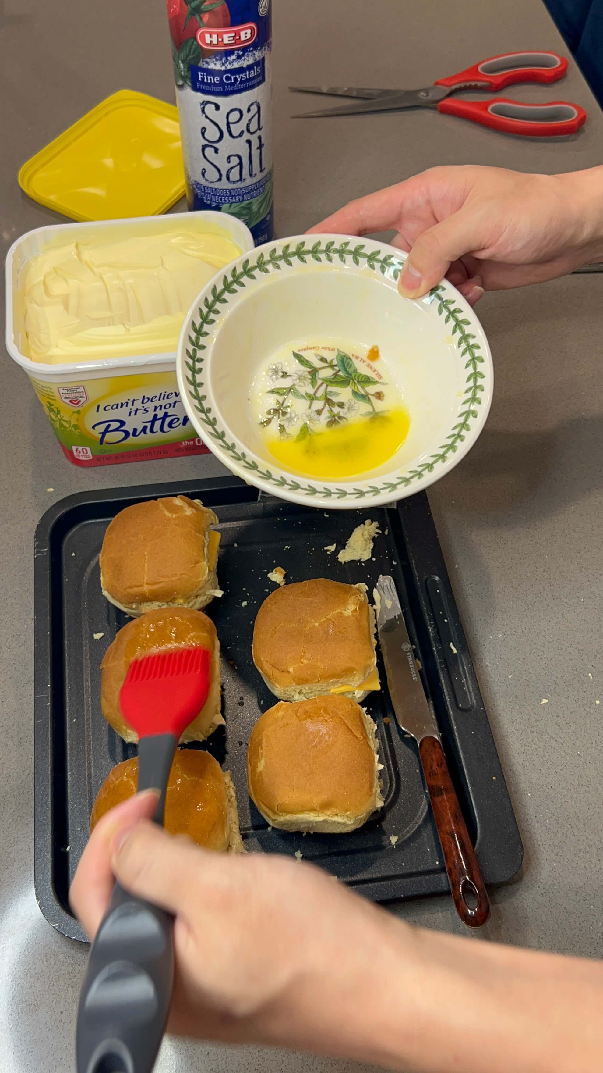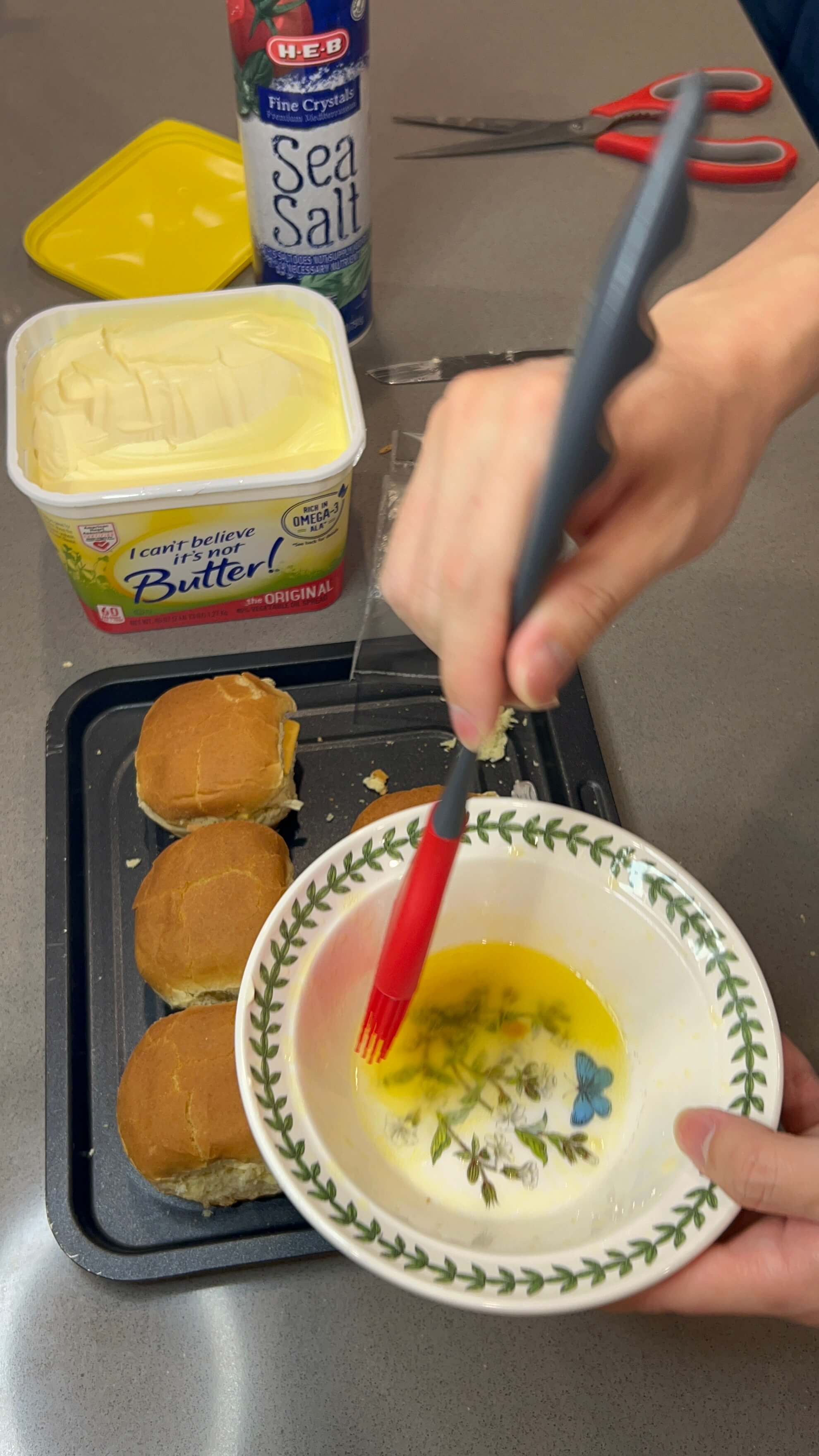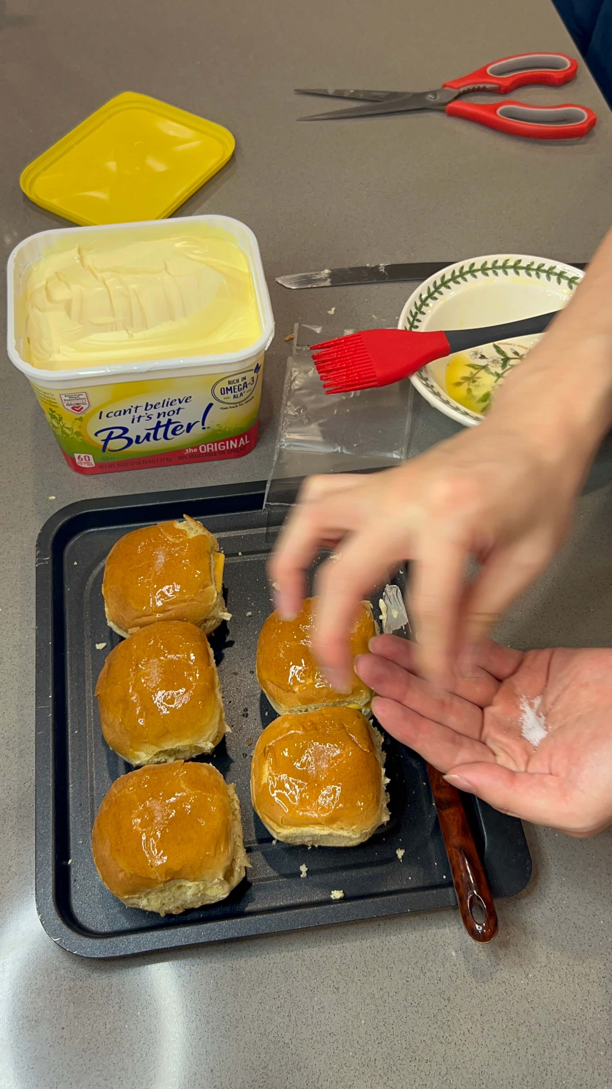 6. 녹인 버터를 모닝빵 위에 발라줍니다.
