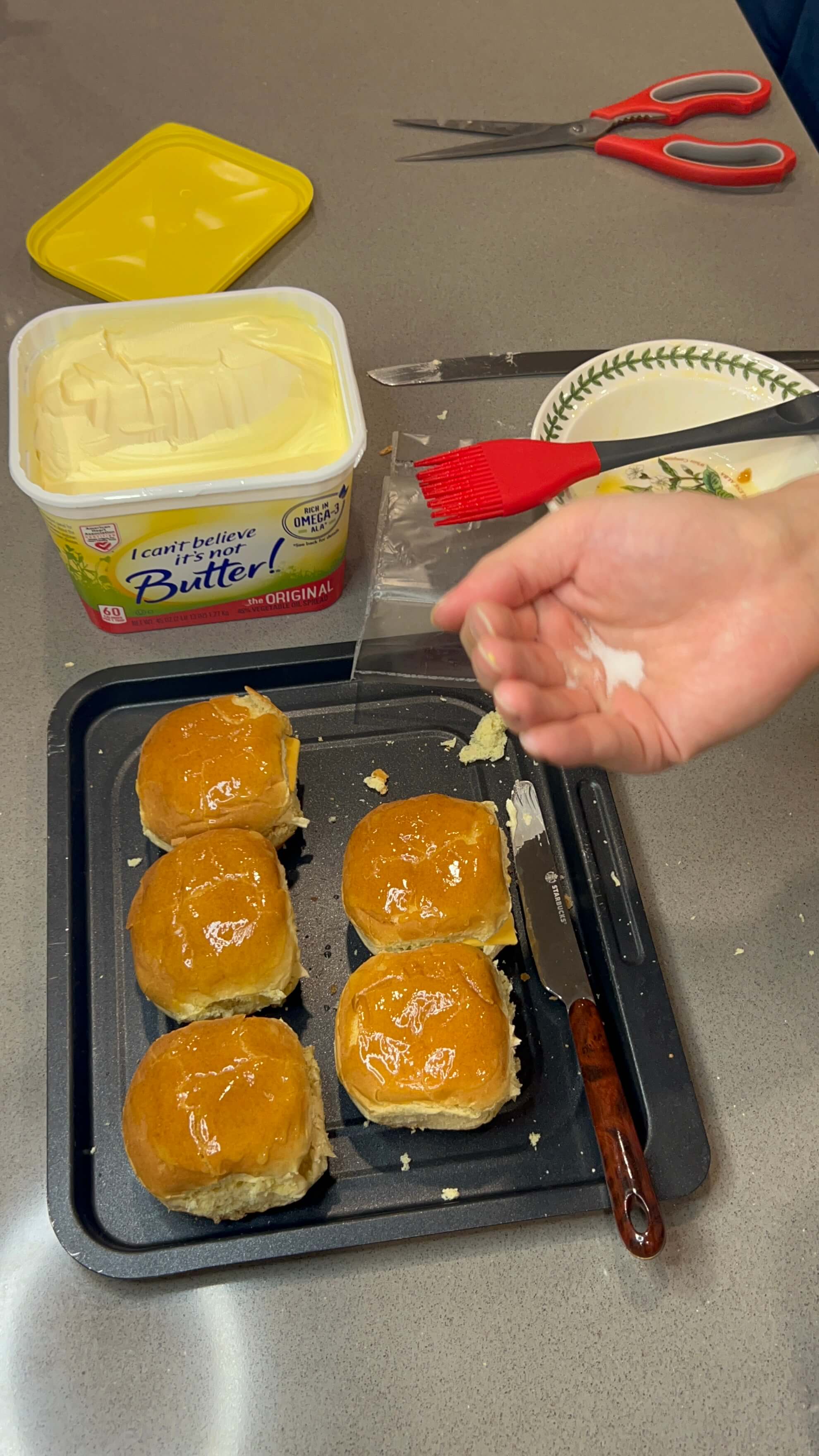 7. 버터 바른 모닝빵 위에 소금을 솔솔 뿌려줍니다.