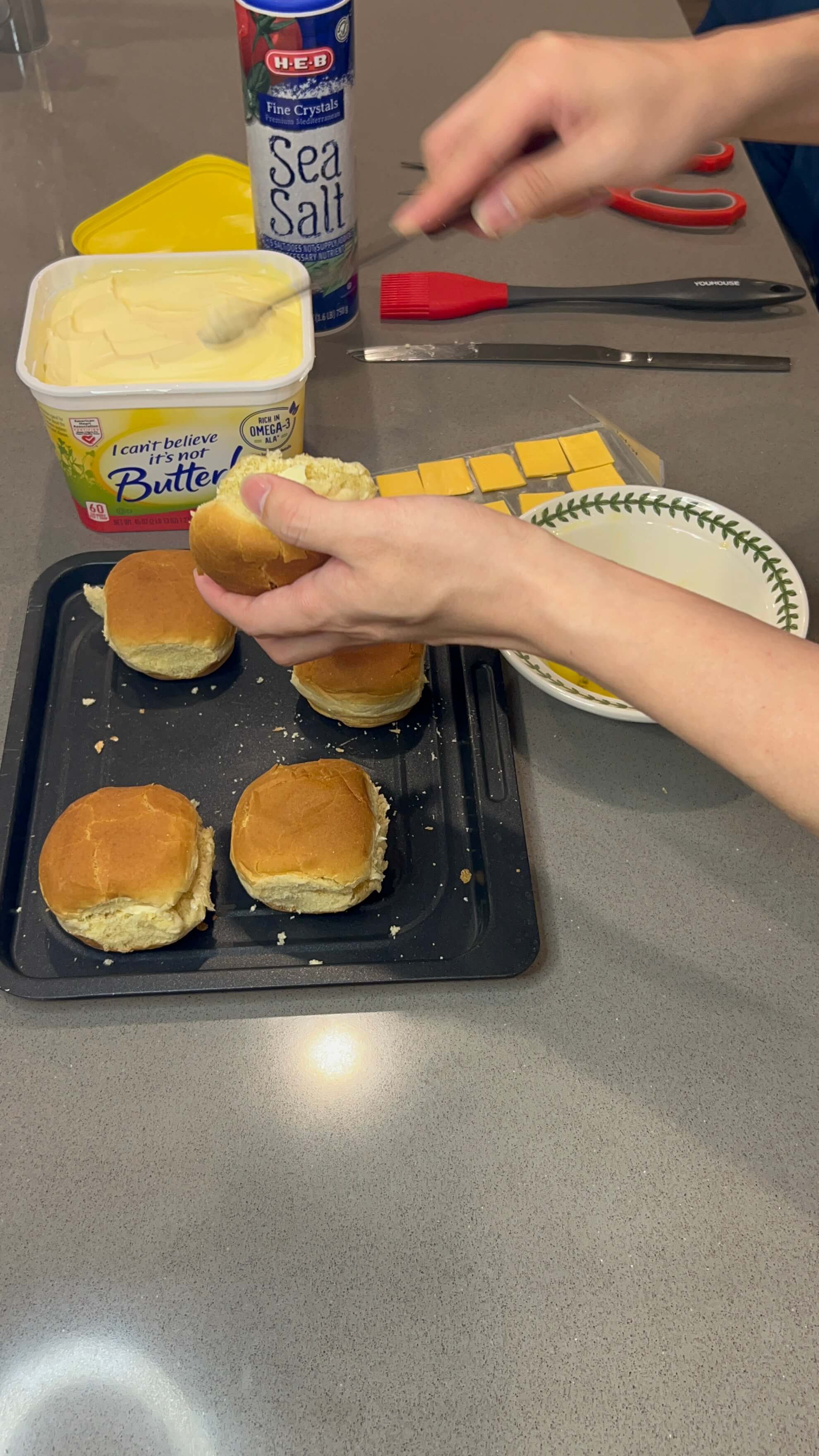 6. 녹인 버터를 모닝빵 위에 발라줍니다.