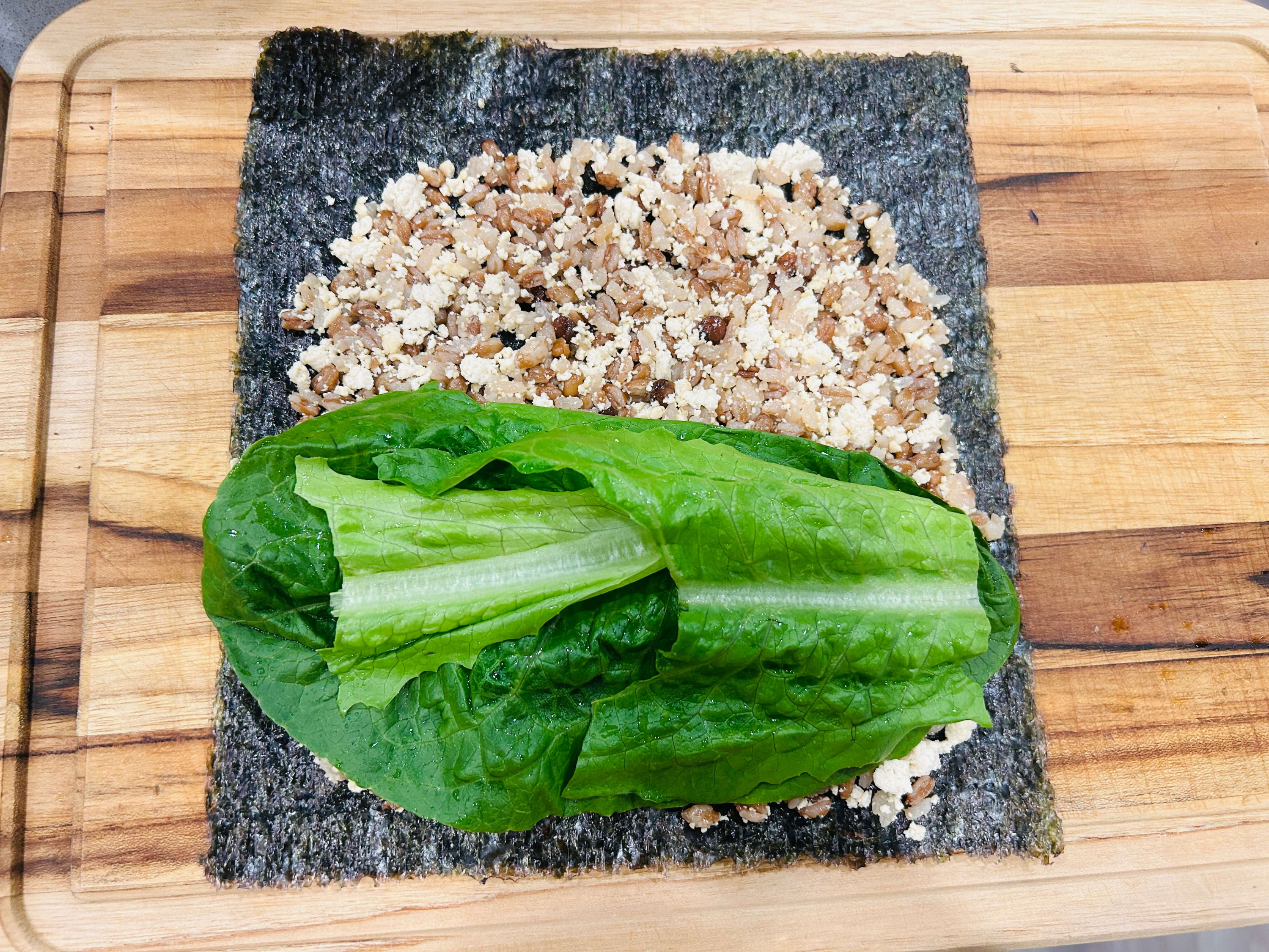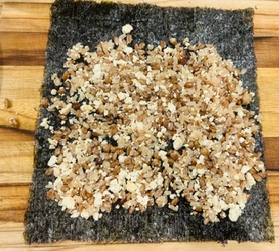 10. 김밥김에 두부밥을 얇게 깔아줍니다.