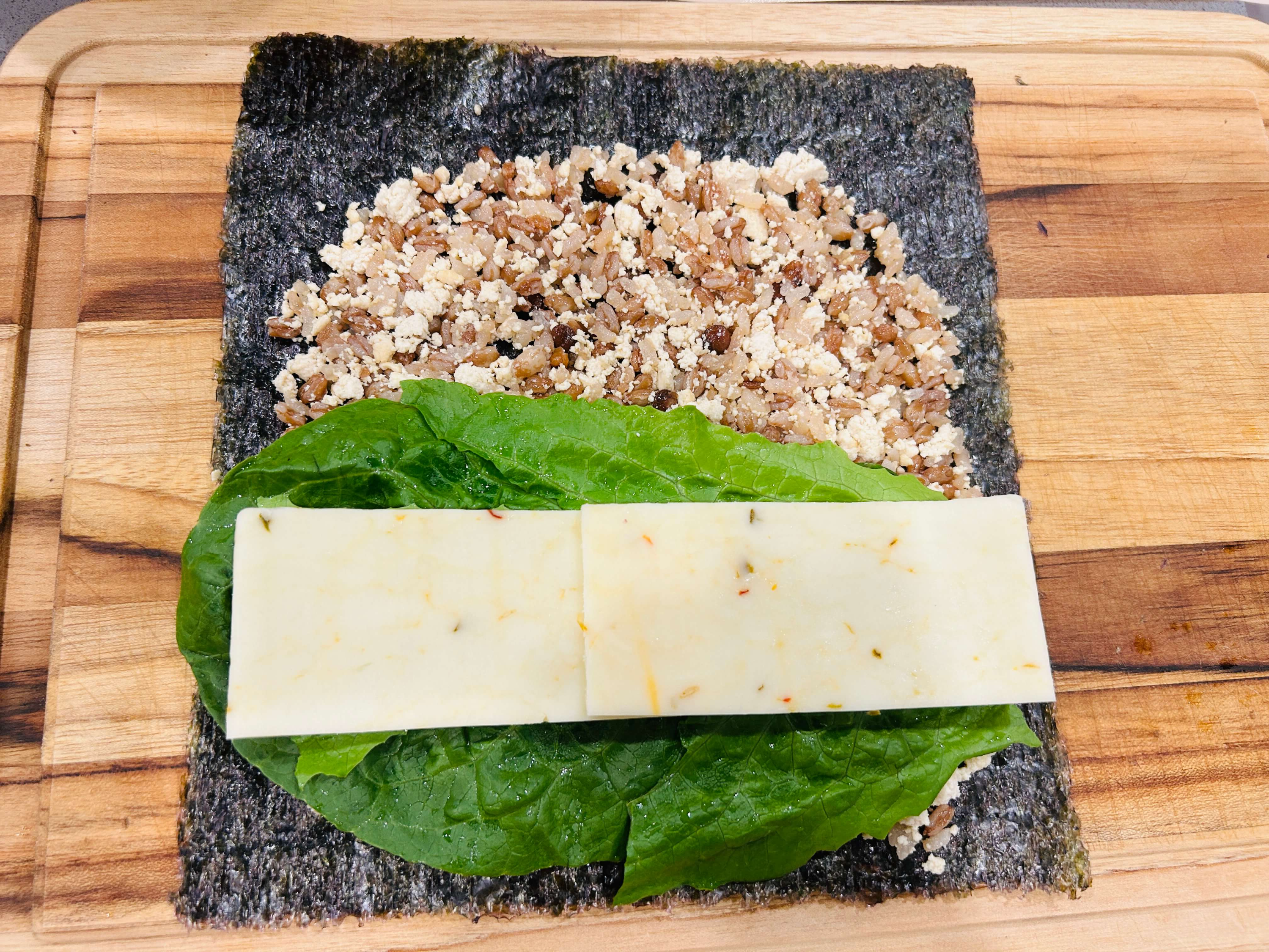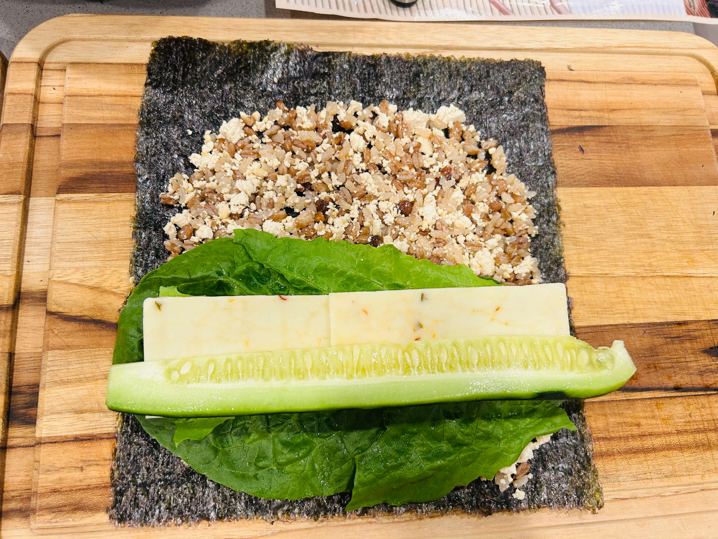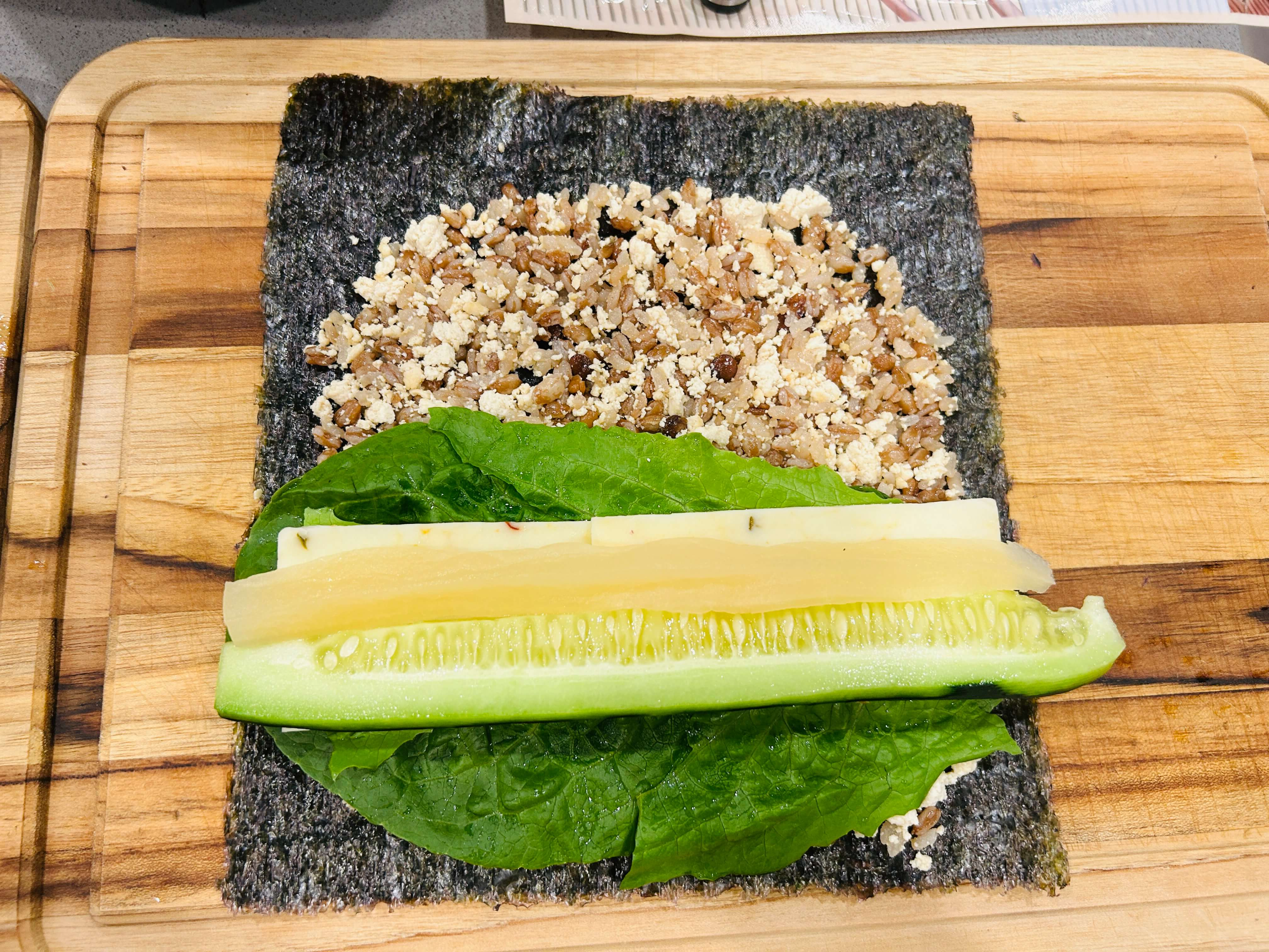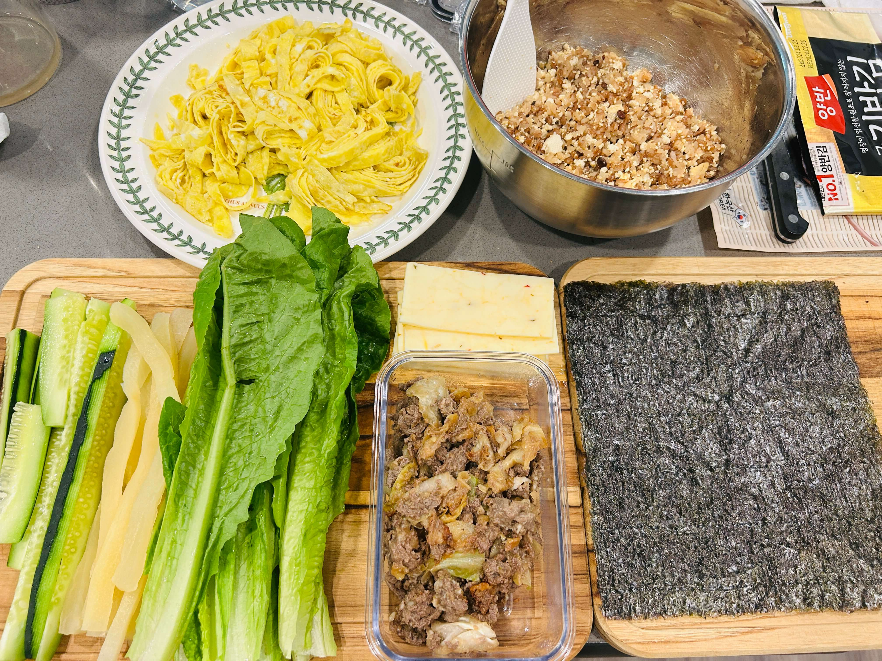 9. 김밥 속재료로, 상추, 치즈, 오이, 단무지, 밥, 지단, 김밥김을 준비합니다.