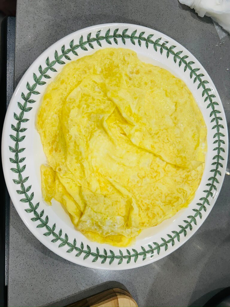 7. 프라이팬에 얇게 계란물을 올려 지단을 만들어줍니다.