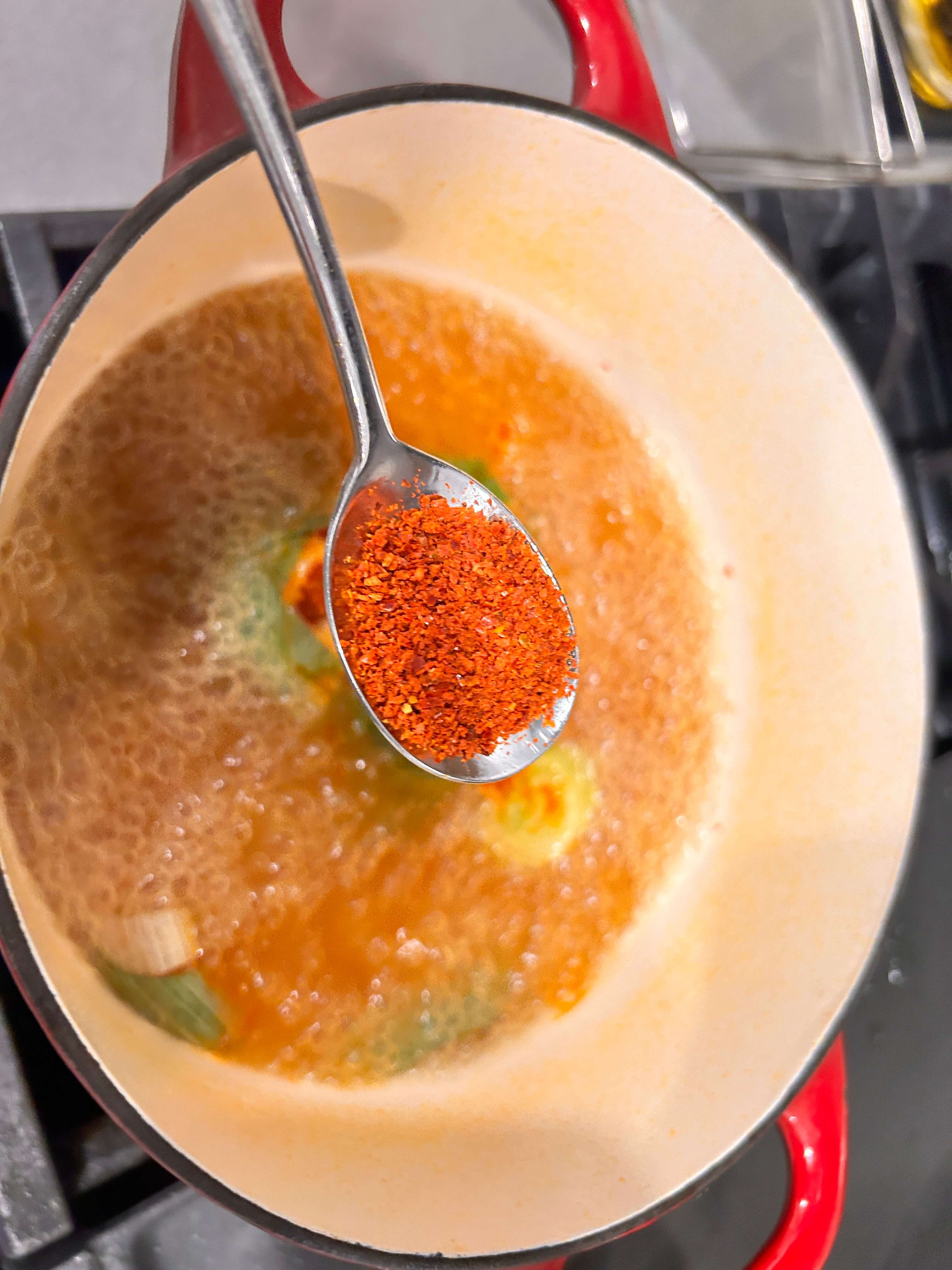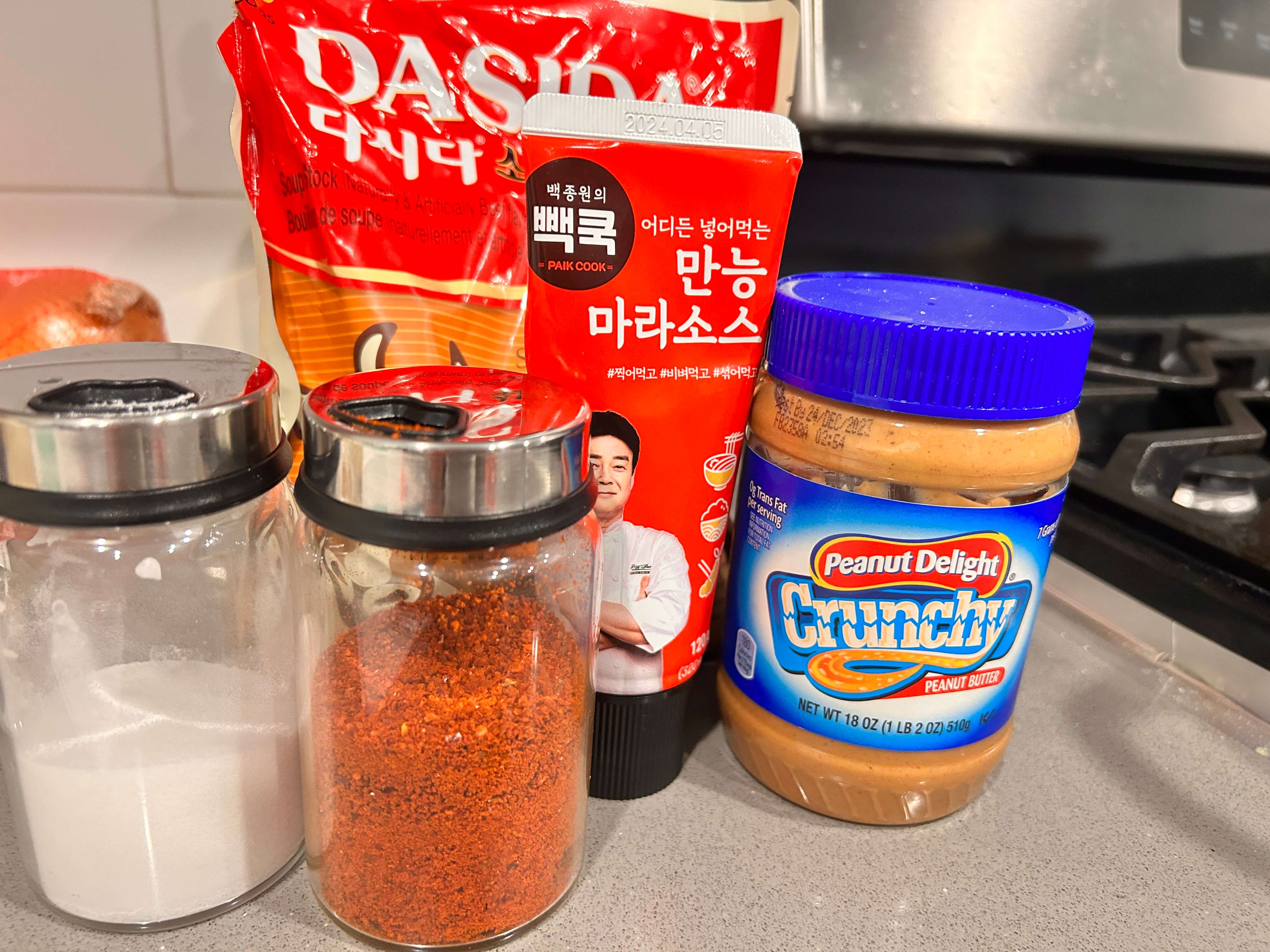 4. 마라소스 한숟갈, 설탕 한 숟갈, 다시다 한 숟갈, 고춧가루 한 숟갈, 땅콩버터 한 숟갈을 넣어줍니다.