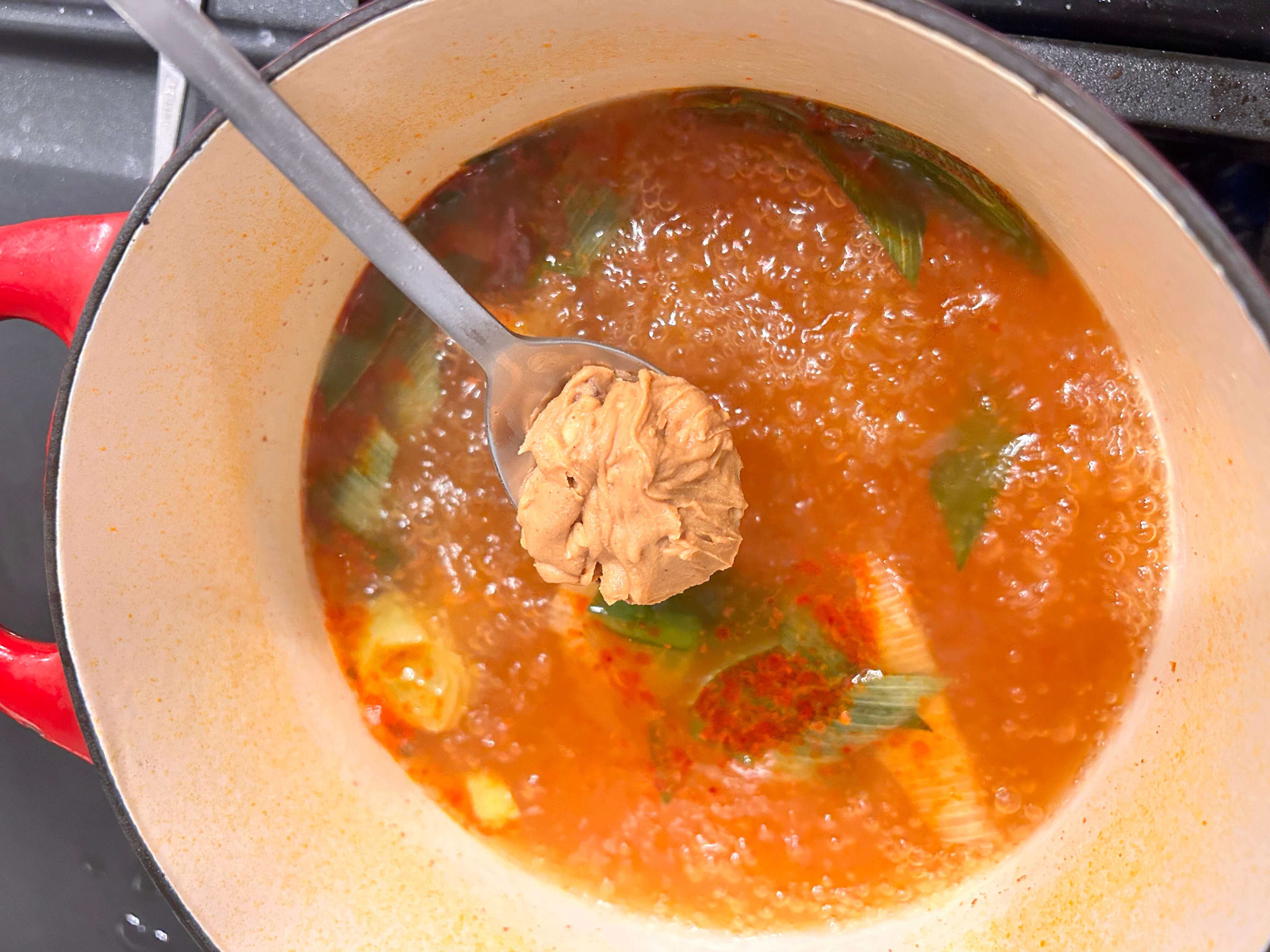 4. 마라소스 한 숟갈, 설탕 한숟갈, 다시다 한숟갈, 고춧가루 한숟갈, 땅콩버터 한 숟갈을 넣어줍니다.