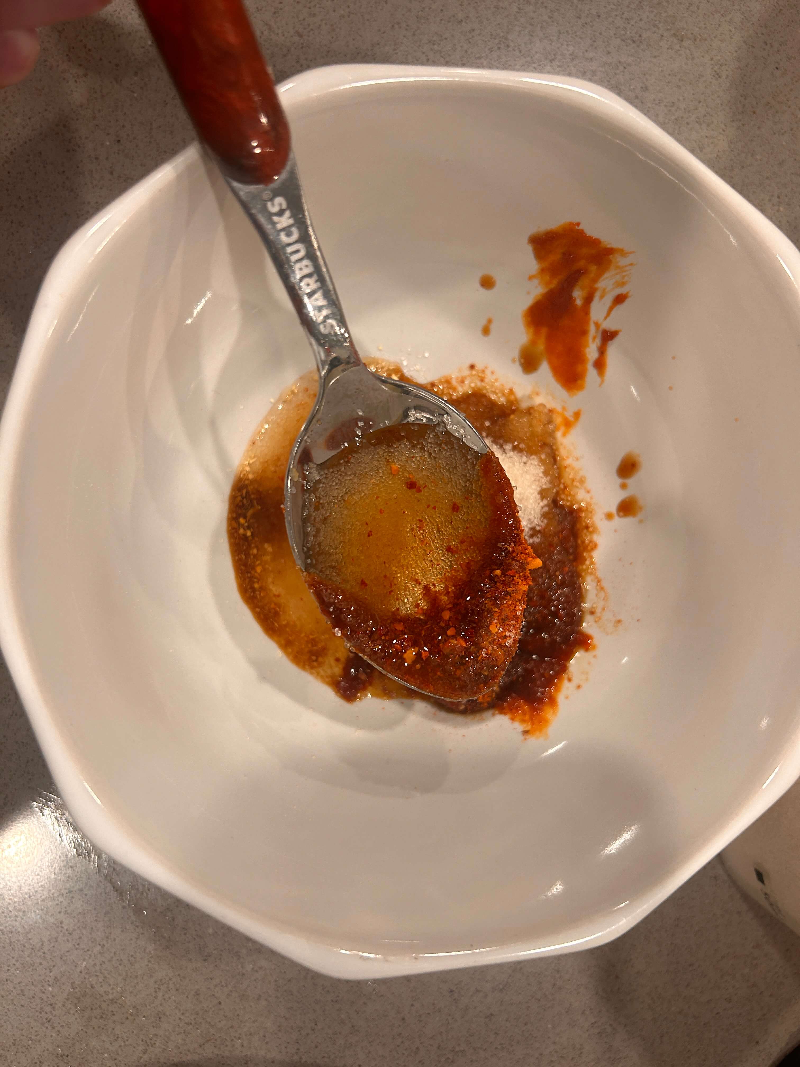 8. 다진 마늘, 고추장 1, 고춧가루 0.5, 간장 1, 설탕 1, 맛술 1, 올리고당 1, 물 1 숟갈을 넣고 잘 섞어 준비해 줍니다.