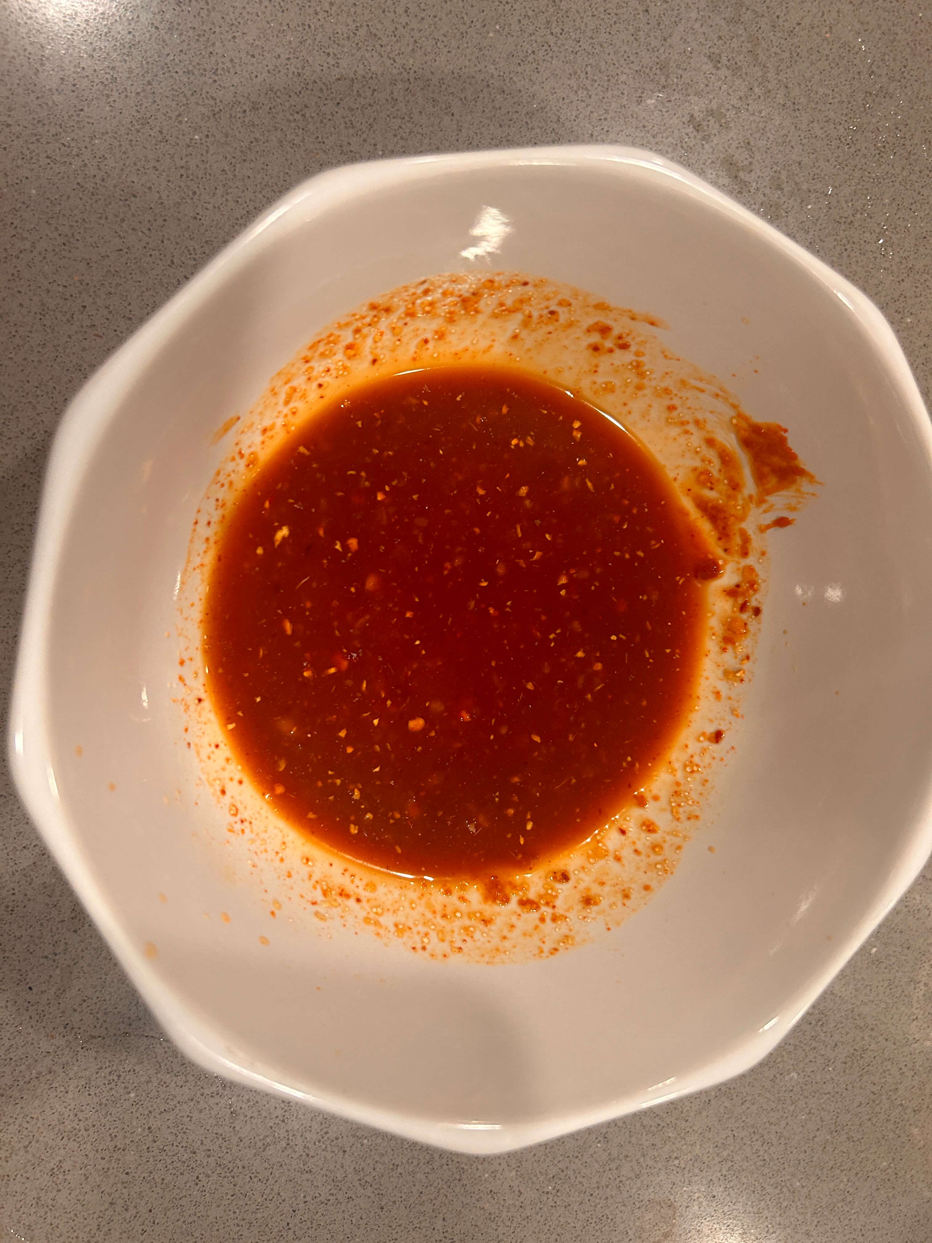 8. 다진 마늘, 고추장 1, 고춧가루 0.5, 간장 1, 설탕 1, 맛술 1, 올리고당 1, 물 1 숟갈을 넣고 잘 섞어 준비해 줍니다.