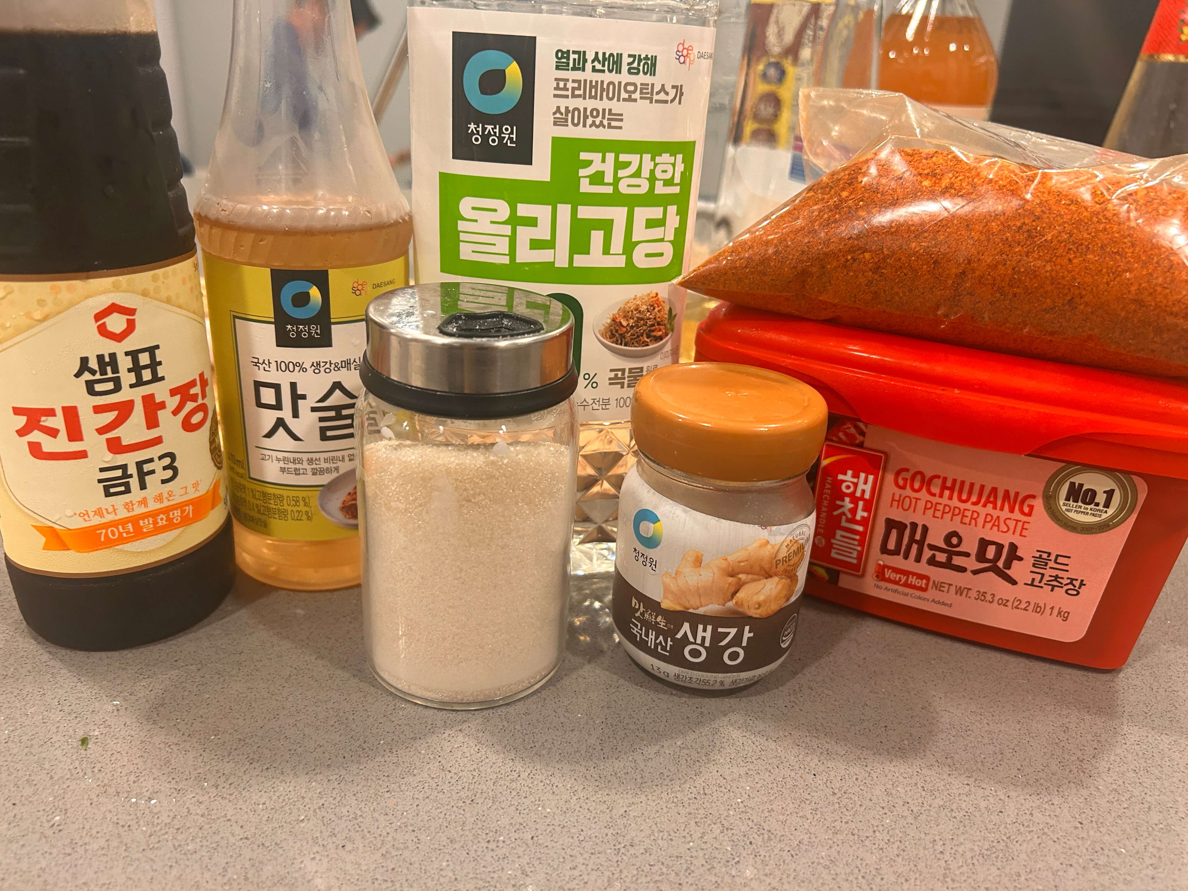 다진 마늘, 생강, 설탕, 올리고당, 맛술, 간장, 고추장, 고춧가루