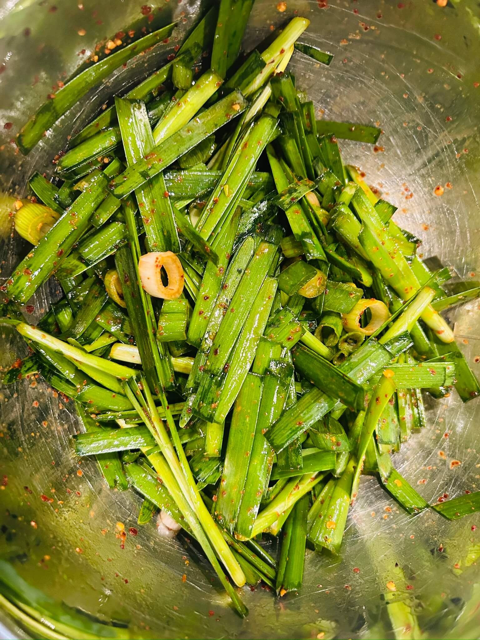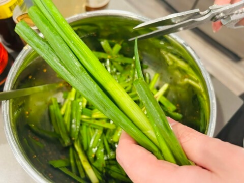 5. 파를 종종 썰어 부추에 넣어 같이 잘 버무려 줍니다.