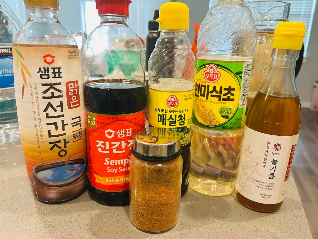 3. 소스로 국간장, 진간장, 매실청, 식초, 들기름, 고춧가루를 준비해 줍니다.