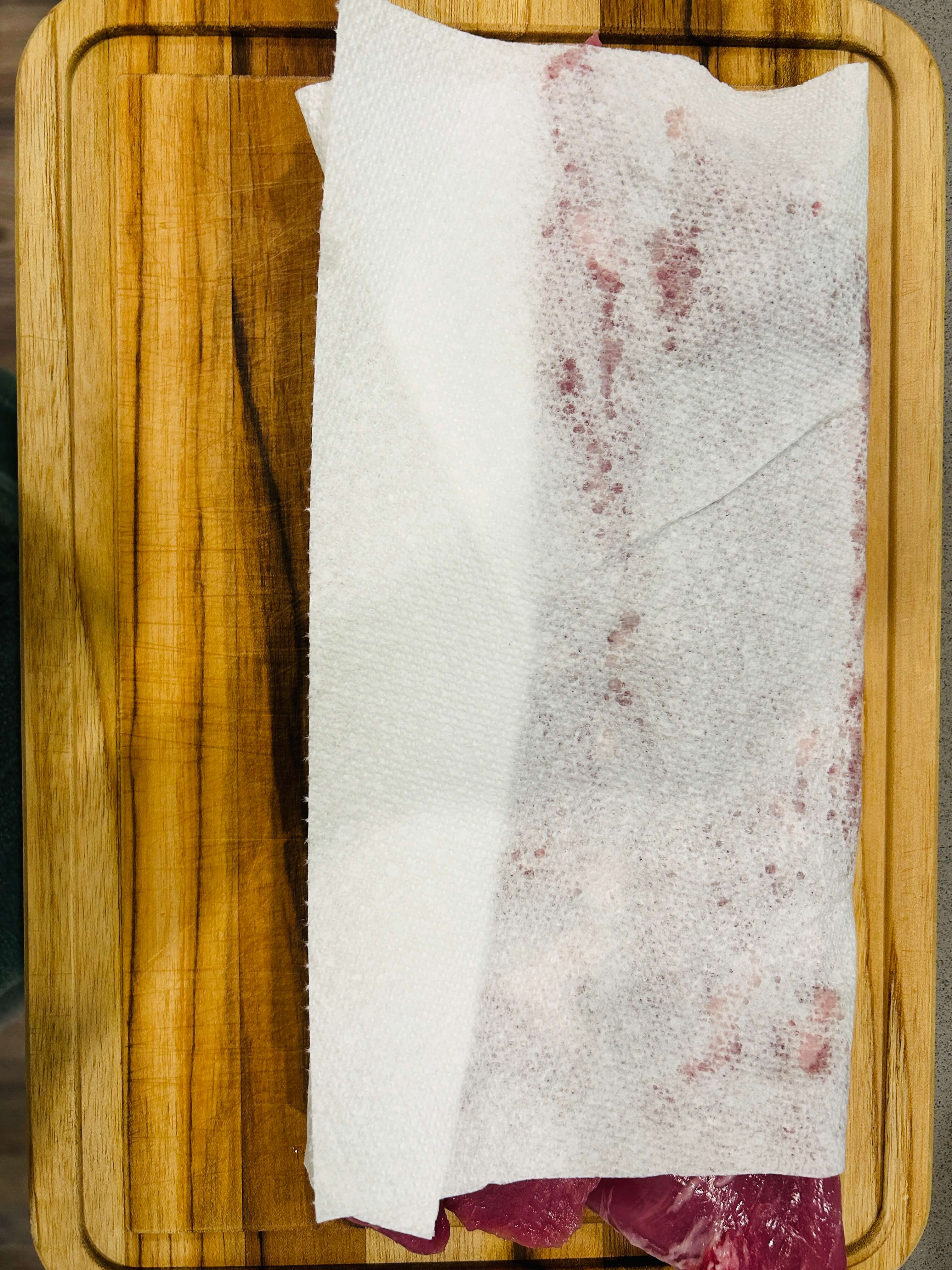 1. 돼지 안심을 키친타월에 올려 핏기를 제거해 줍니다.