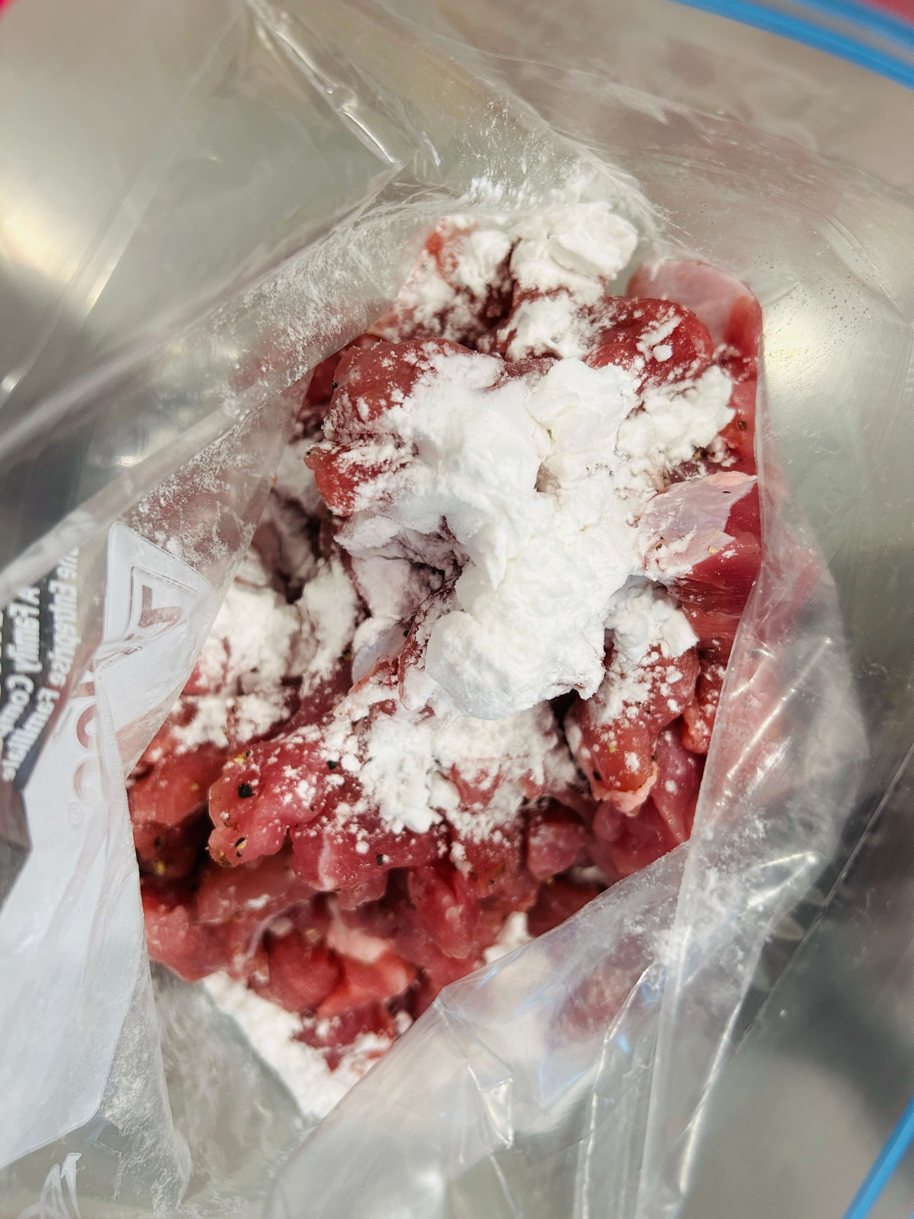 4. 봉지에 전분가루를 넣고 밑간 한 고기를 넣어 골고루 버무려 줍니다.