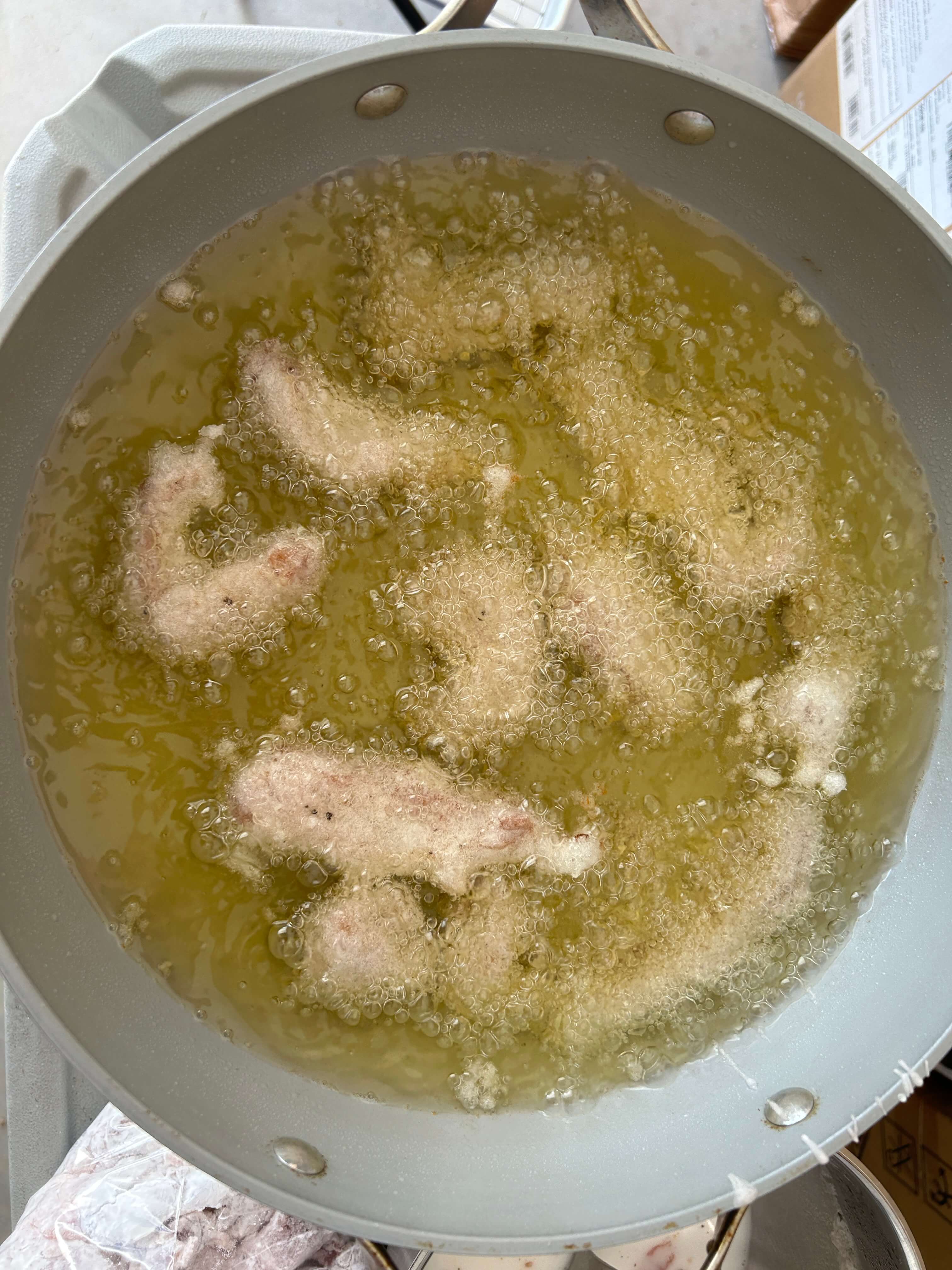 6. 전분뭍힌 고기를 전분물 반죽에 살짝 담갔다가 달궈진 기름에 튀깁니다.