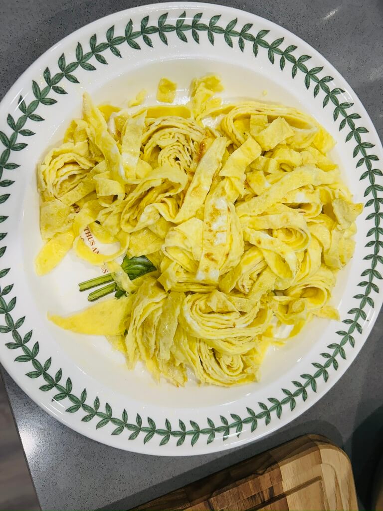 5. 만든 지단을 돌돌 말아 얇게 썰어 줍니다.