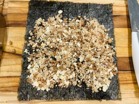 10. 김에 밥을 얇게 깔아줍니다.