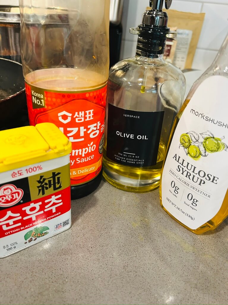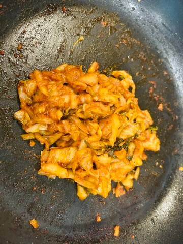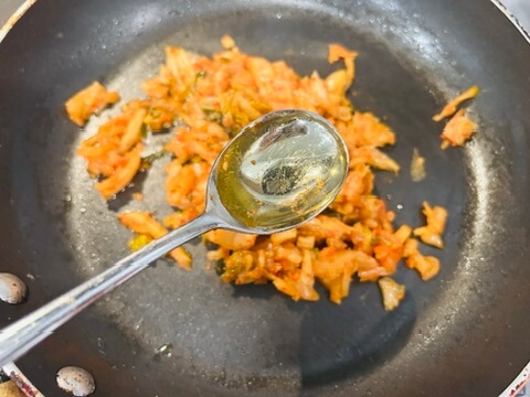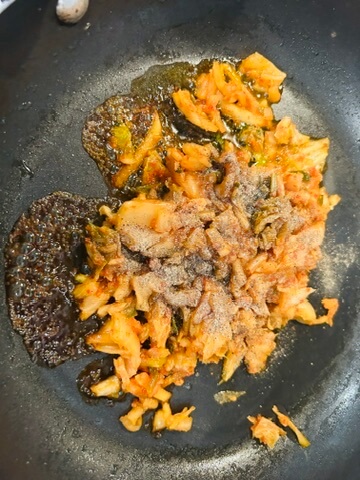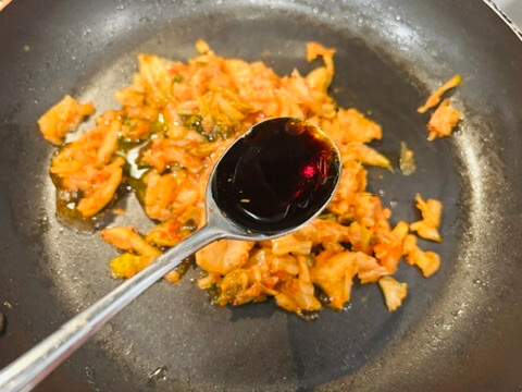 7. 올리브유를 둘러주고 알룰로스 1 숟갈, 간장 1 숟갈, 후추 톡톡 양념으로 김치를 볶아줍니다.
