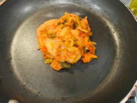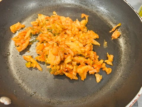 6. 김치를 잘게 잘라 프라이팬에 올려줍니다.