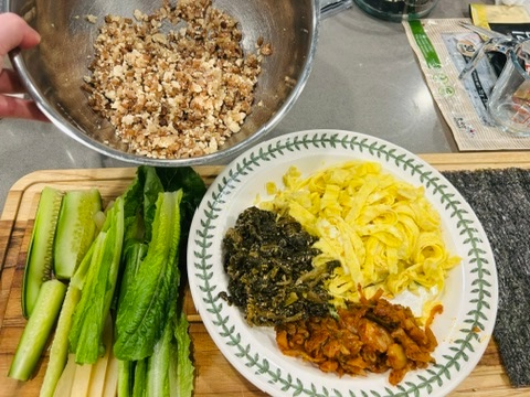 9. 김밥 속재료로 밥, 상추, 오이, 단무지, 시래기나물, 계란, 볶음김치, 김밥김을 준비합니다.