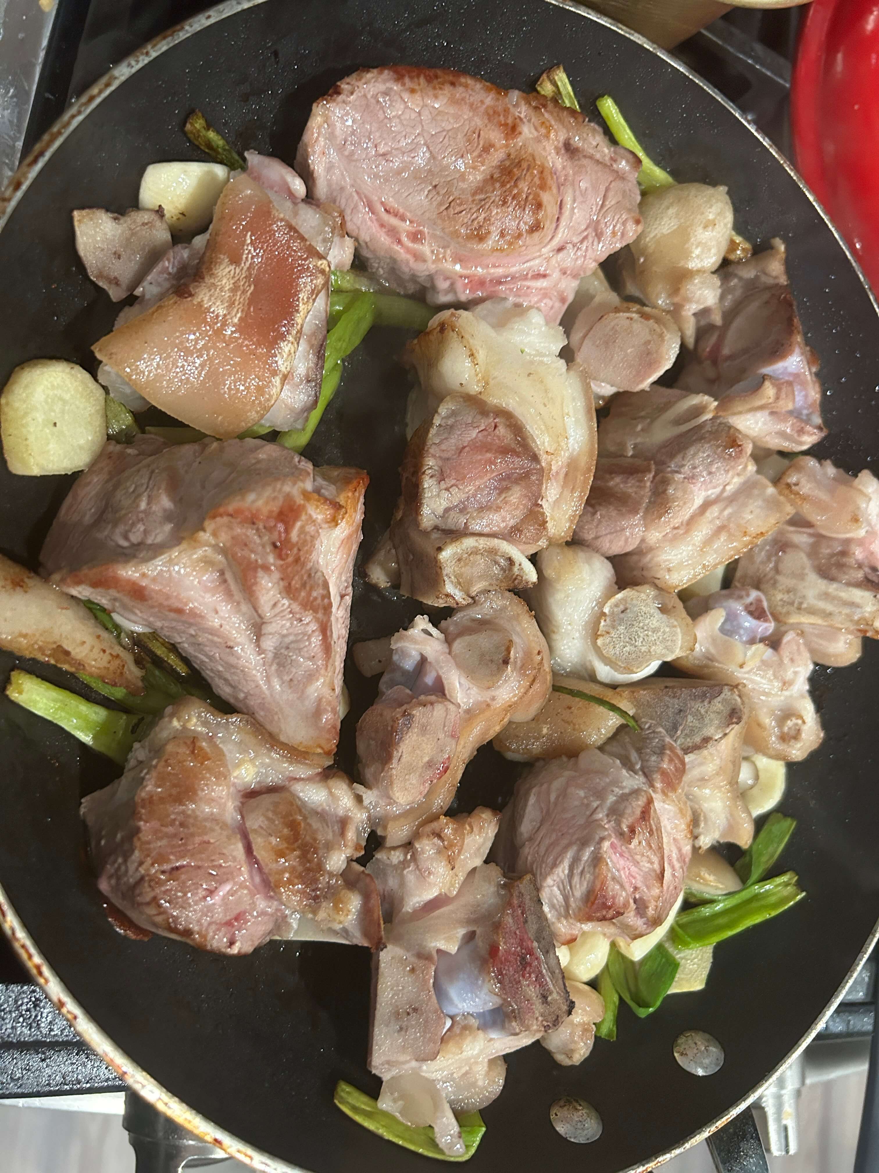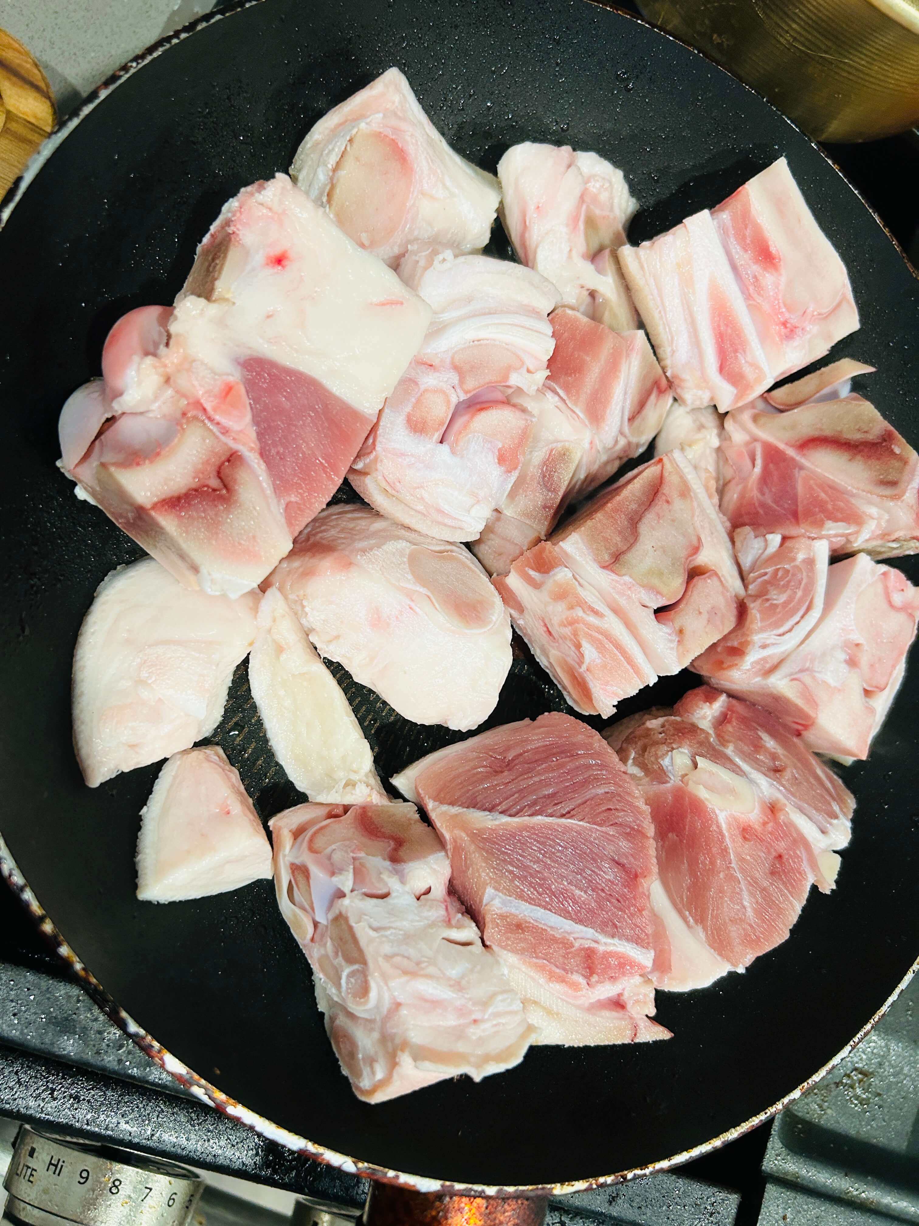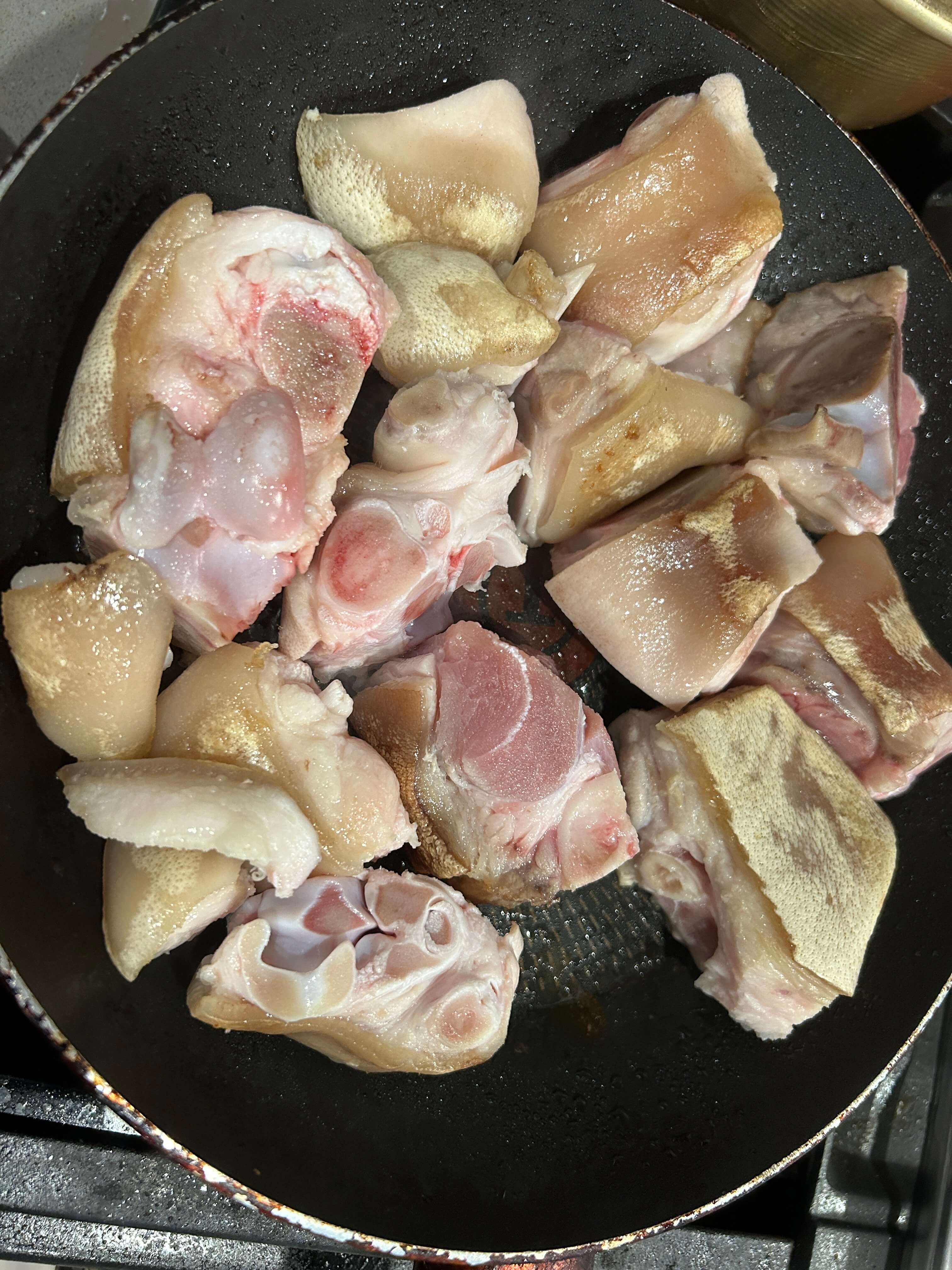 3. 프라이팬에 기름을 두르고 돼지족을 넣어줍니다.