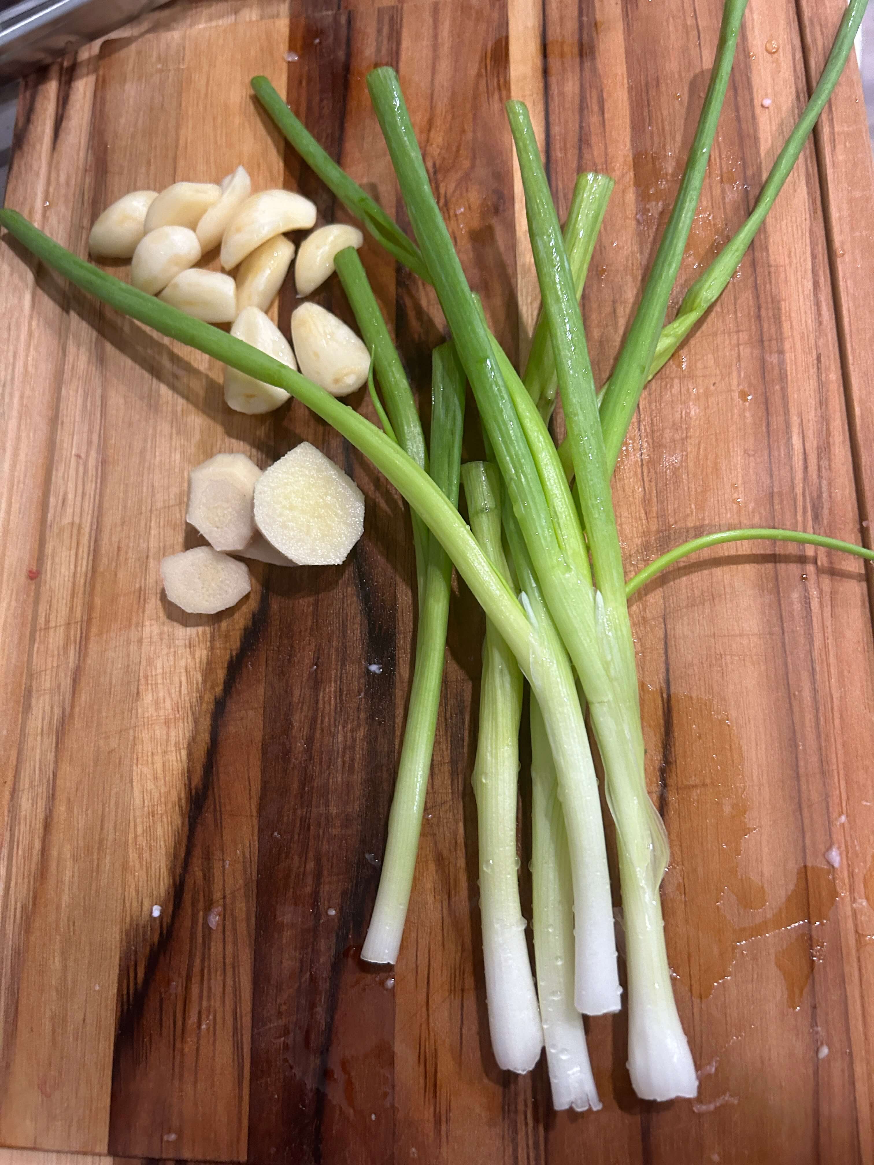 5. 통마늘 대파를 준비해 팬에 넣어 같이 볶아줍니다.