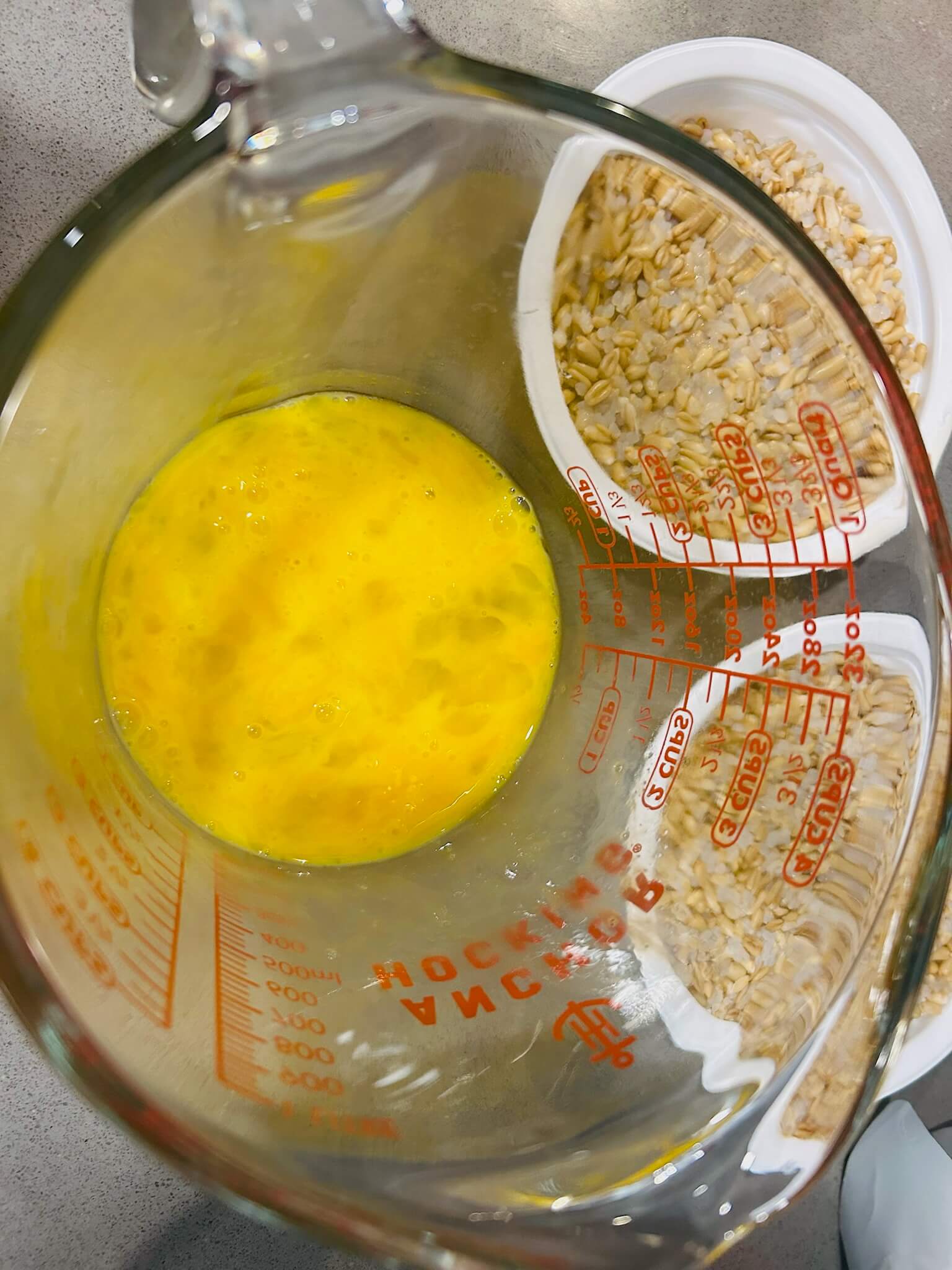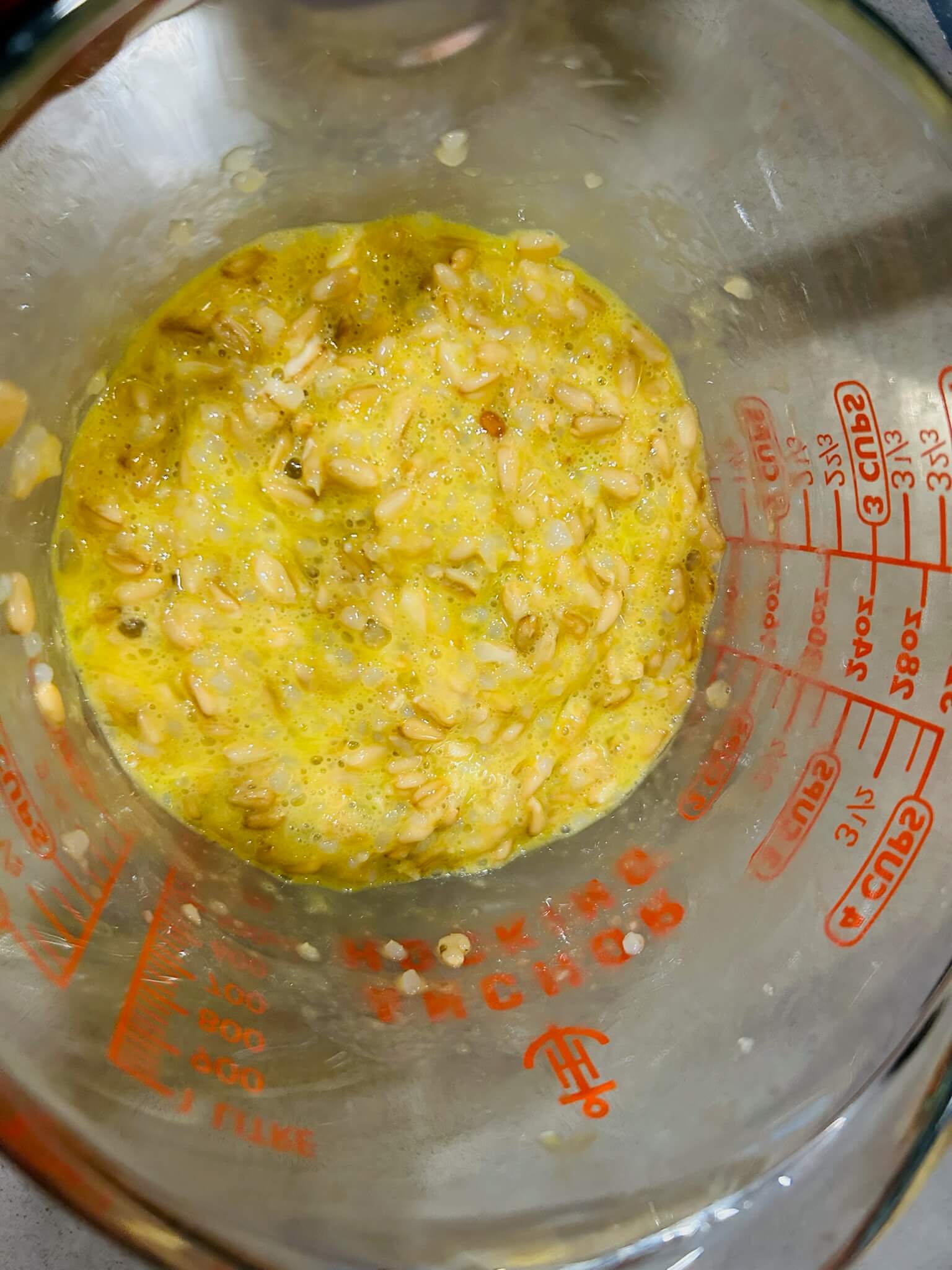 9. 풀어둔 계란에 밥을 넣어 밥에 계란물을 코팅시켜 줍니다.