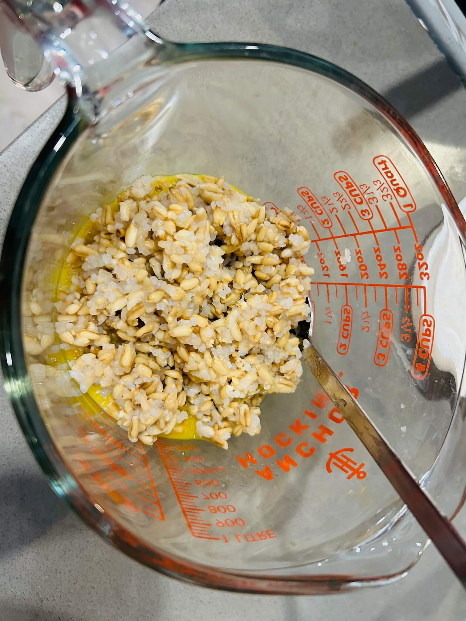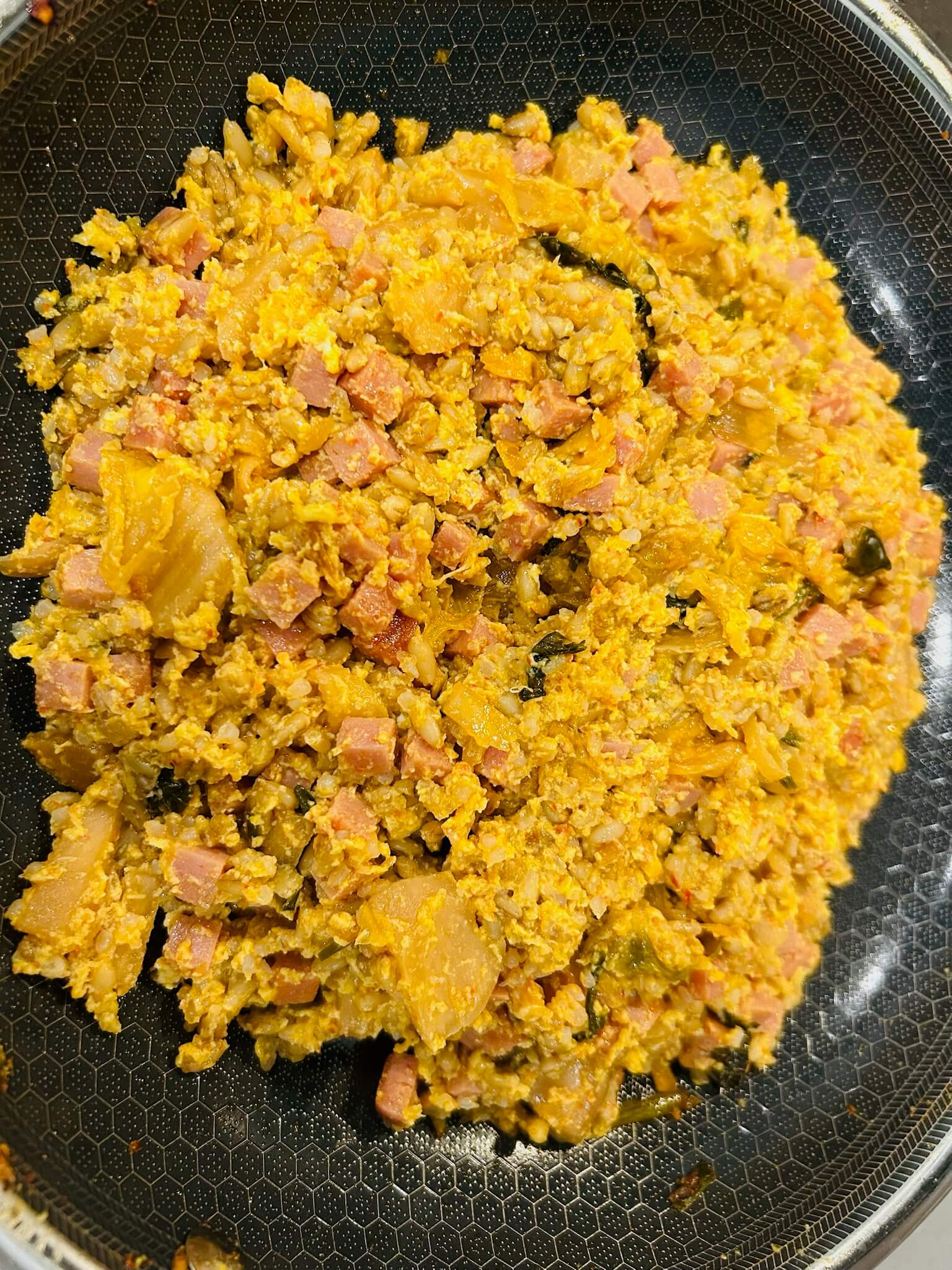 10. 프라이팬에 공간을 만들어 계란물 입힌 밥을 볶아줍니다.