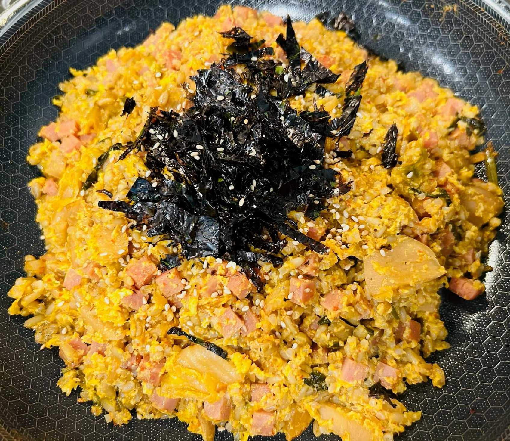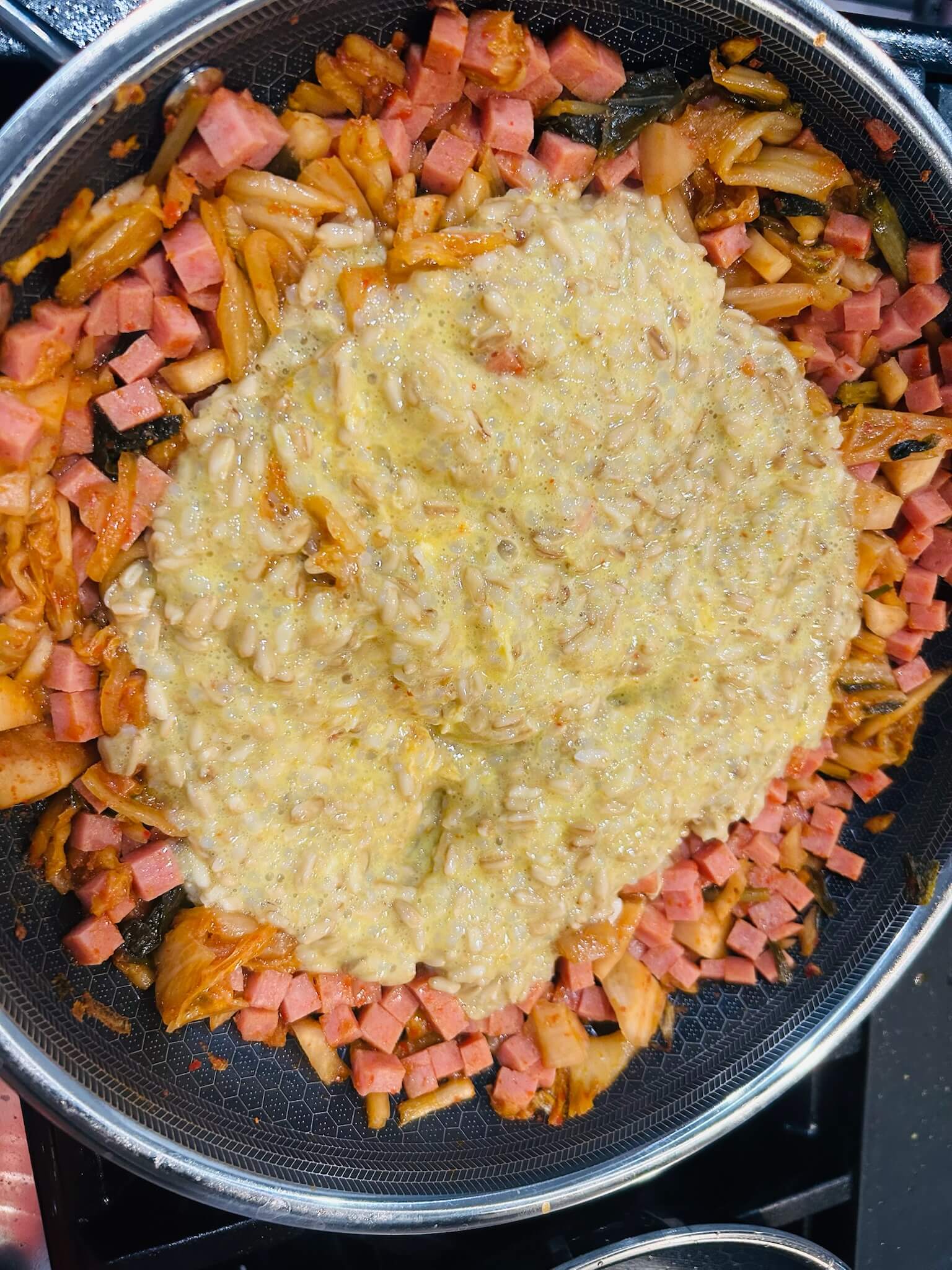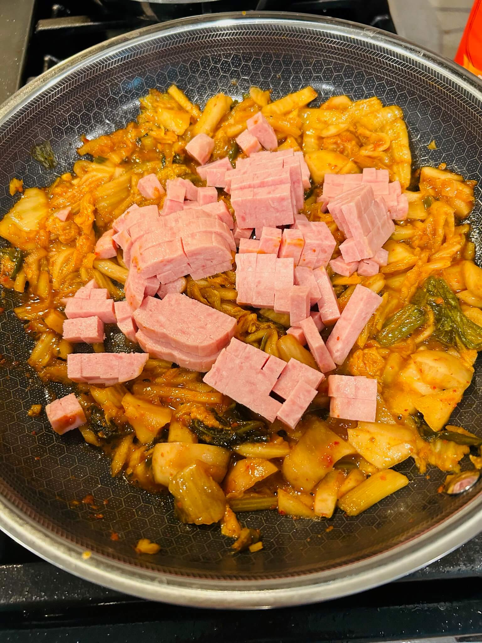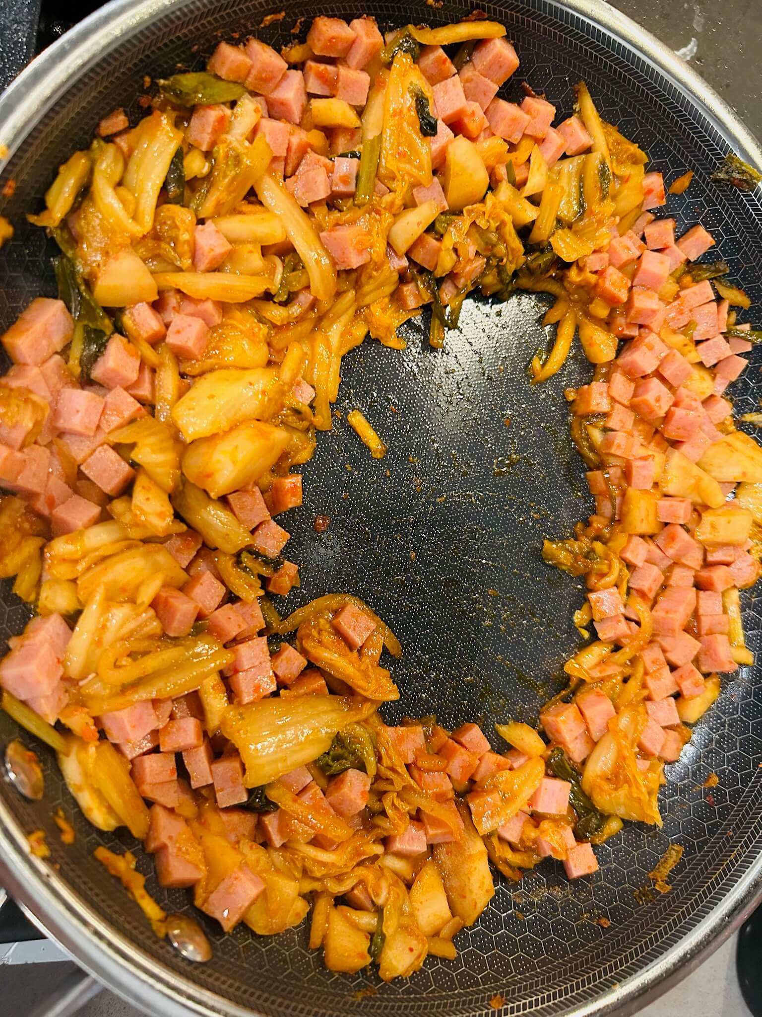 11. 밥알이 식어가면 스팸, 김치를 같이 섞어 한번 볶아줍니다.