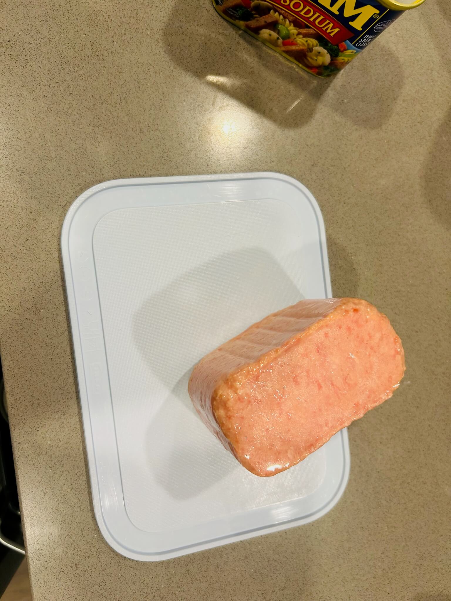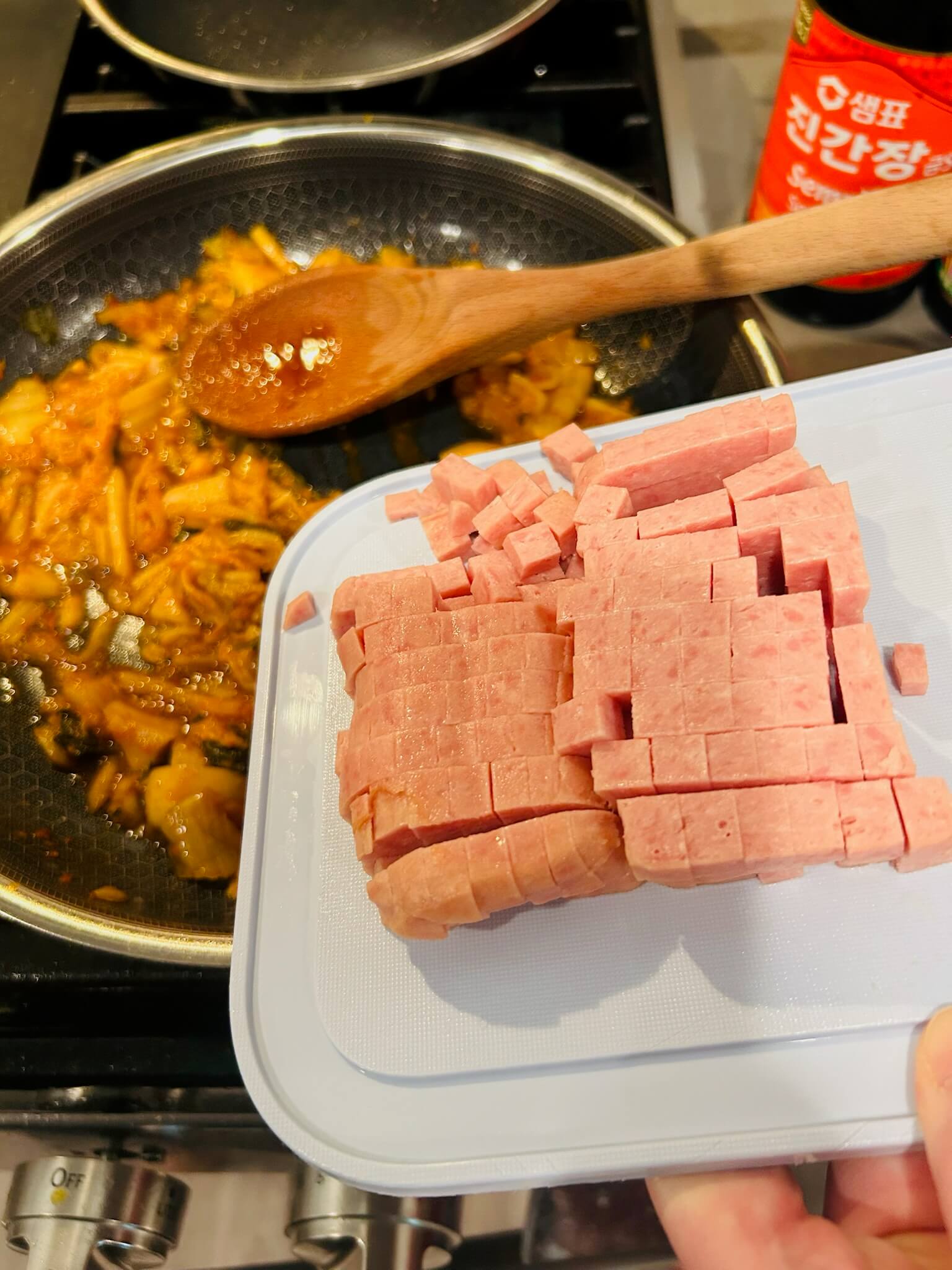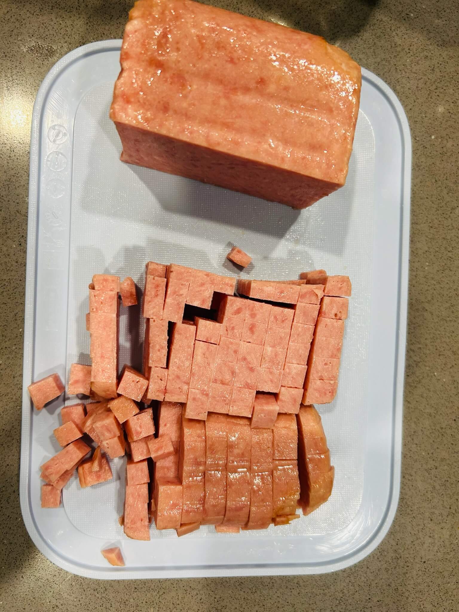 1. 스팸을 깍둑썰기로 잘라줍니다.