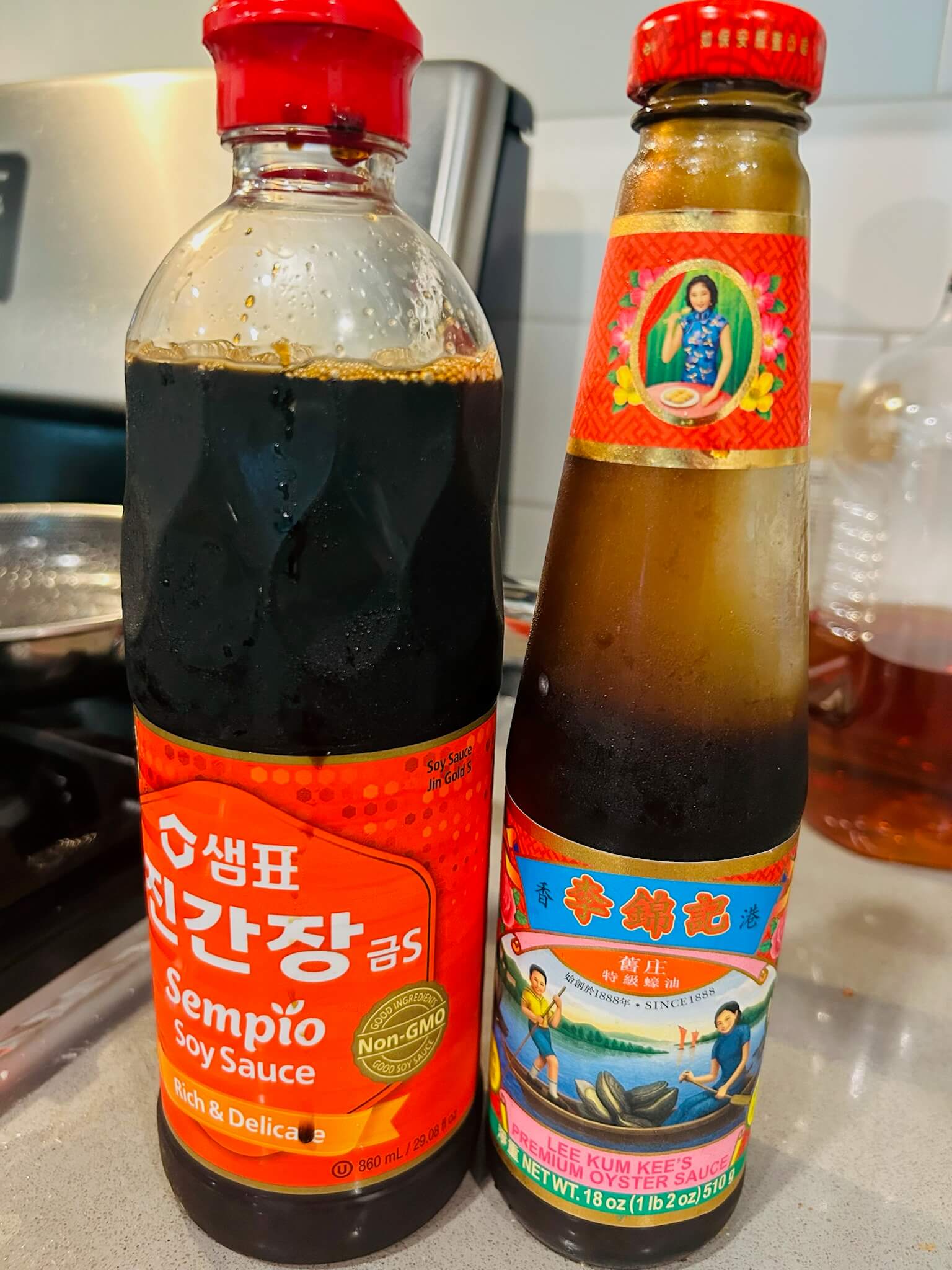6. 간장 1 숟갈, 굴소스 1 숟갈을 넣어 같이 볶아줍니다.