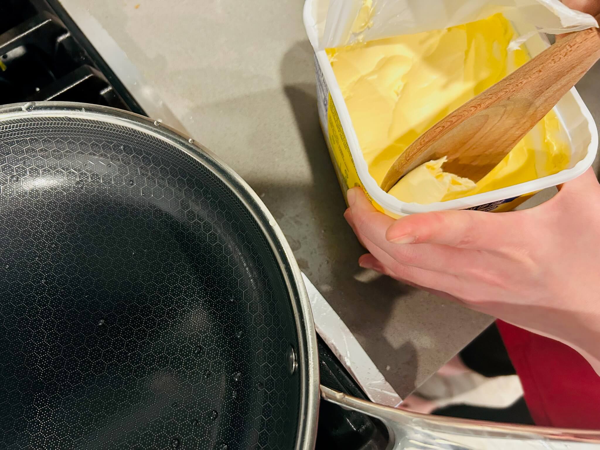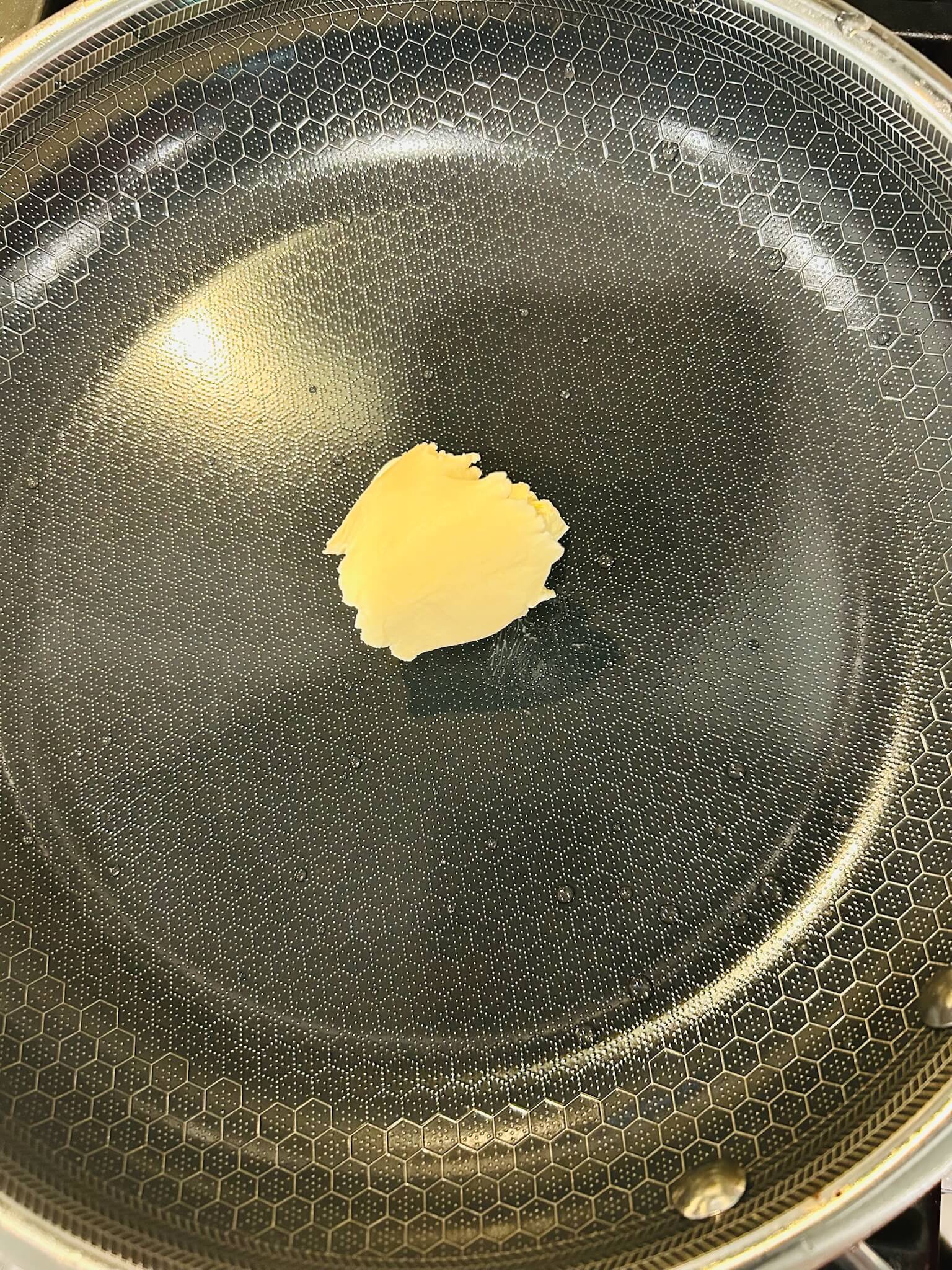 4. 프라이팬에 버터 한 숟갈을 올려줍니다.