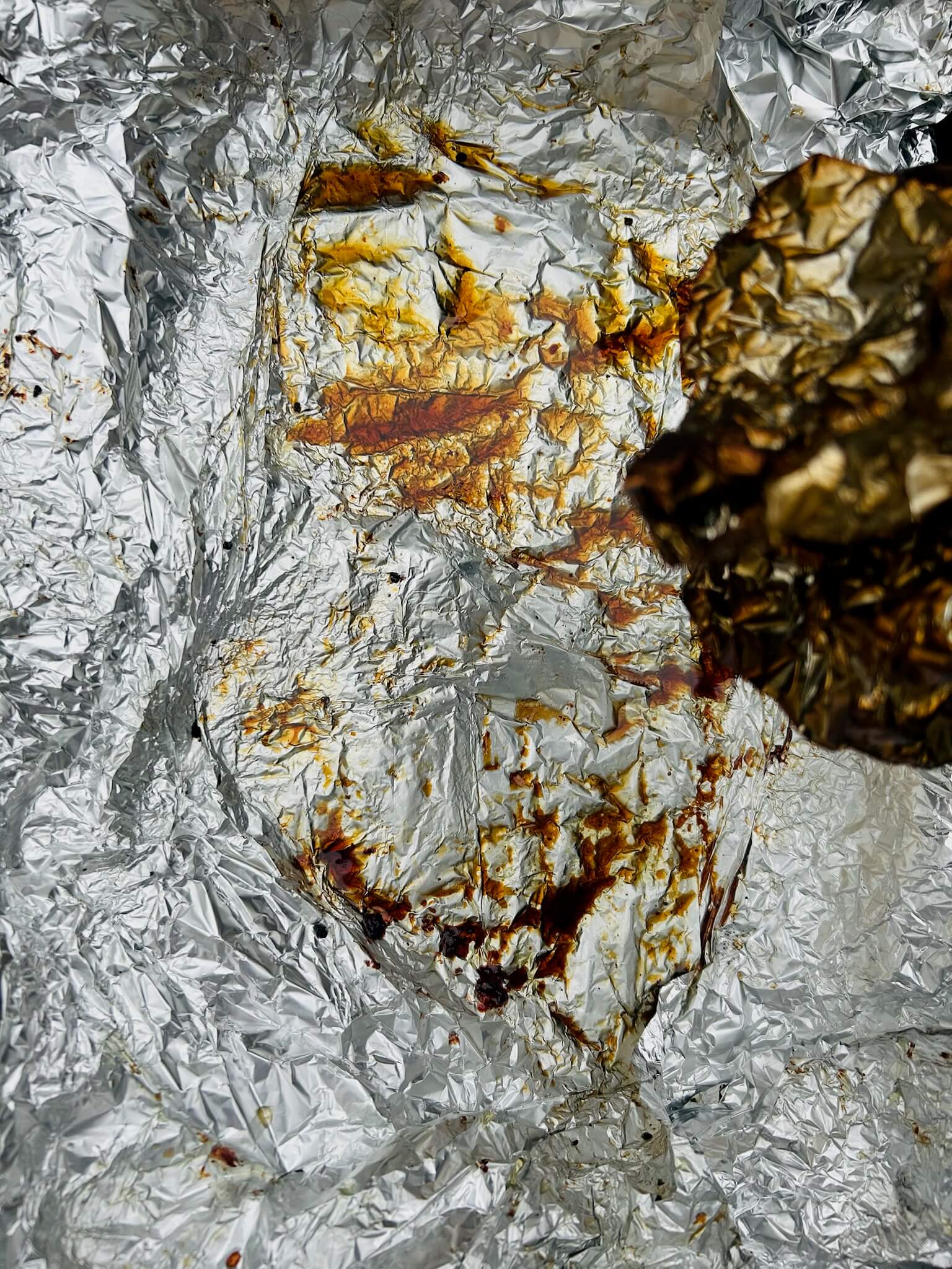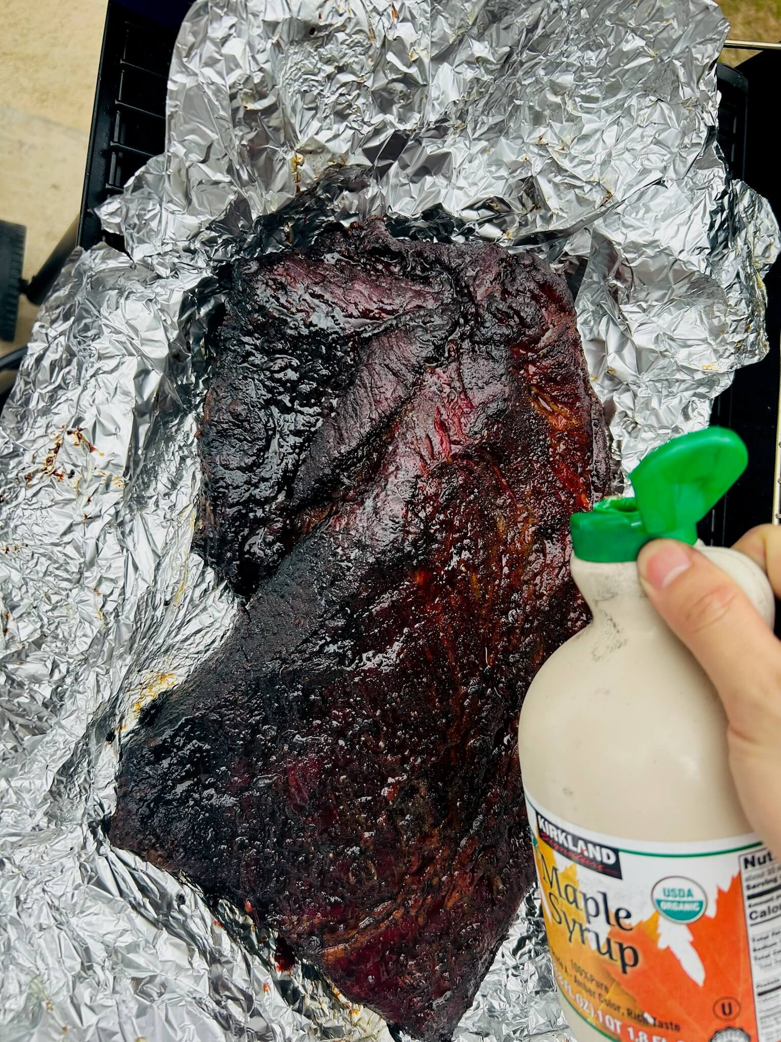 13. 포일에 지방에서 나온 기름과 메이플시럽을 골고루 발라줍니다.