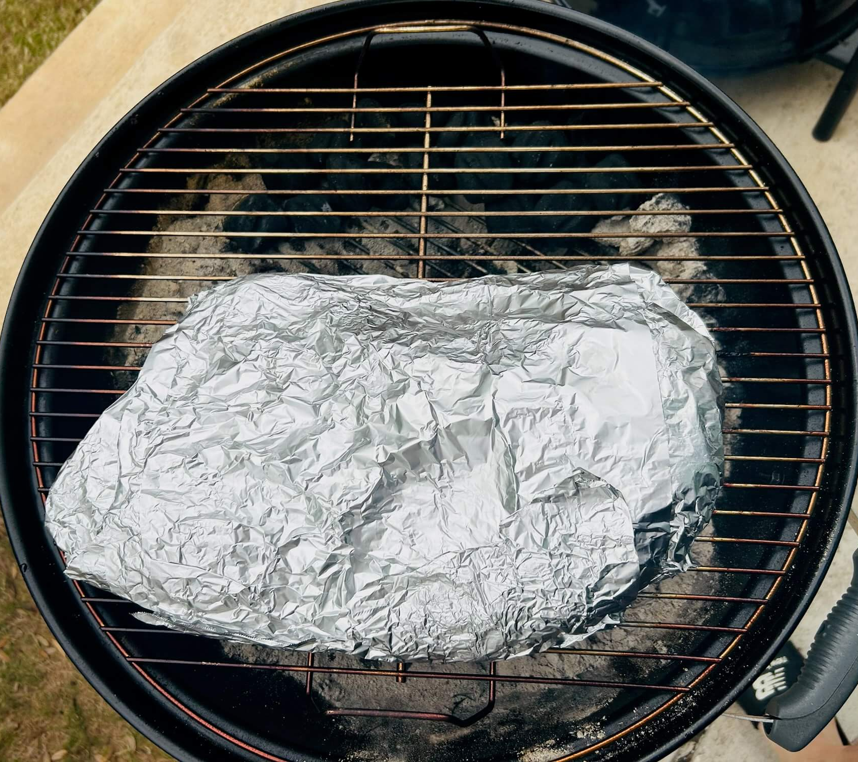 9. 시즈닝 한 고기와 지방 모아둔 은박지를 그릴 위에 올려줍니다.
