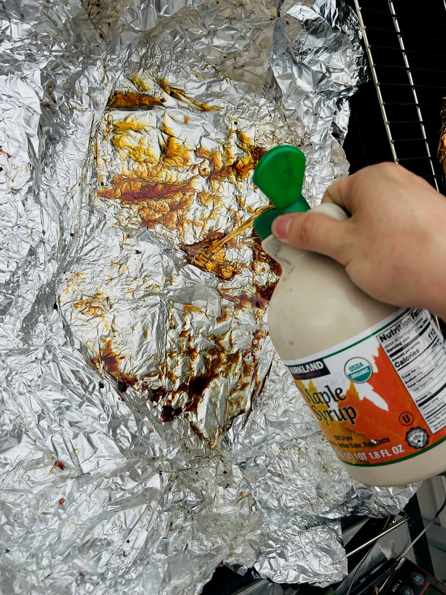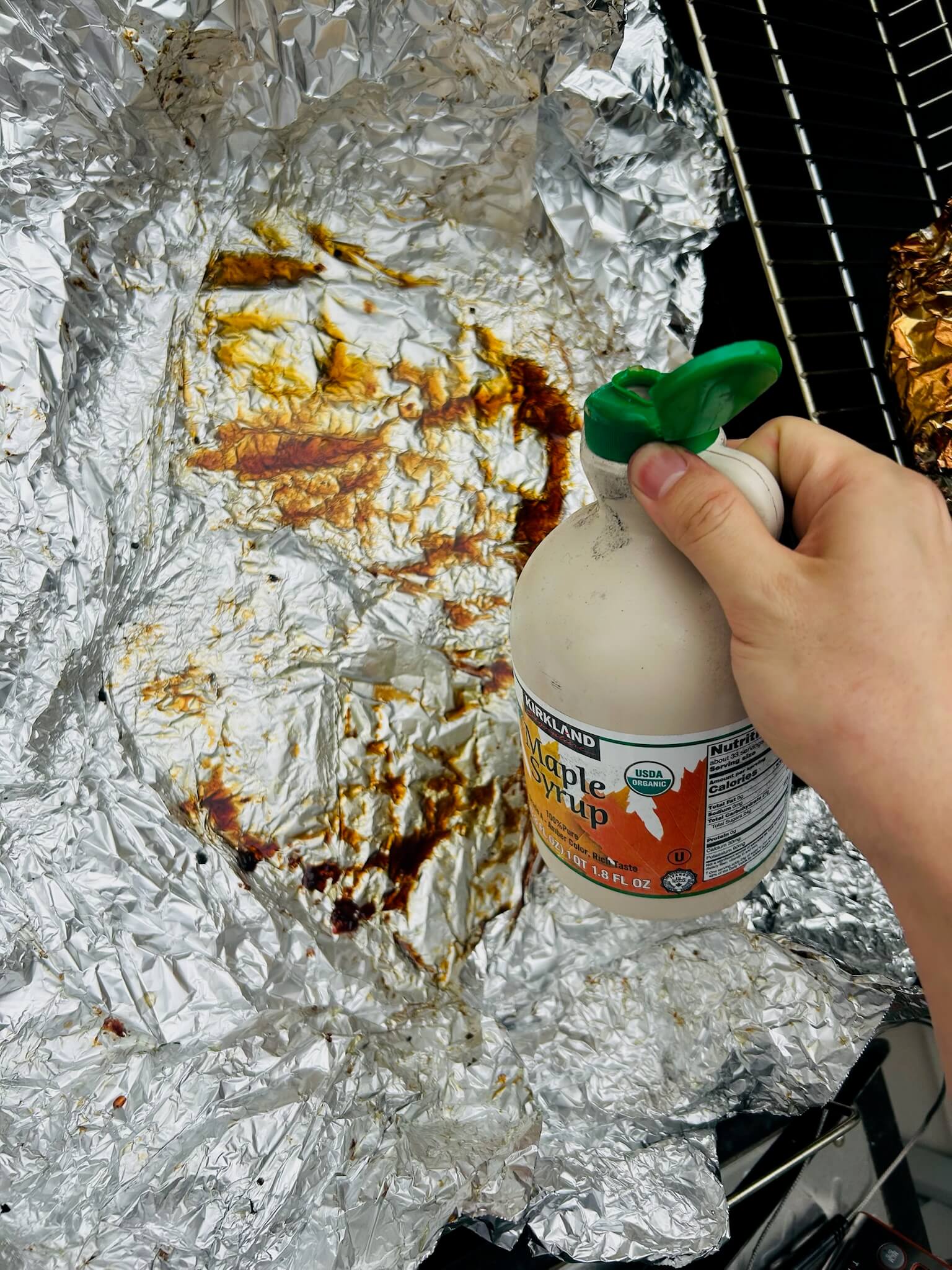 13. 포일에 지방에서 나온 기름과 메이플시럽을 골고루 발라줍니다.