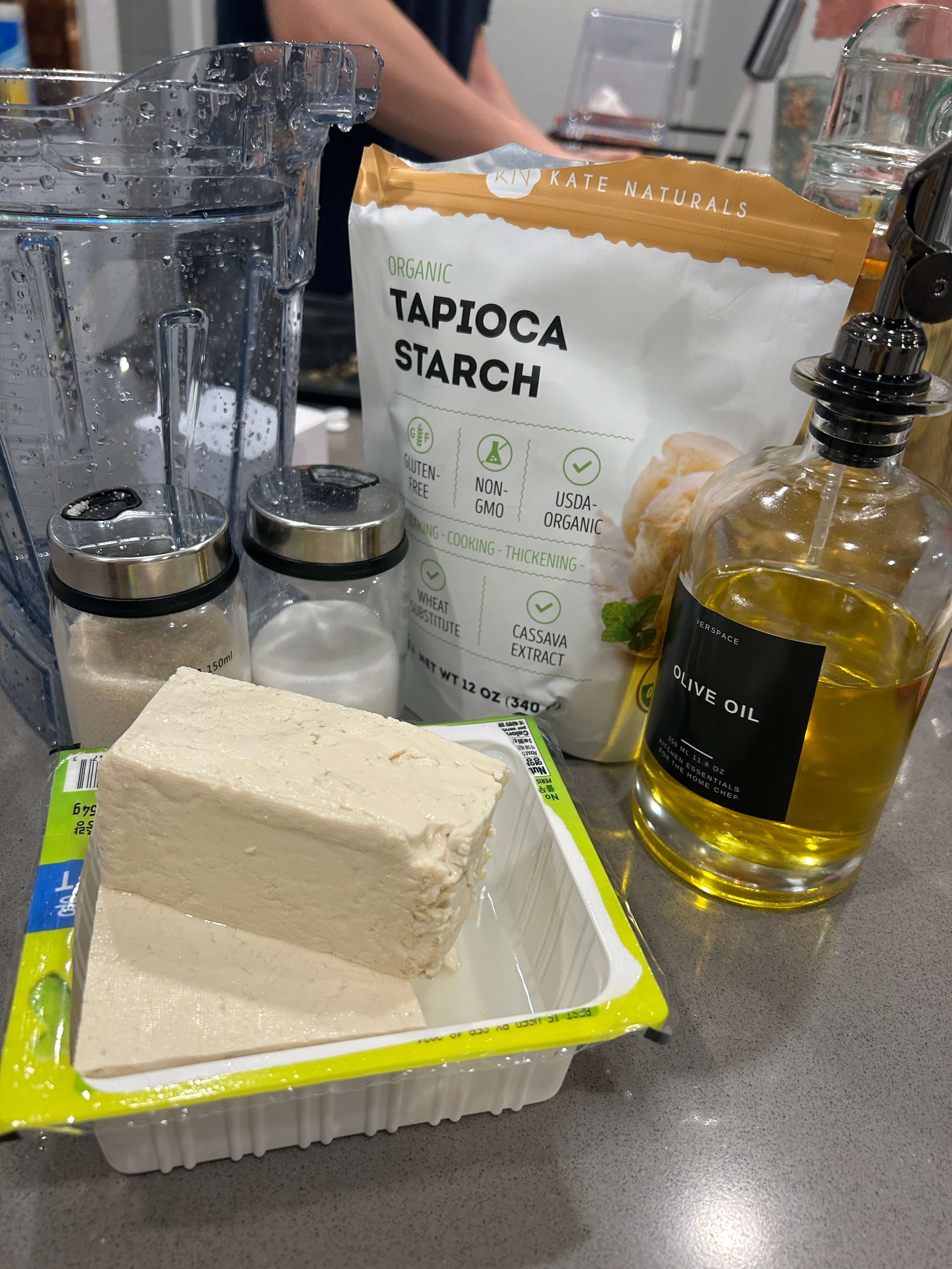 1. 믹서기, 두부반모, 티피오카전분, 설탕, 소금, 올리브유를 준비해 줍니다.