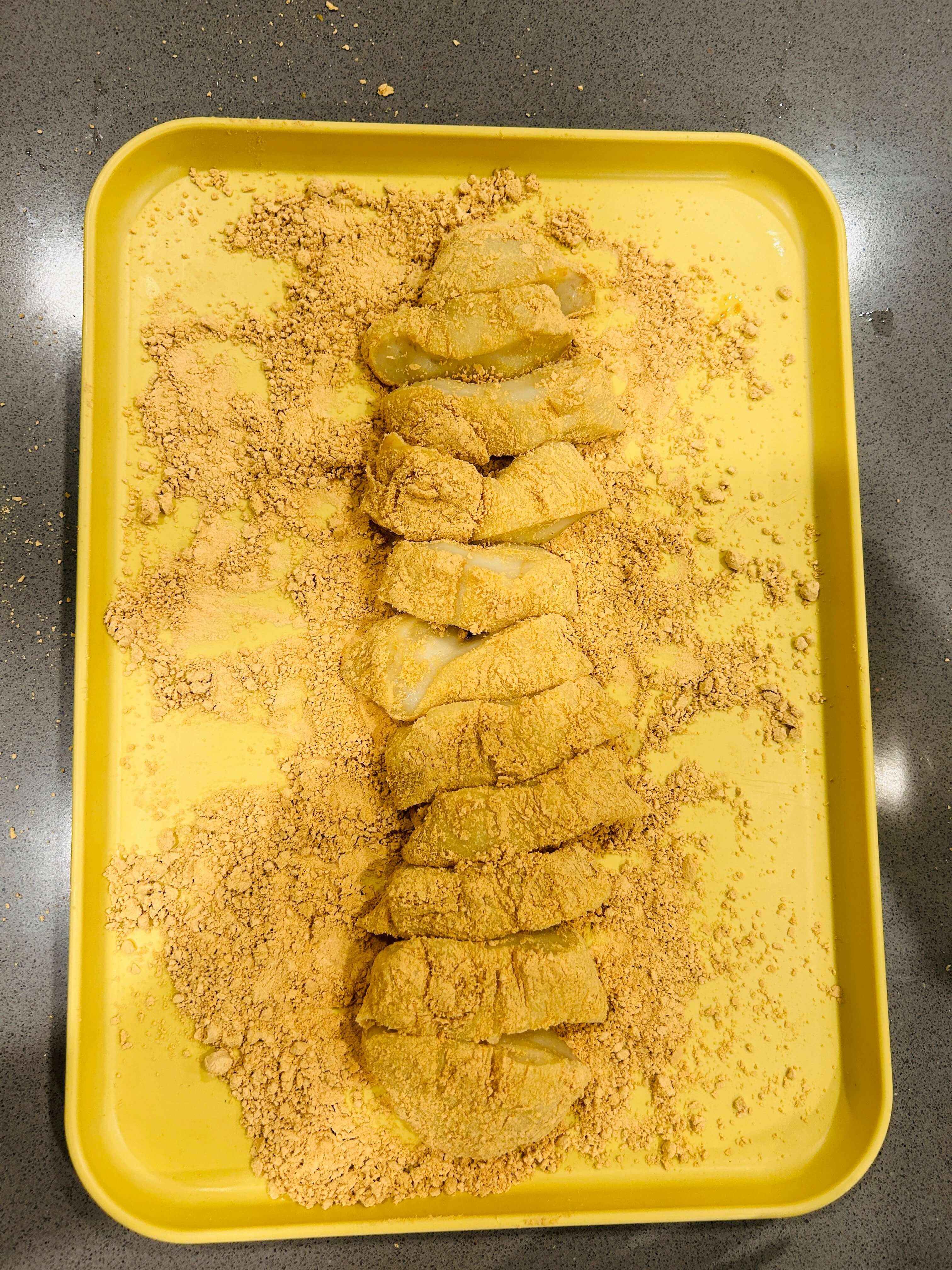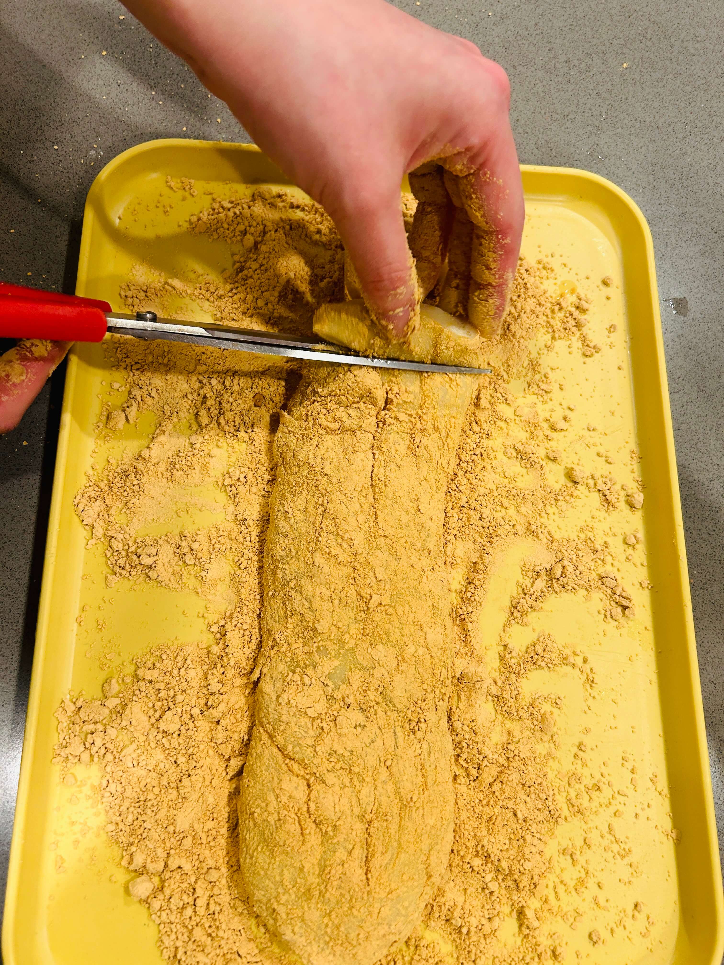 8. 한입크기로 잘라준 뒤 콩가루를 골고루 잘 묻혀줍니다.