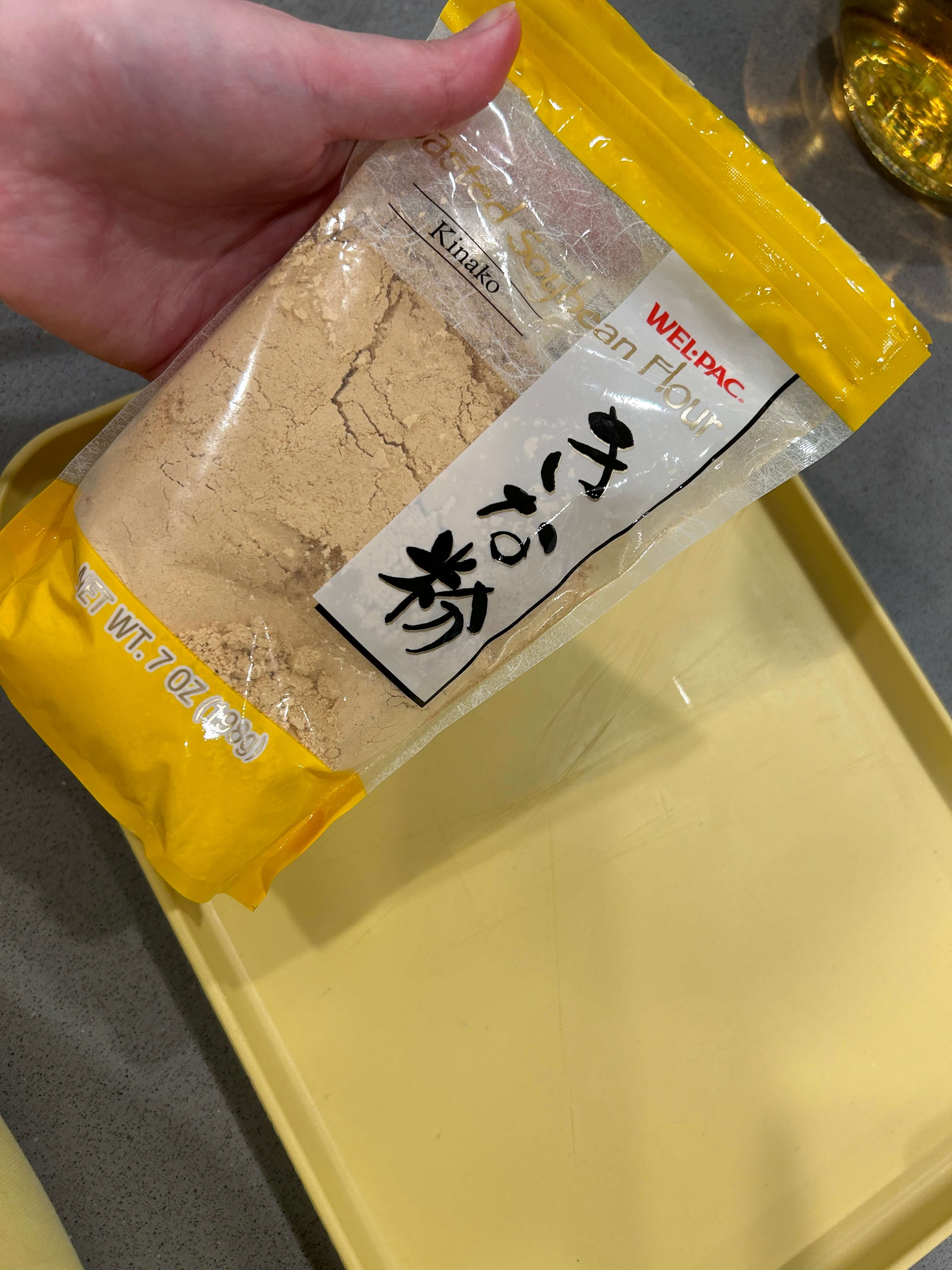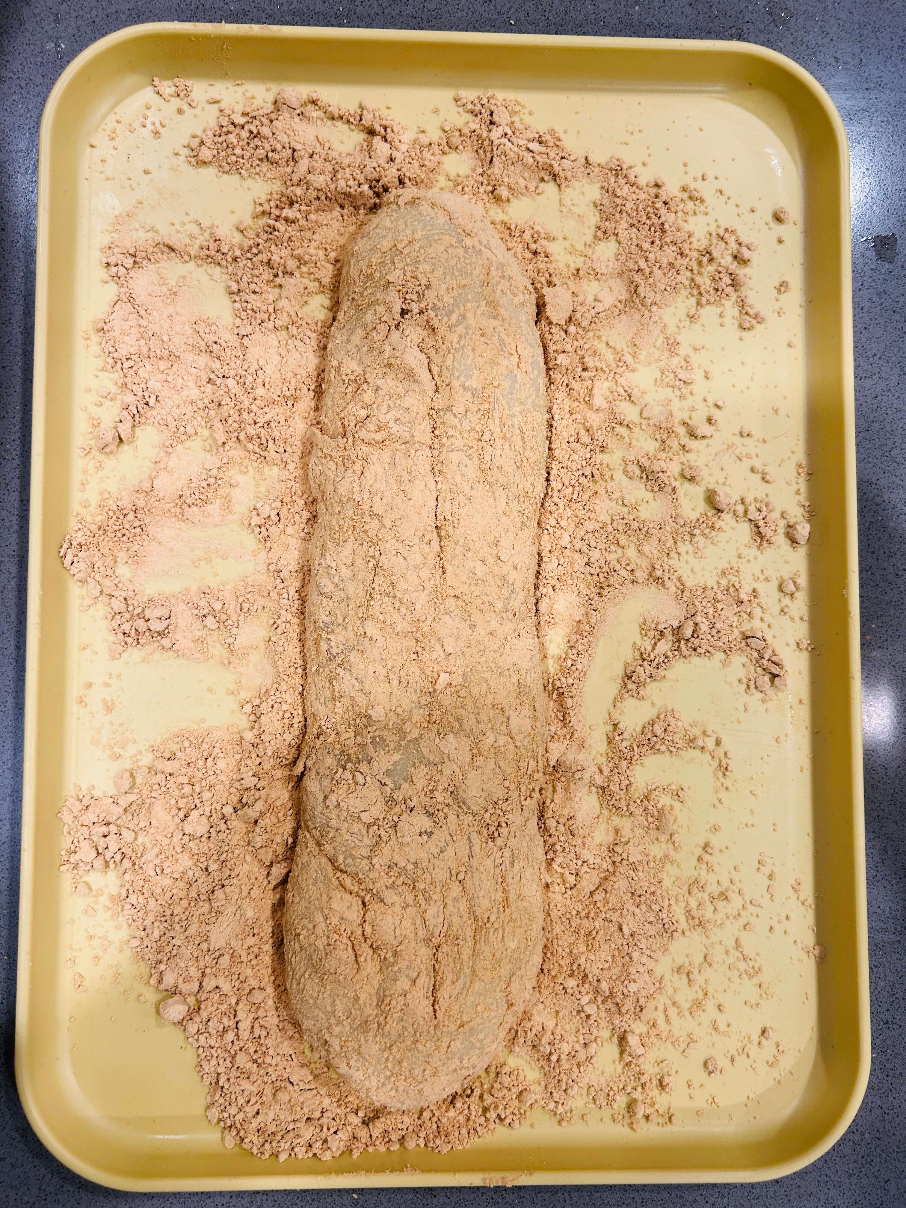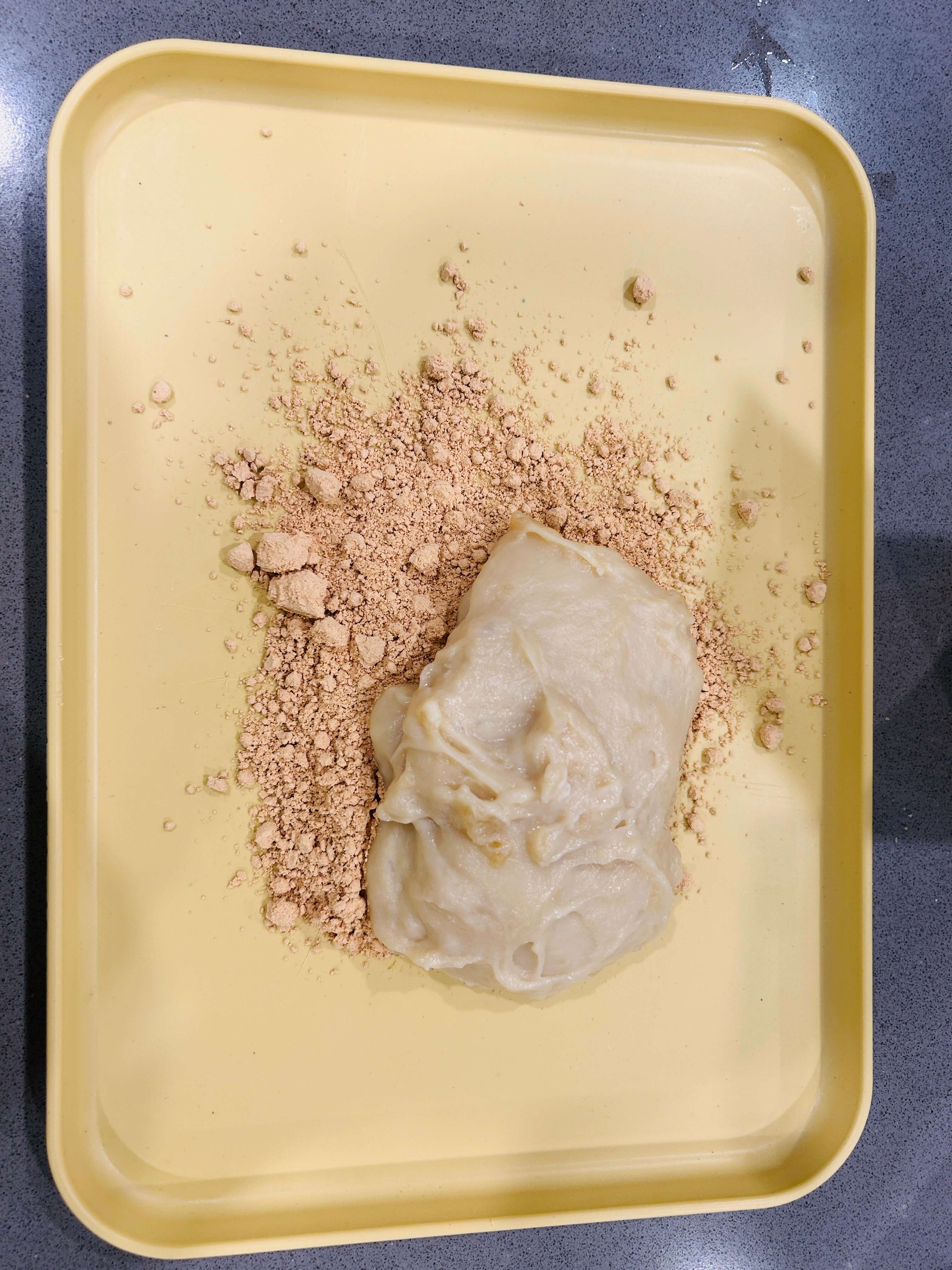 7. 콩가루에 반죽을 올려 길게 모양을 잡아줍니다.