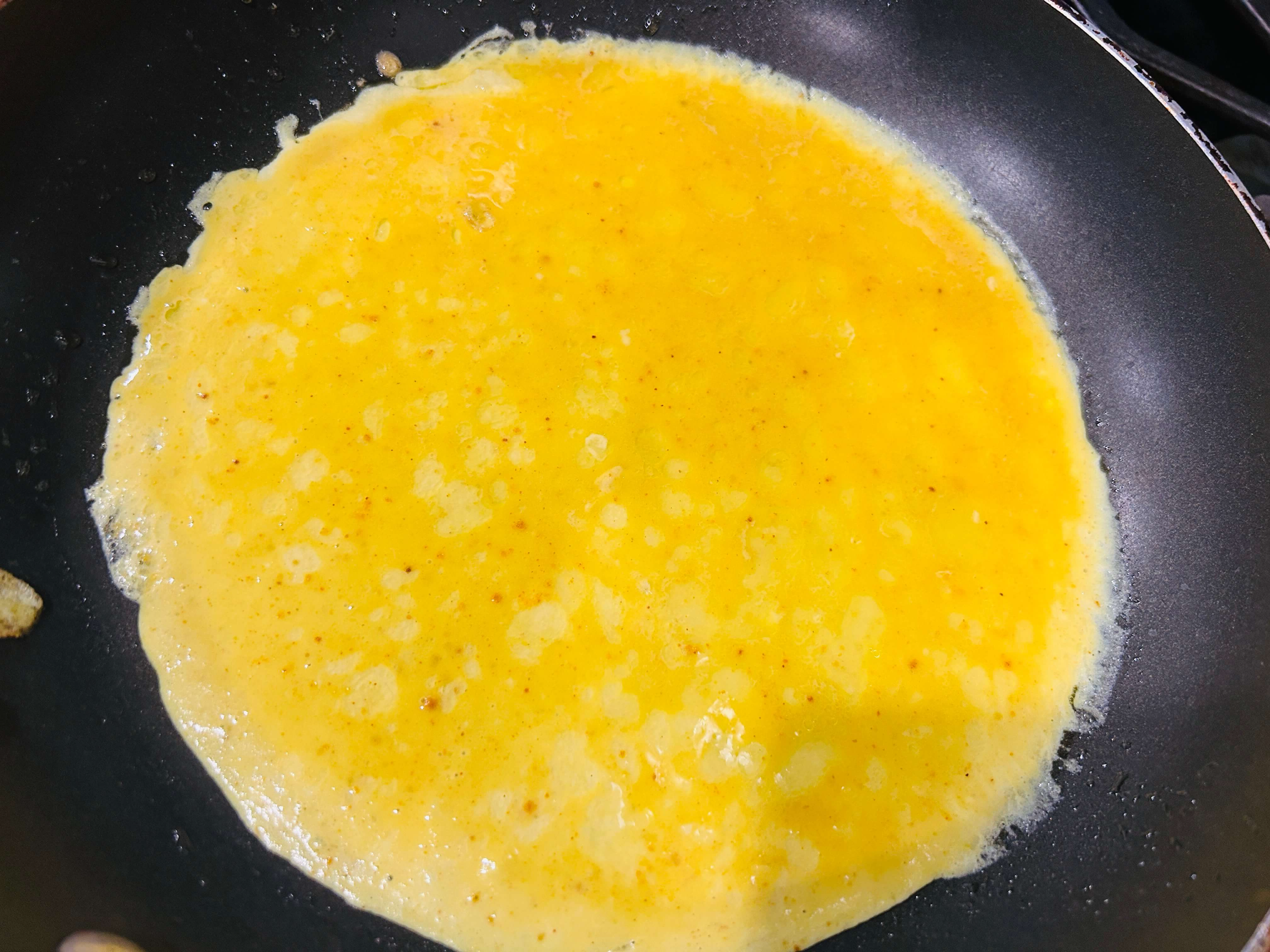 4. 프라이팬에 계란물을 올려 통통한 계란말이를 만들어 줍니다.