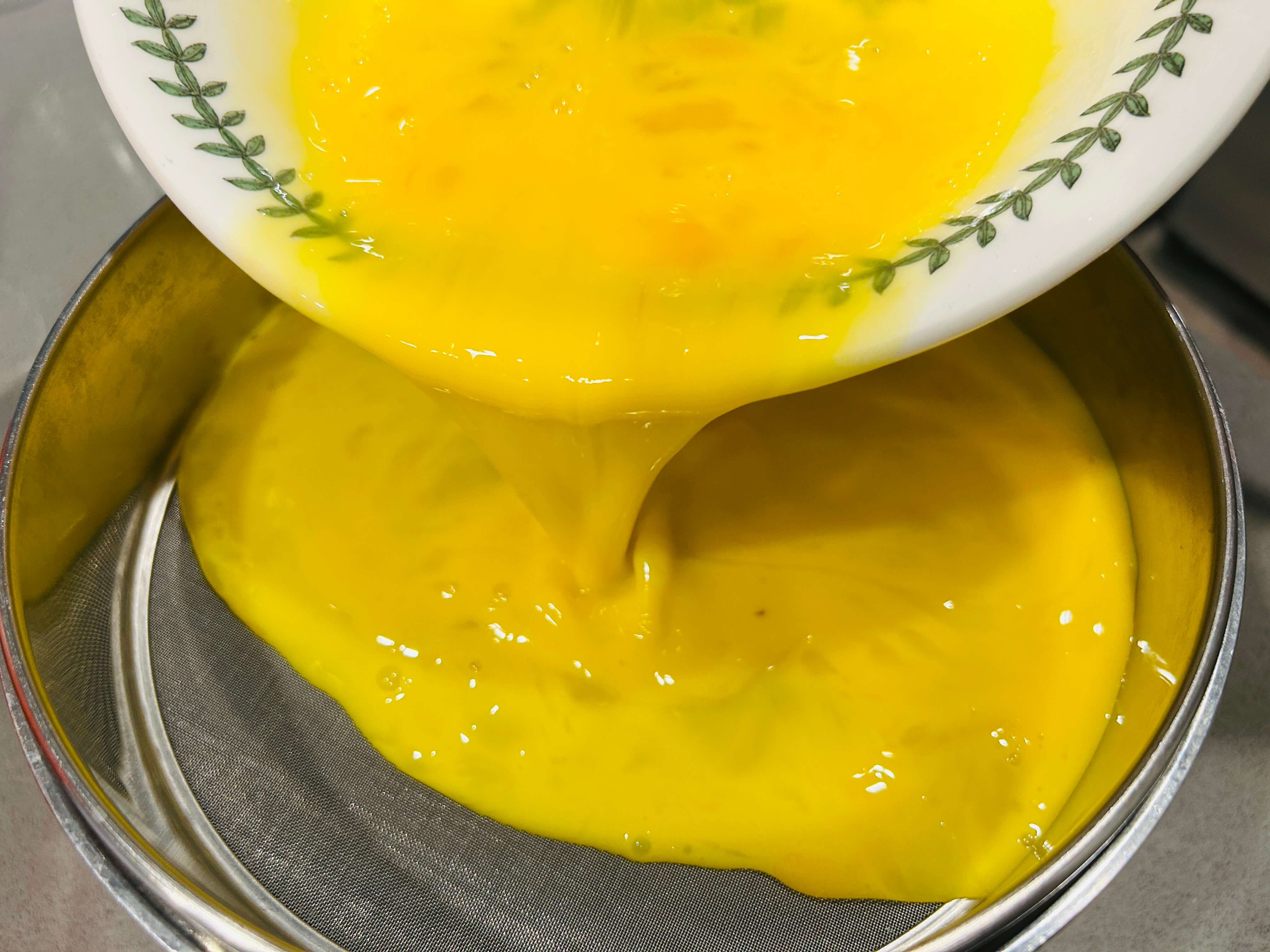 2. 체에 계란물을 걸러 알끈을 제거해 부드럽게 만들어 줍니다.