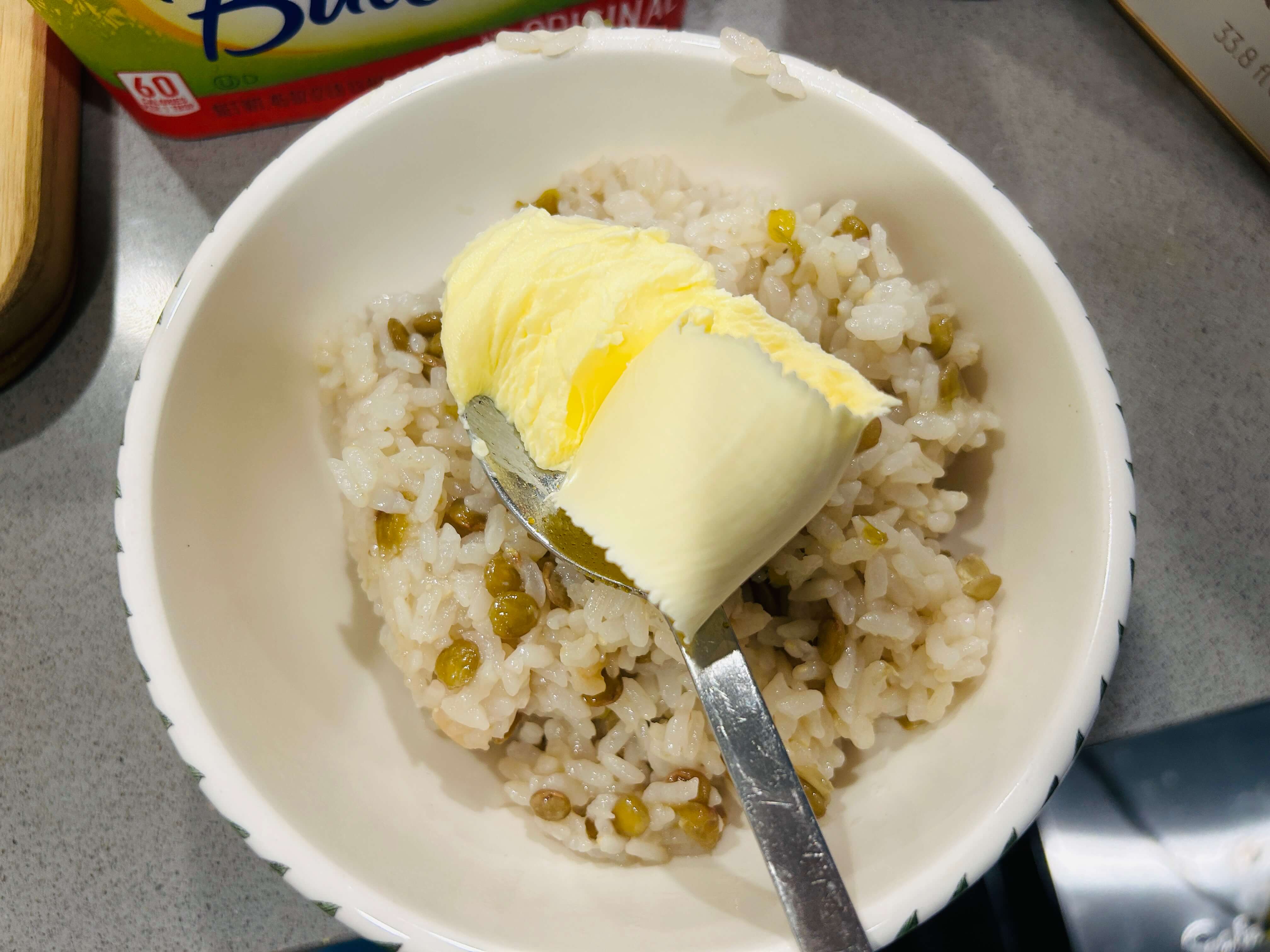 6. 밥에 버터 1 숟갈, 간장 1숟갈, 참기름 1 숟갈을 넣고 잘 비벼 줍니다.