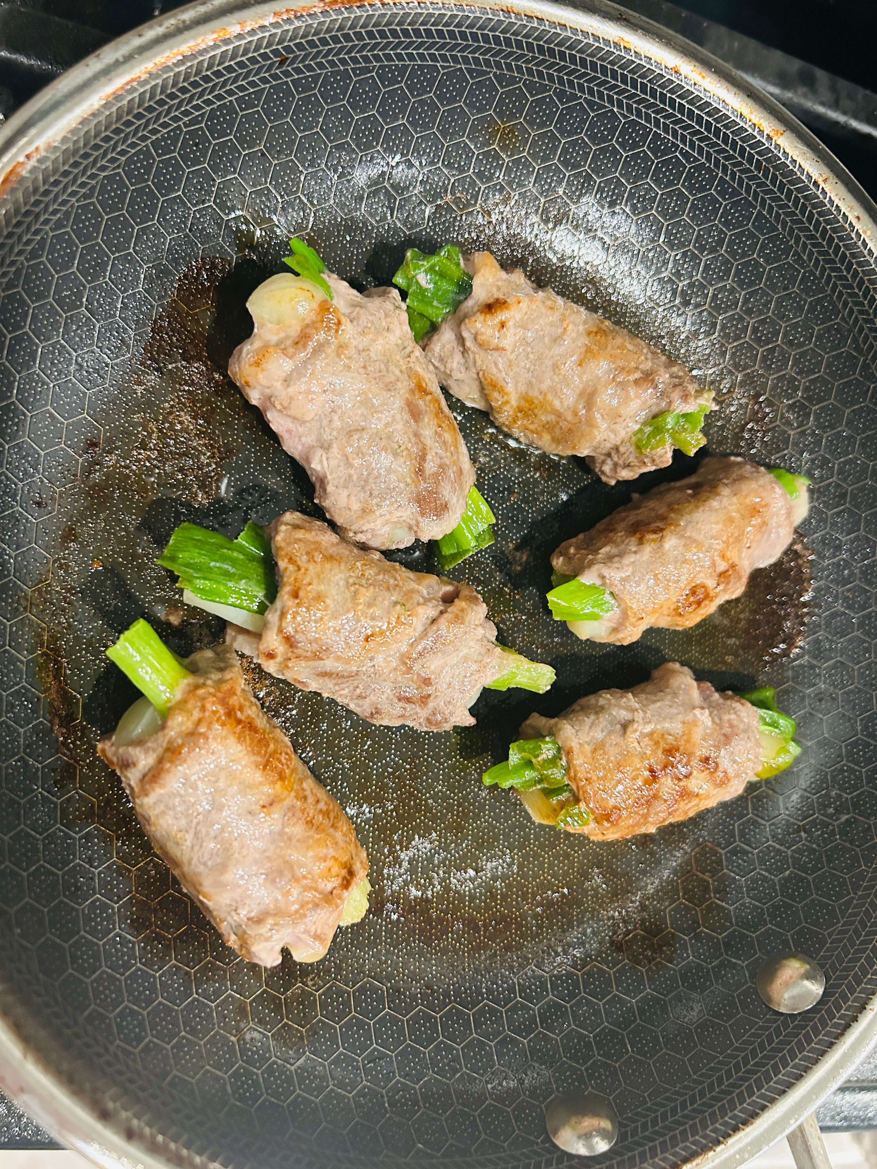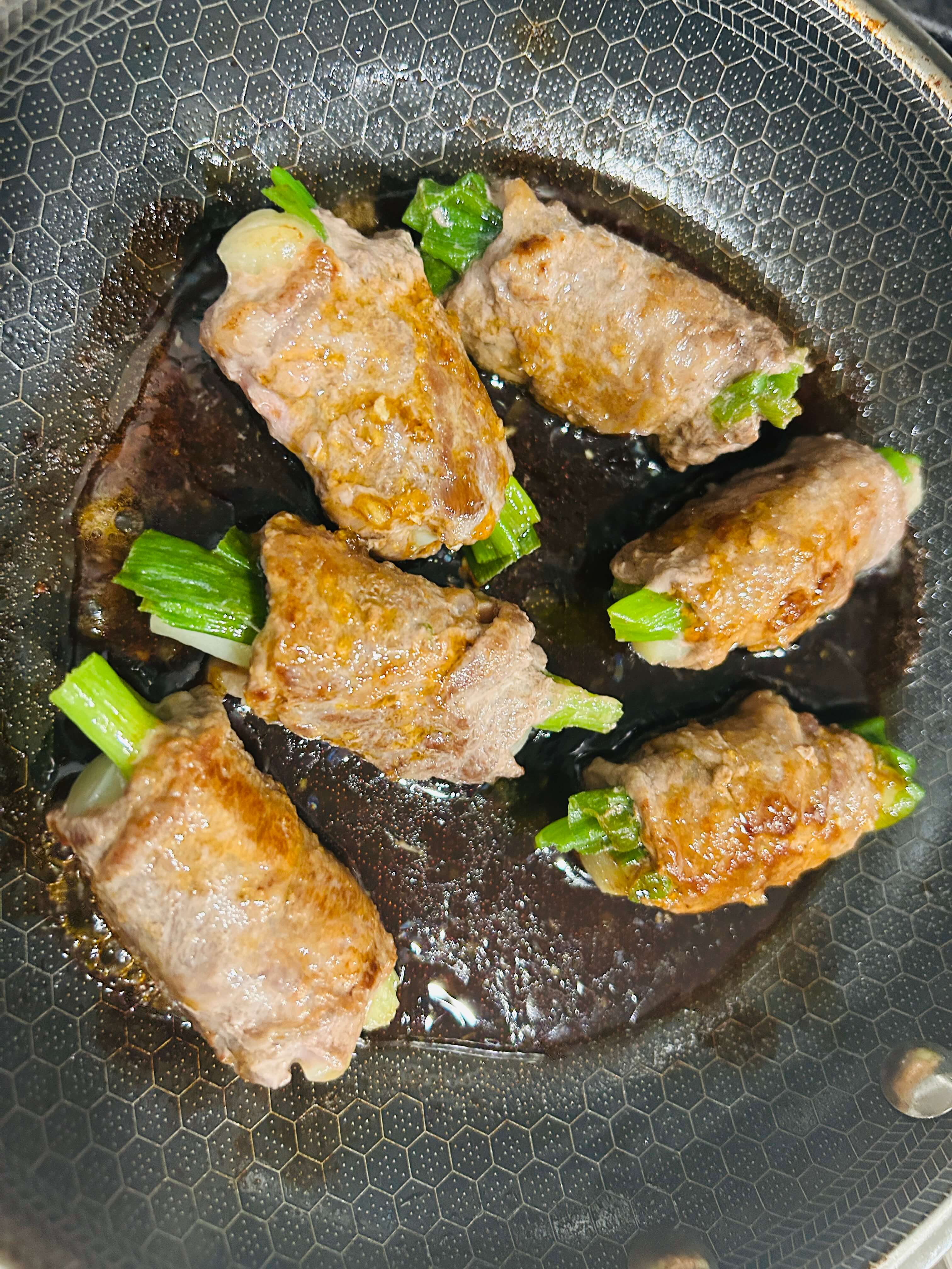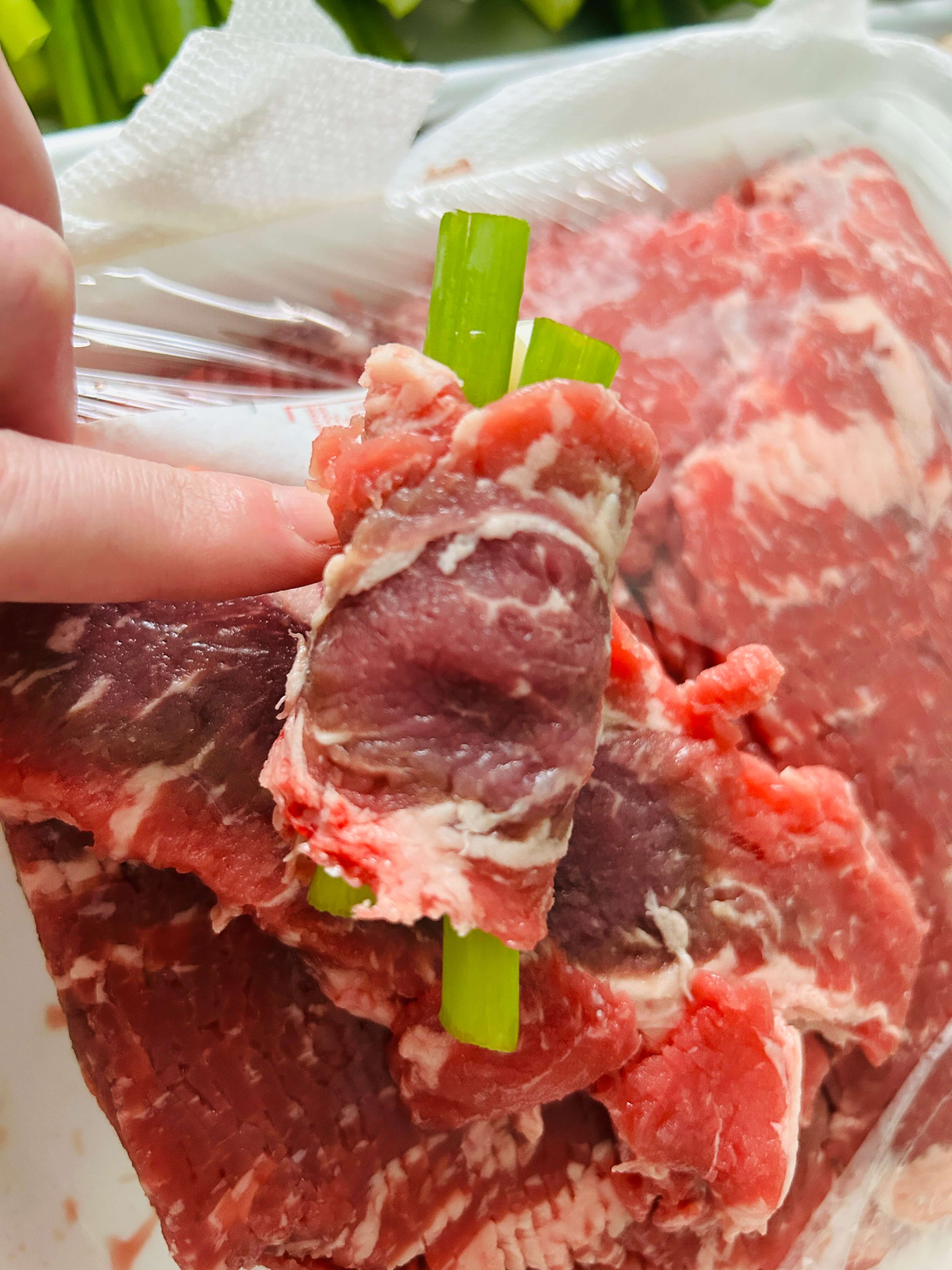 2. 얇은 고기에 쪽파, 밀떡을 넣고 돌돌 말아 줍니다.