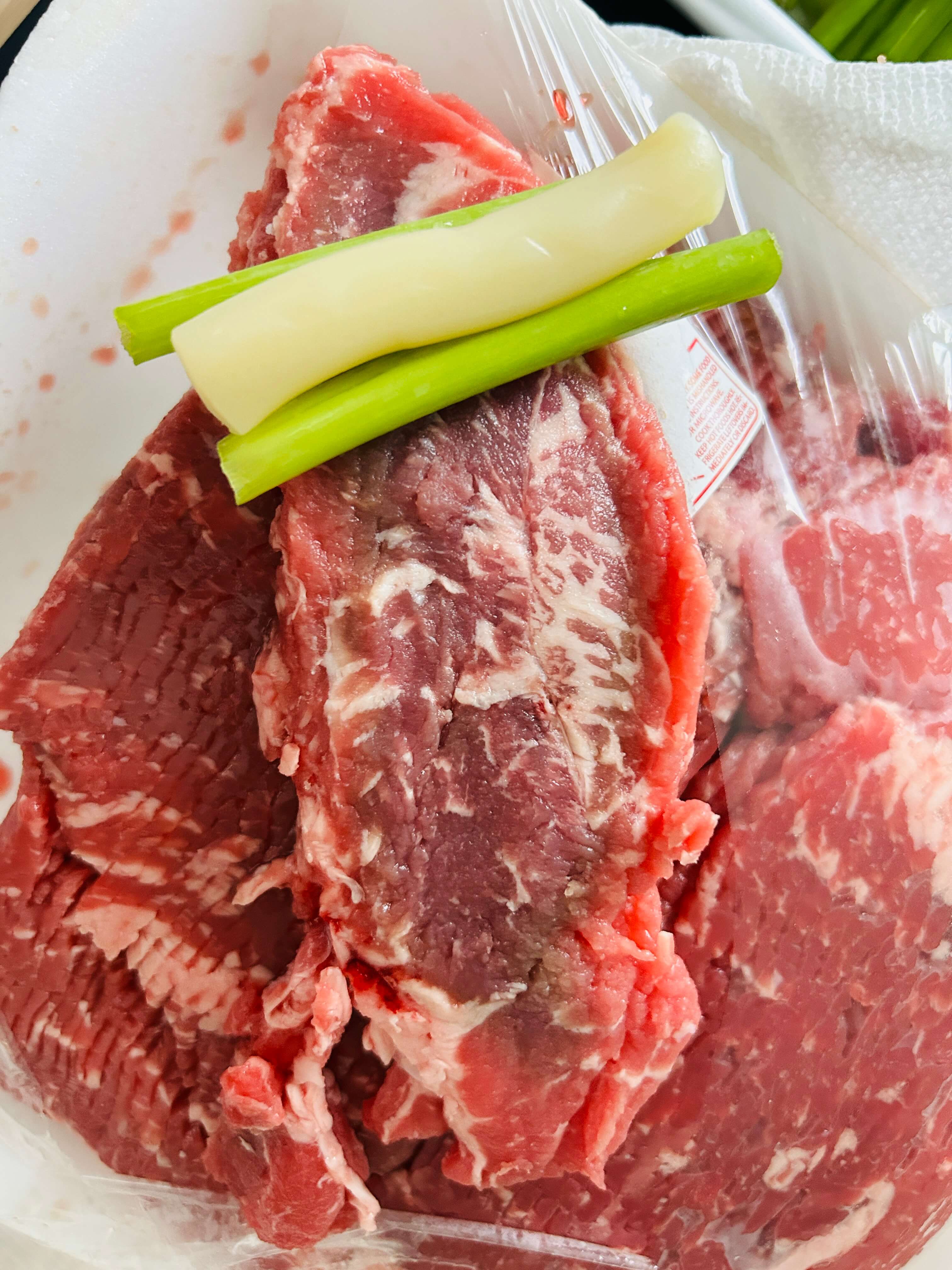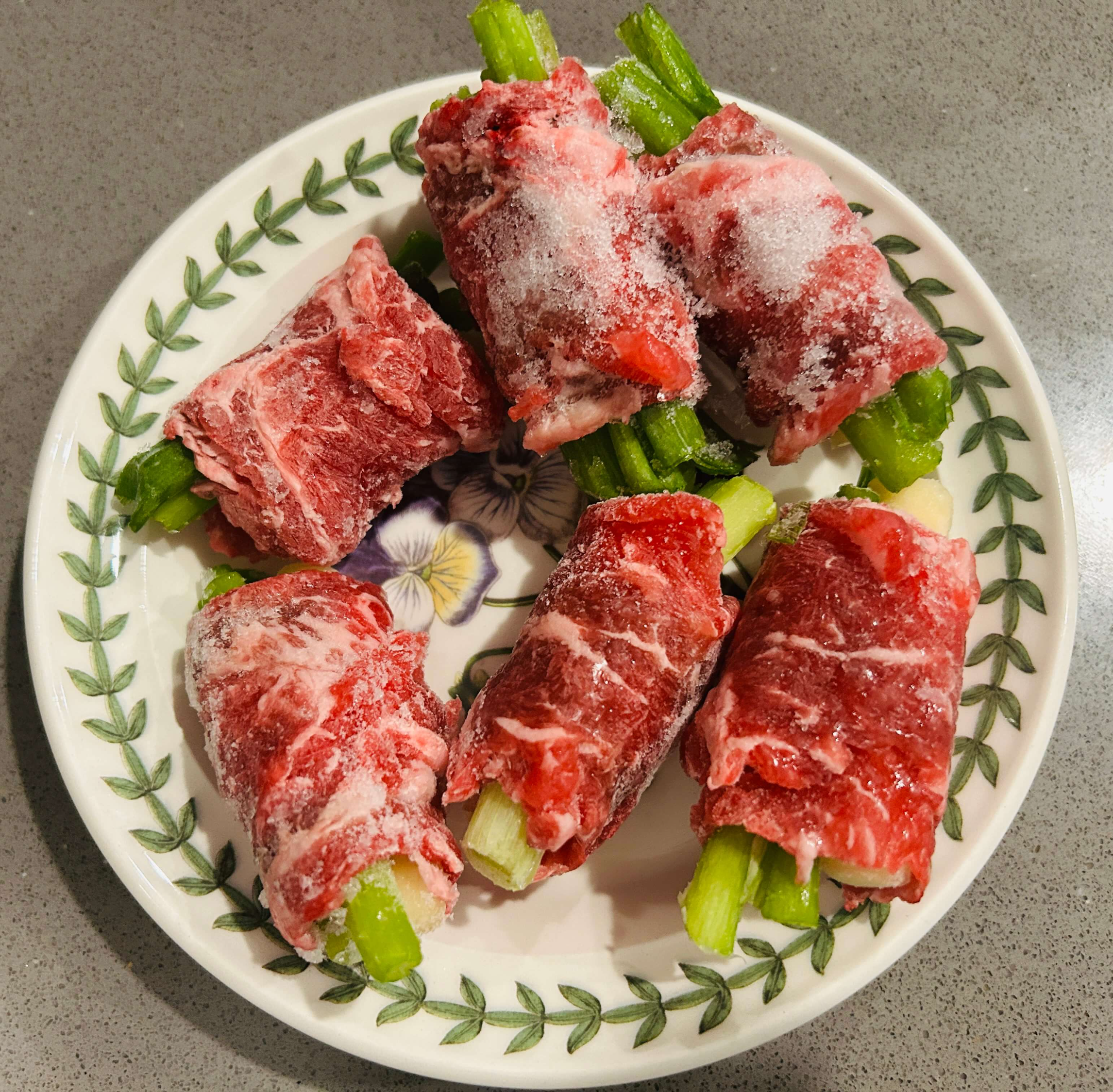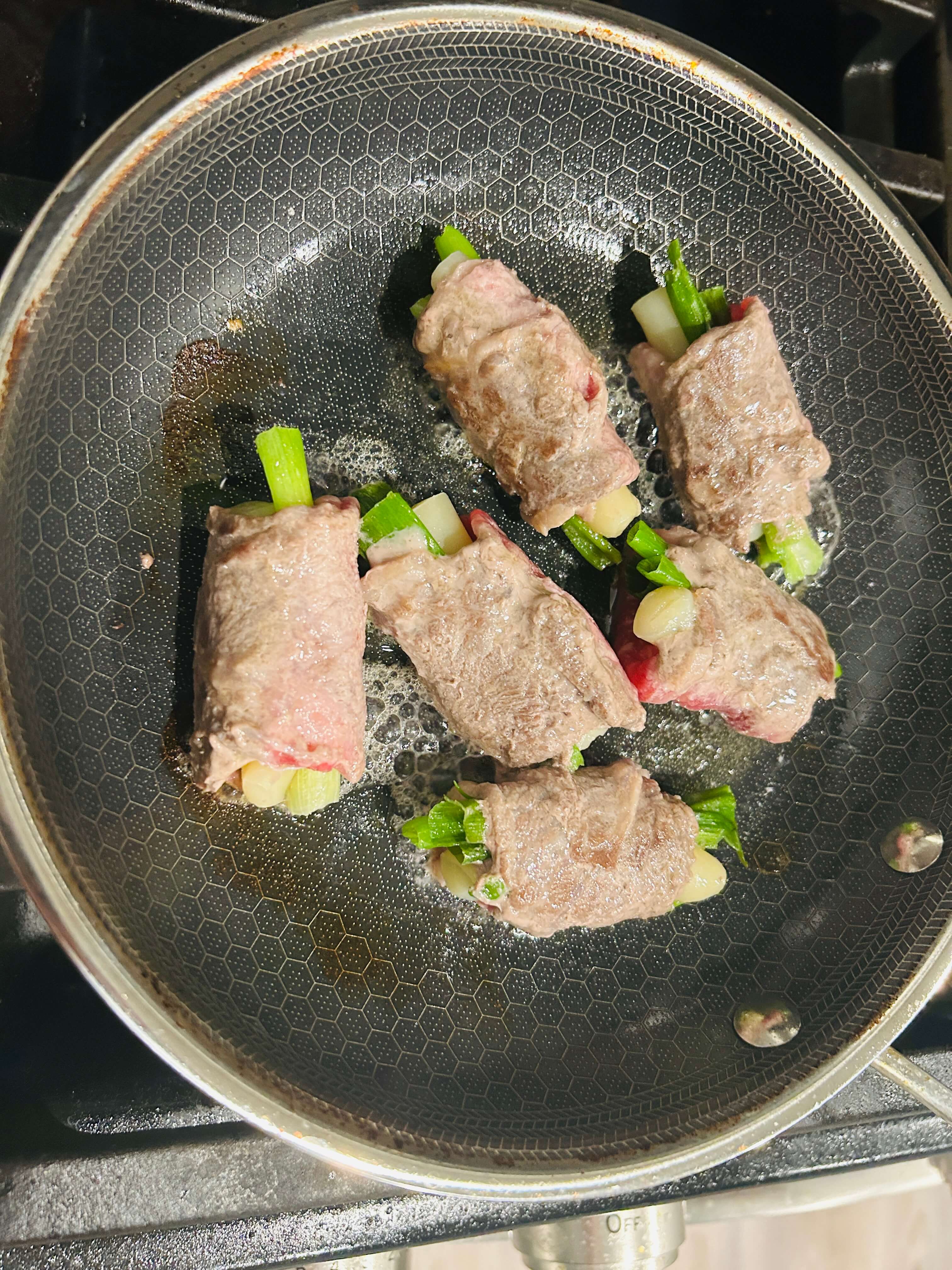 2. 얇은 고기에 쪽파, 밀떡을 넣고 돌돌 말아 줍니다.