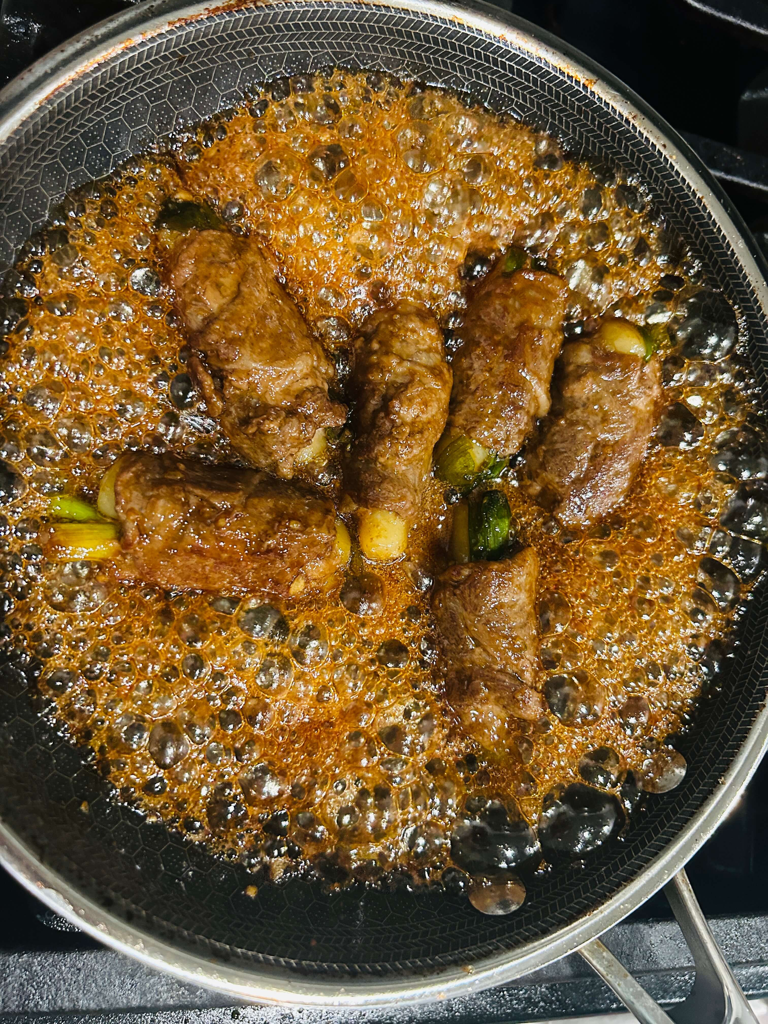 8. 잘 구워진 고기에 소스를 넣어 소스가 잘 베도록 한번 끓여줍니다.