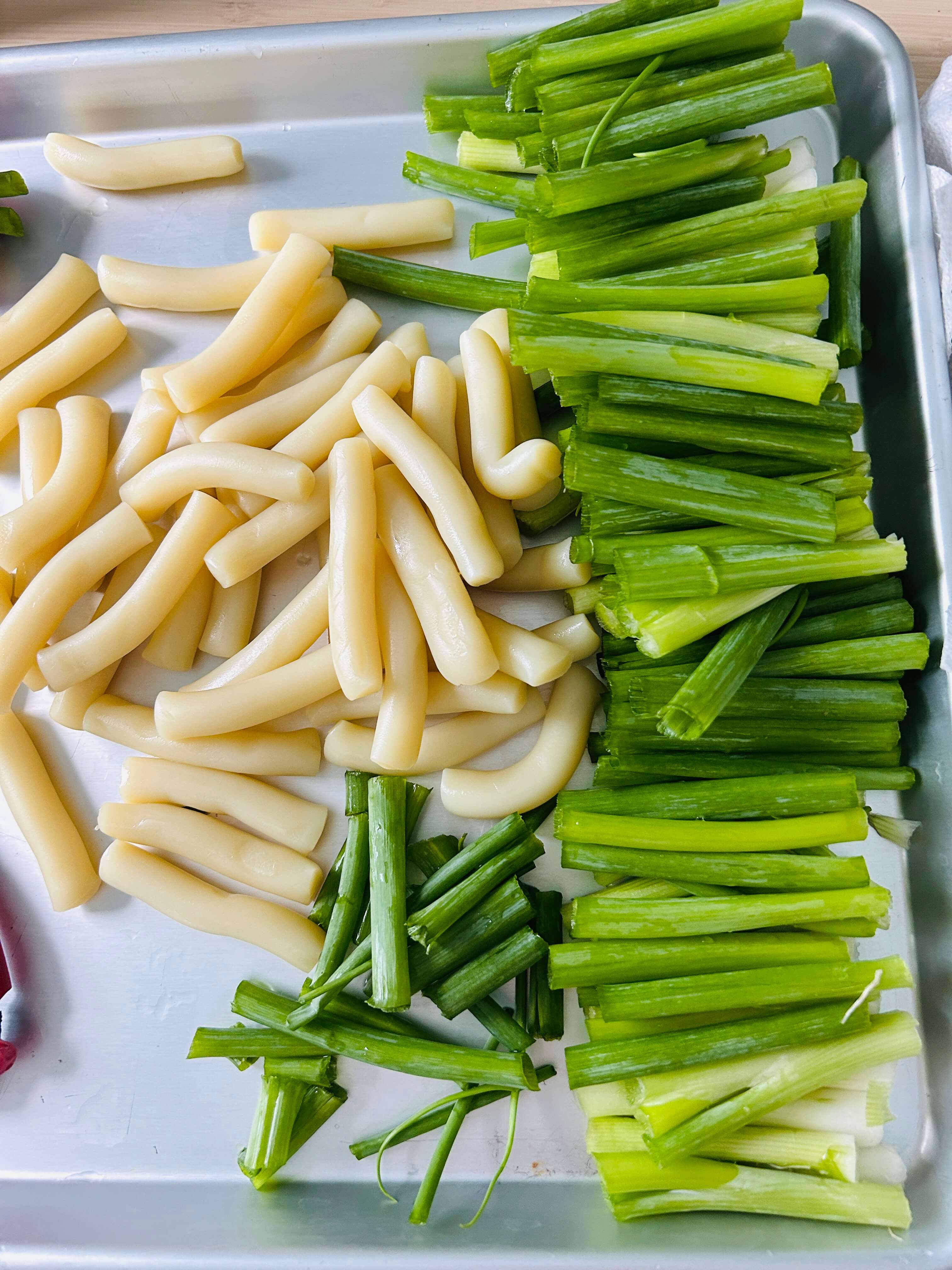 1. 쪽파, 밀떡, 고기를 준비해 줍니다.