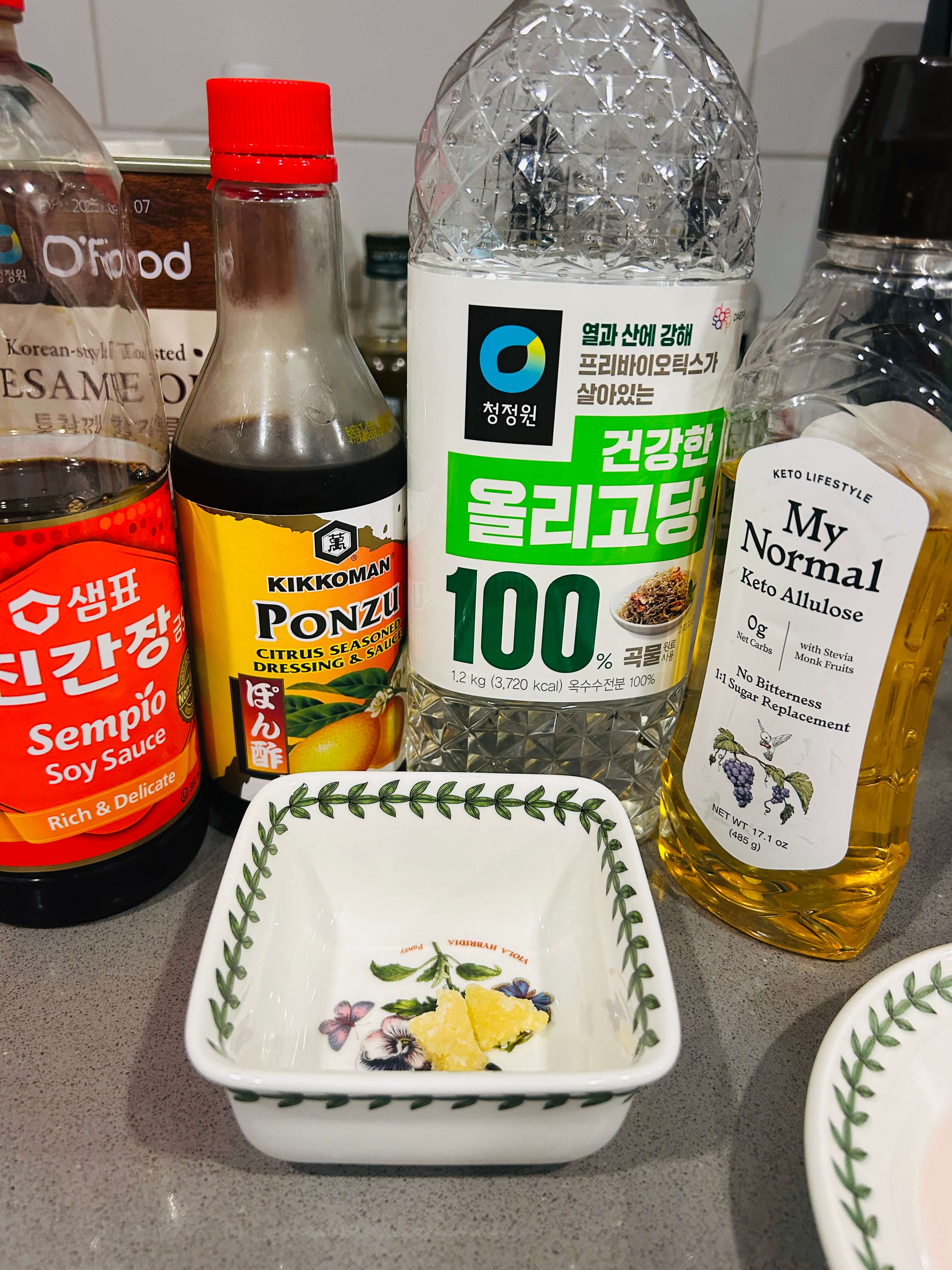 6. 소스로 간장, 폰즈, 올리고당, 알룰로스, 간 마늘을 준비해 줍니다.