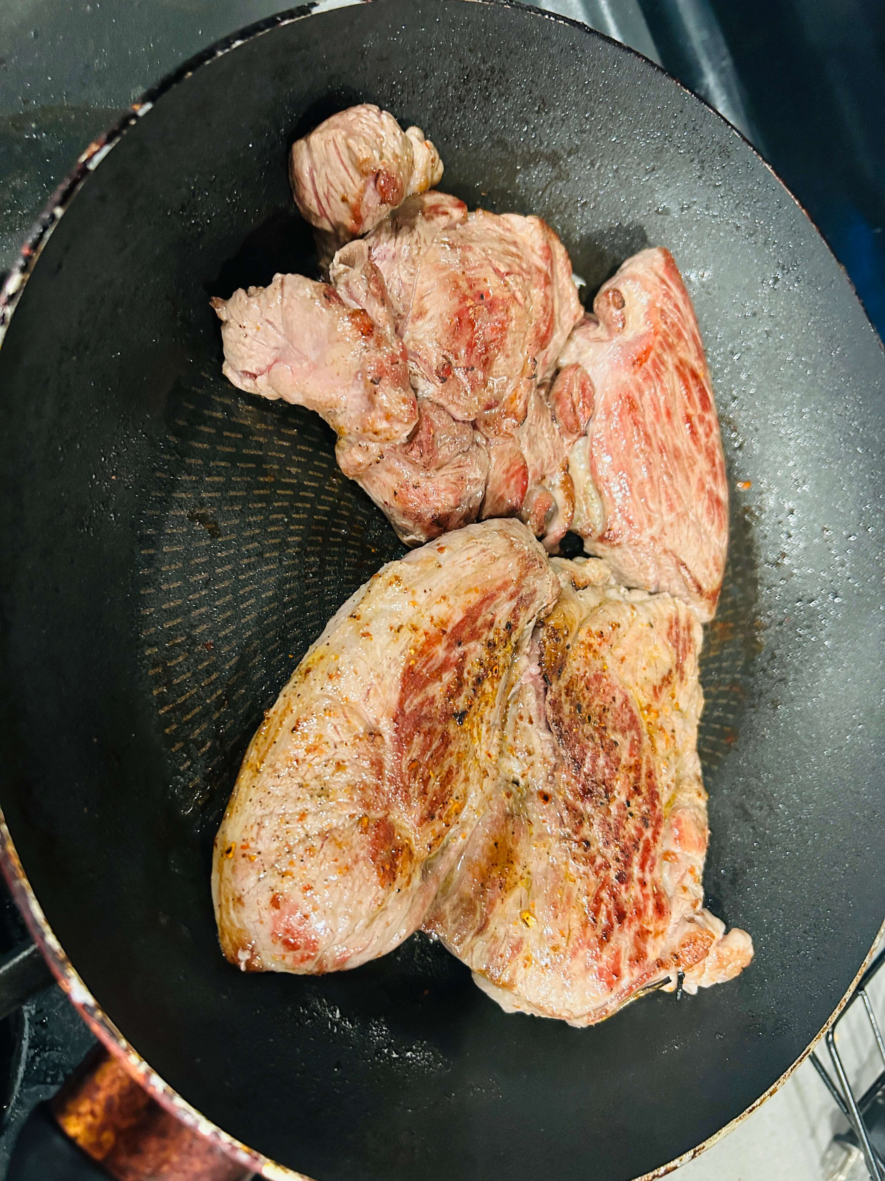 10. 숙성된 양고기를 프라이팬에 올려 구워줍니다.